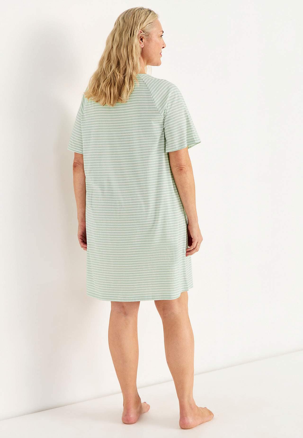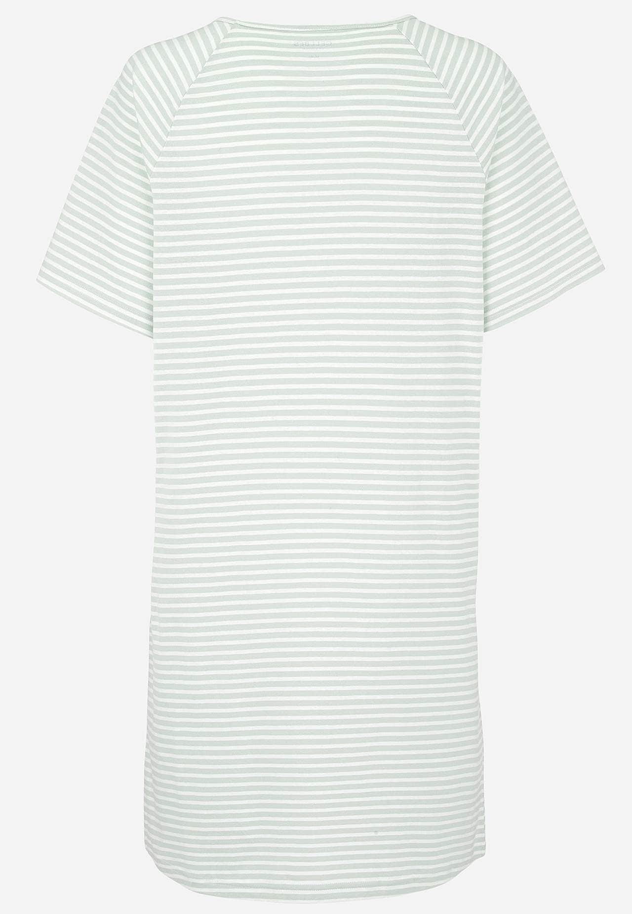 Pehmest orgaanilisest puuvillast lühike öösärk. Avar, kergelt A-lõikeline tegumood. Triibuline mudel. Ümar kaelus. Lühikesed raglaanvarrukad. Kergelt kaarjas alläär. Pikkus õlast vastavalt suurusele u 95-108 cm.