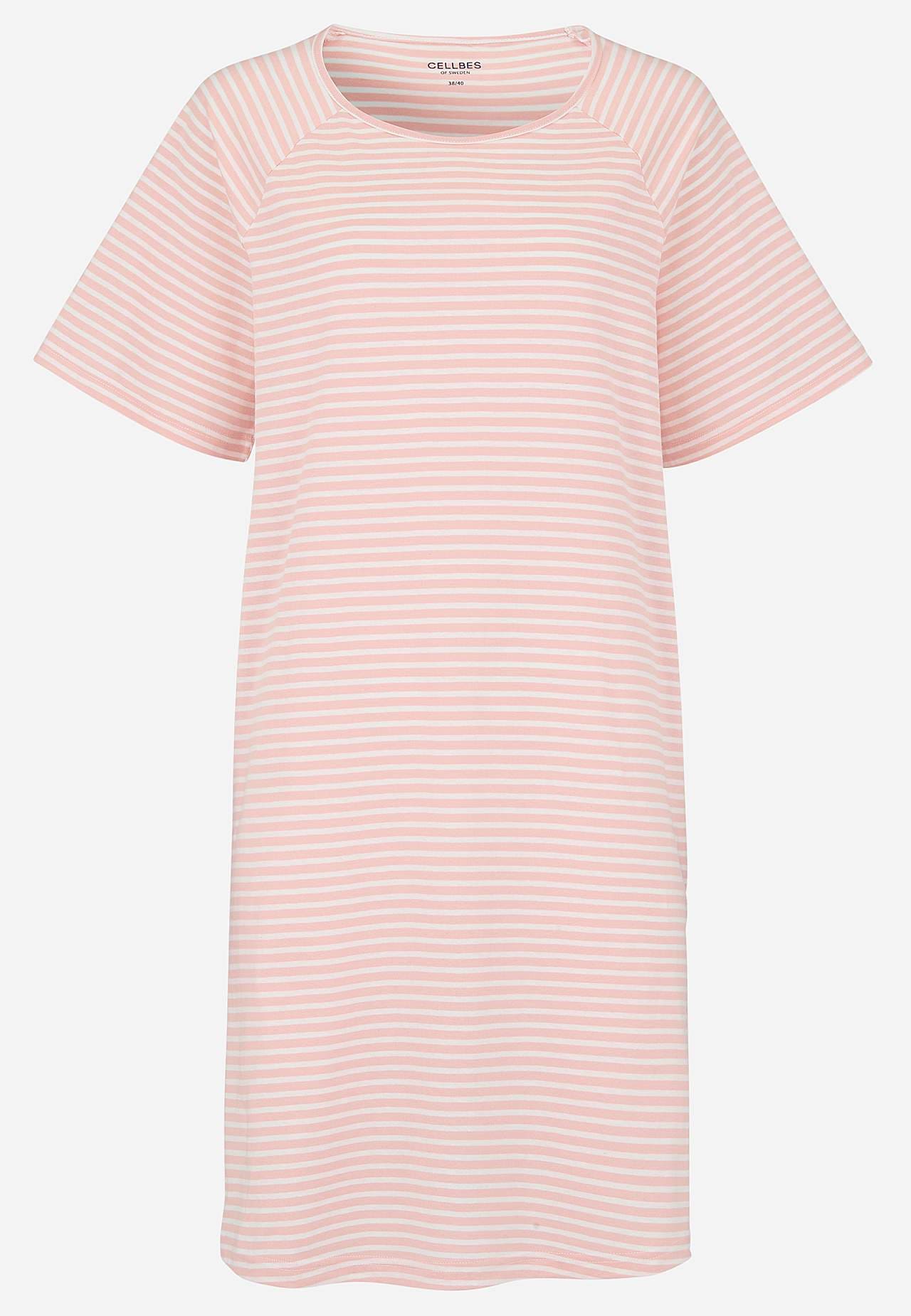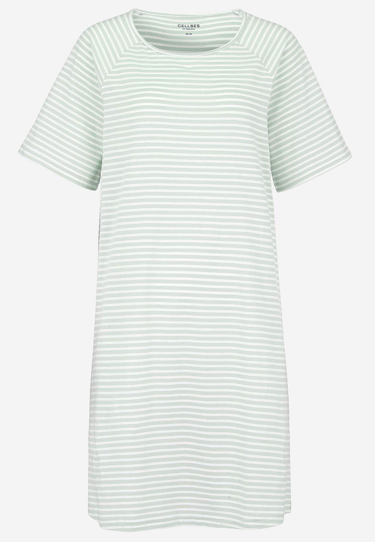 Pehmest orgaanilisest puuvillast lühike öösärk. Avar, kergelt A-lõikeline tegumood. Triibuline mudel. Ümar kaelus. Lühikesed raglaanvarrukad. Kergelt kaarjas alläär. Pikkus õlast vastavalt suurusele u 95-108 cm.