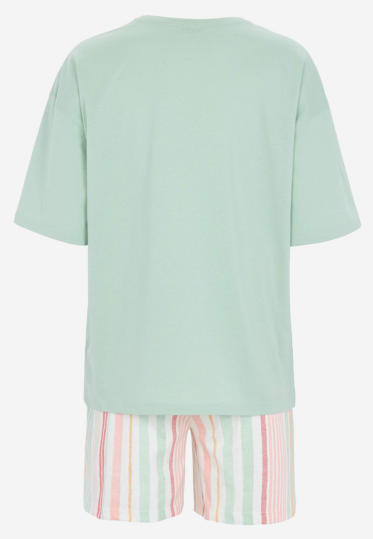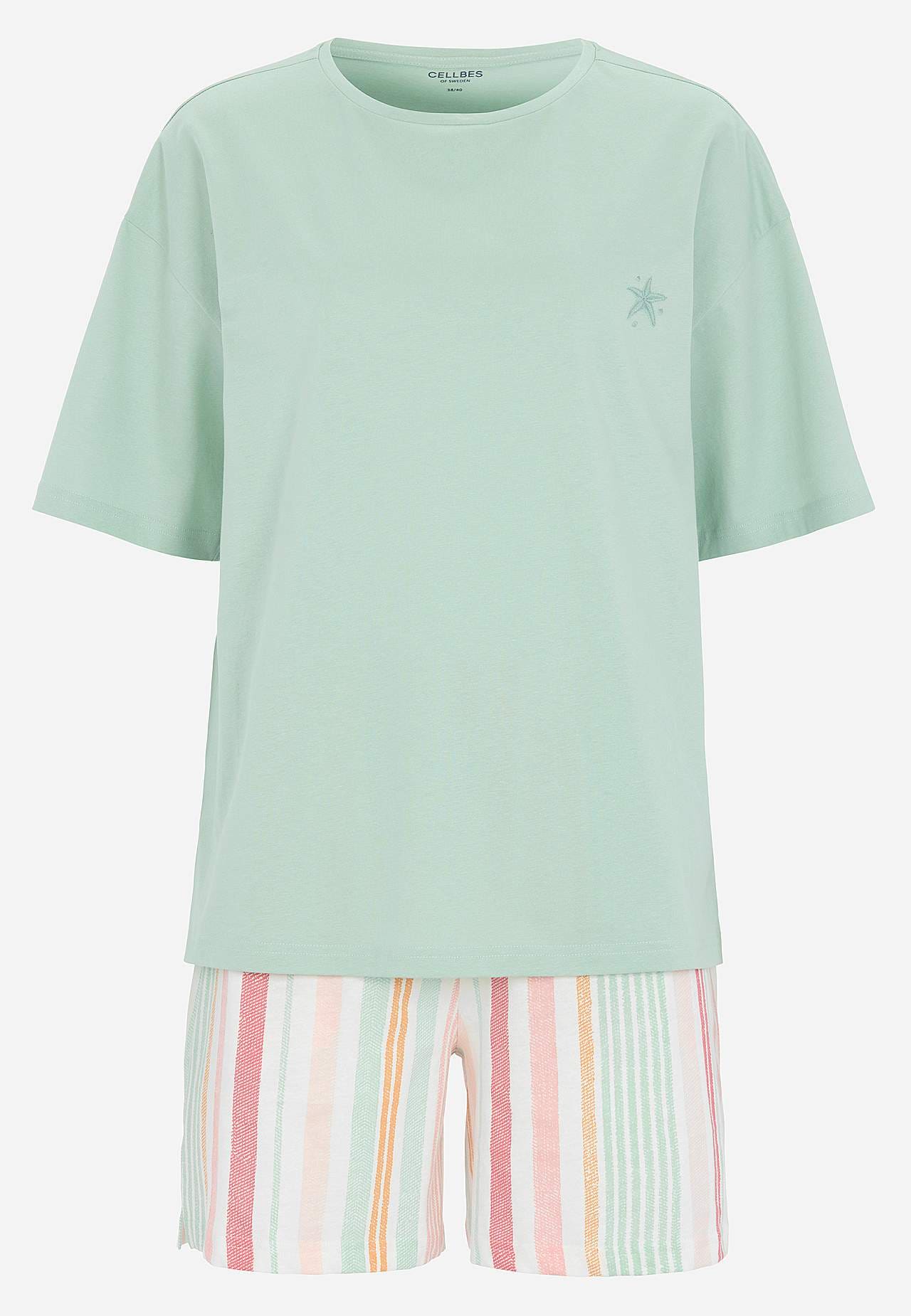 Lühikeste varrukatega topist ja lühikestest pükstest koosnev pidžaamakomplekt. Pehmest orgaanilisest puuvillast. Tavasuurus. Ülemine osa: kergelt pikendatud õlaosaga T-särk. Vasakul küljel väike sobivas toonis tikanddetail. Lühikesed varrukad. Sirge alläär, külgedel lõhikud. Selja pikkus vastavalt suurusele u 63-73 cm. Alum... Loe rohkem