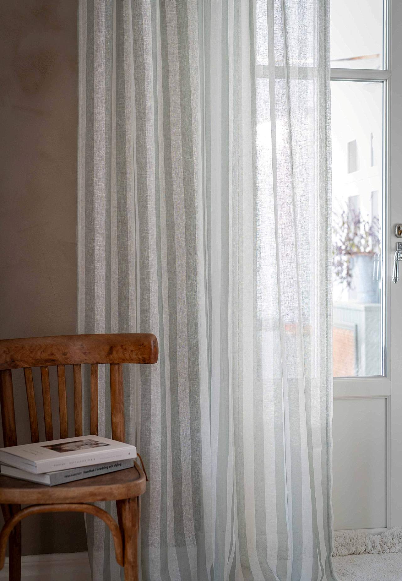 Digitaalselt trükitud triipudega kardinad. Kauni langevusega ja sissekootud peenete niitidega õhuline materjal. Laseb hästi valgust läbi. Trükk on tagaküljel selgelt nähtav. Overlokitud alläär.