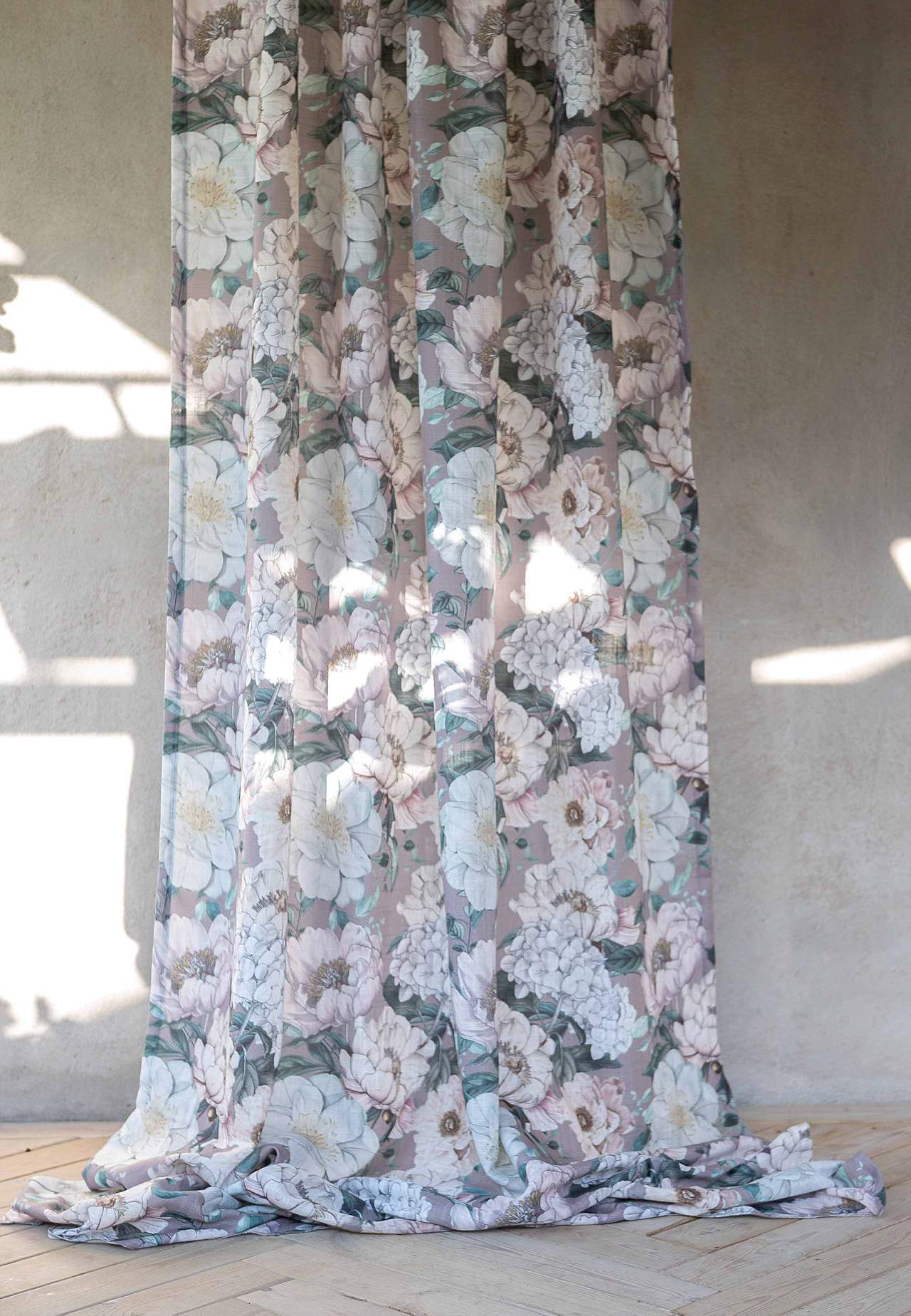 Kaunite pojengidega kardinad. Hästilangev materjal. Sissekootud peenikesed niidid annavad kangale kauni struktuuri. Hea valguse läbilaskvus. Trükk on tagaküljel selgelt nähtav.