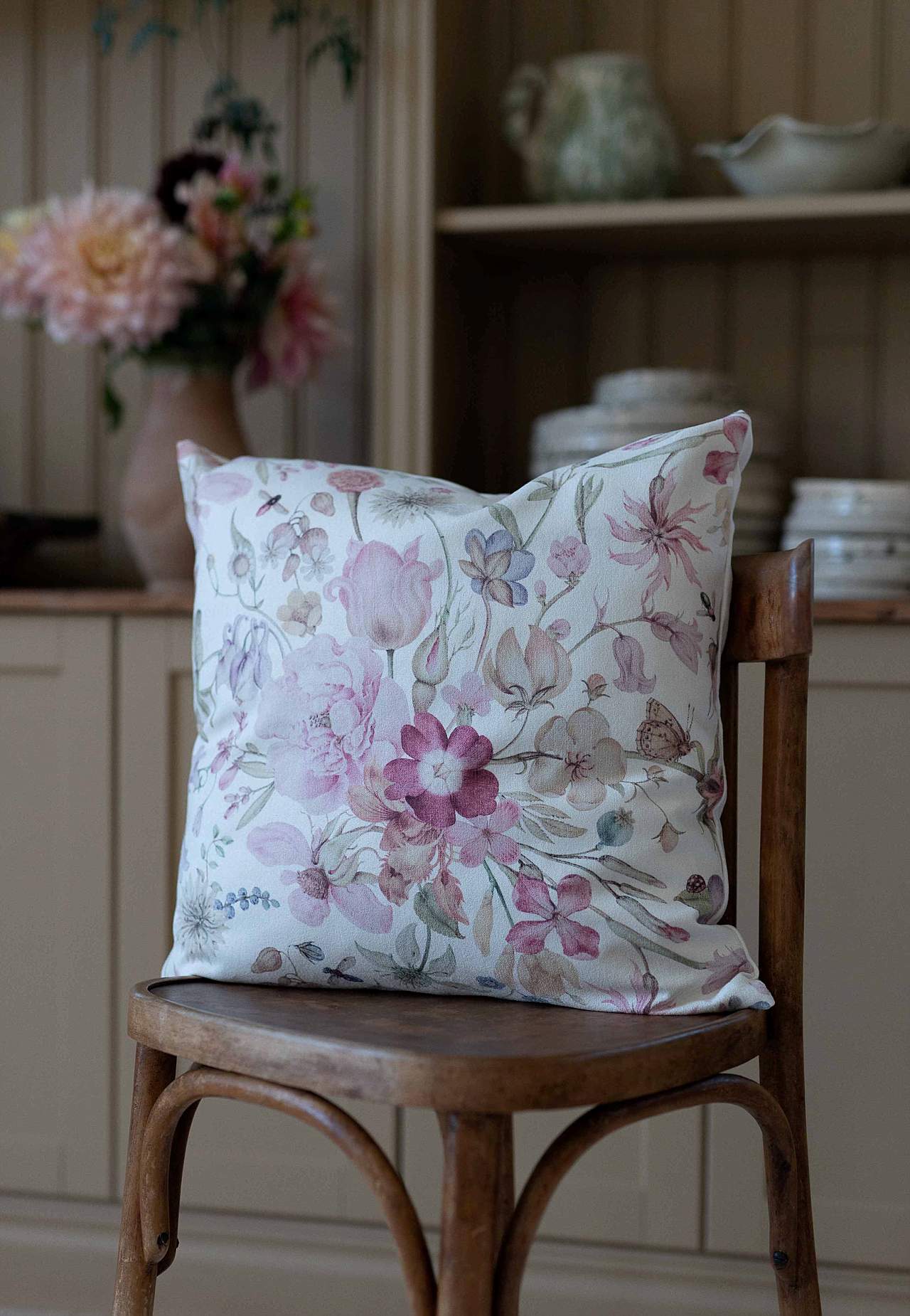 Padjapüür lillede ja liblikatega. Mati viimistlusega sametine materjal. Ühevärviline tagakülg. Tõmblukk küljel. Mõõt: 48x48 cm.
