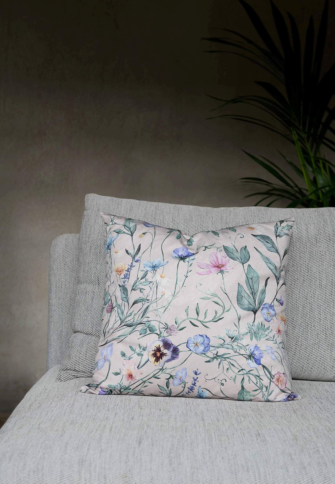 Romantiliste lillede, lehtede ja vartega padjakate. Pehmest sametist polüesterkangas. Mõlemal pool sama muster. Küljel tõmblukk. Mõõdud: 45x45 cm.