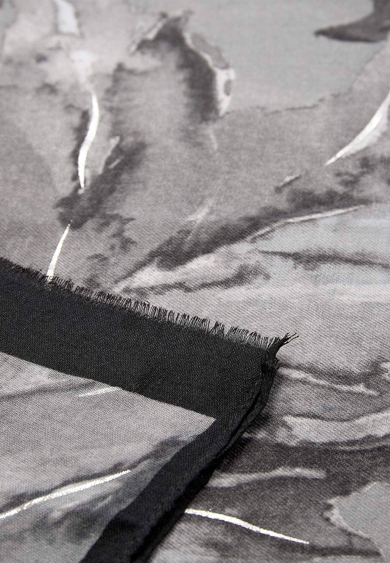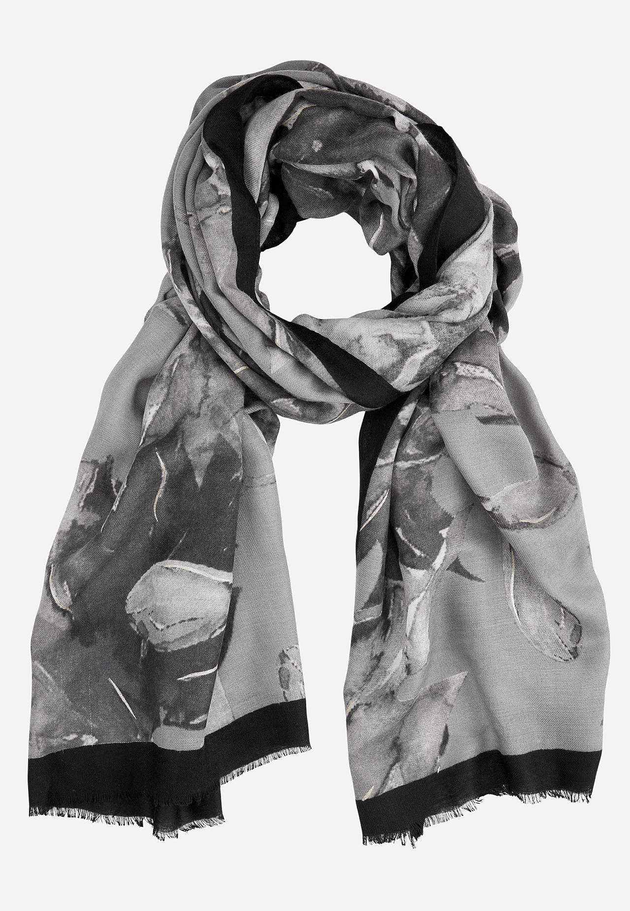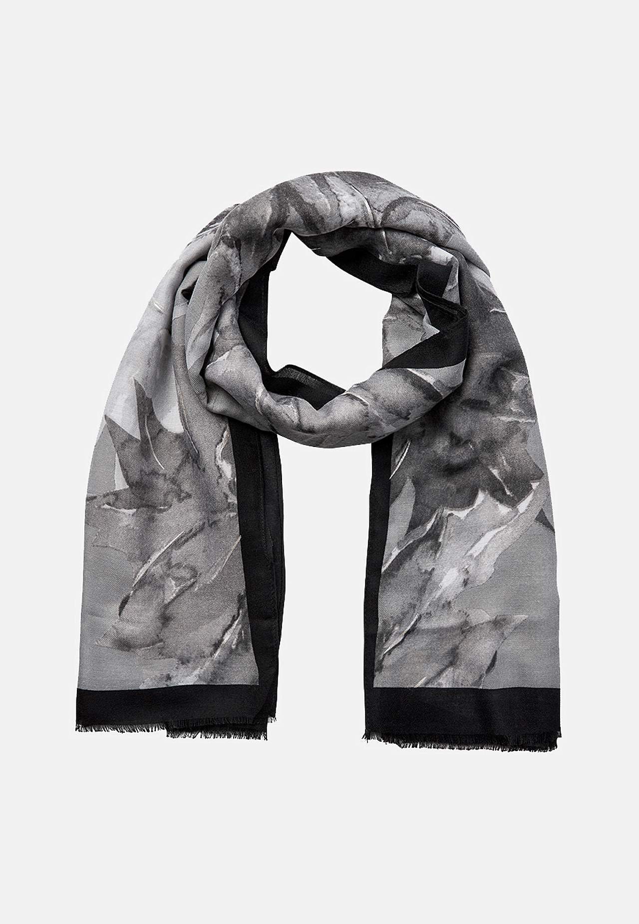 Soe ja stiilne aksessuaar. Abstraktse mustriga pehme, õhuke tuubsall. Ristkülikukujuline mudel. Lühikestel külgedel narmastega äär.