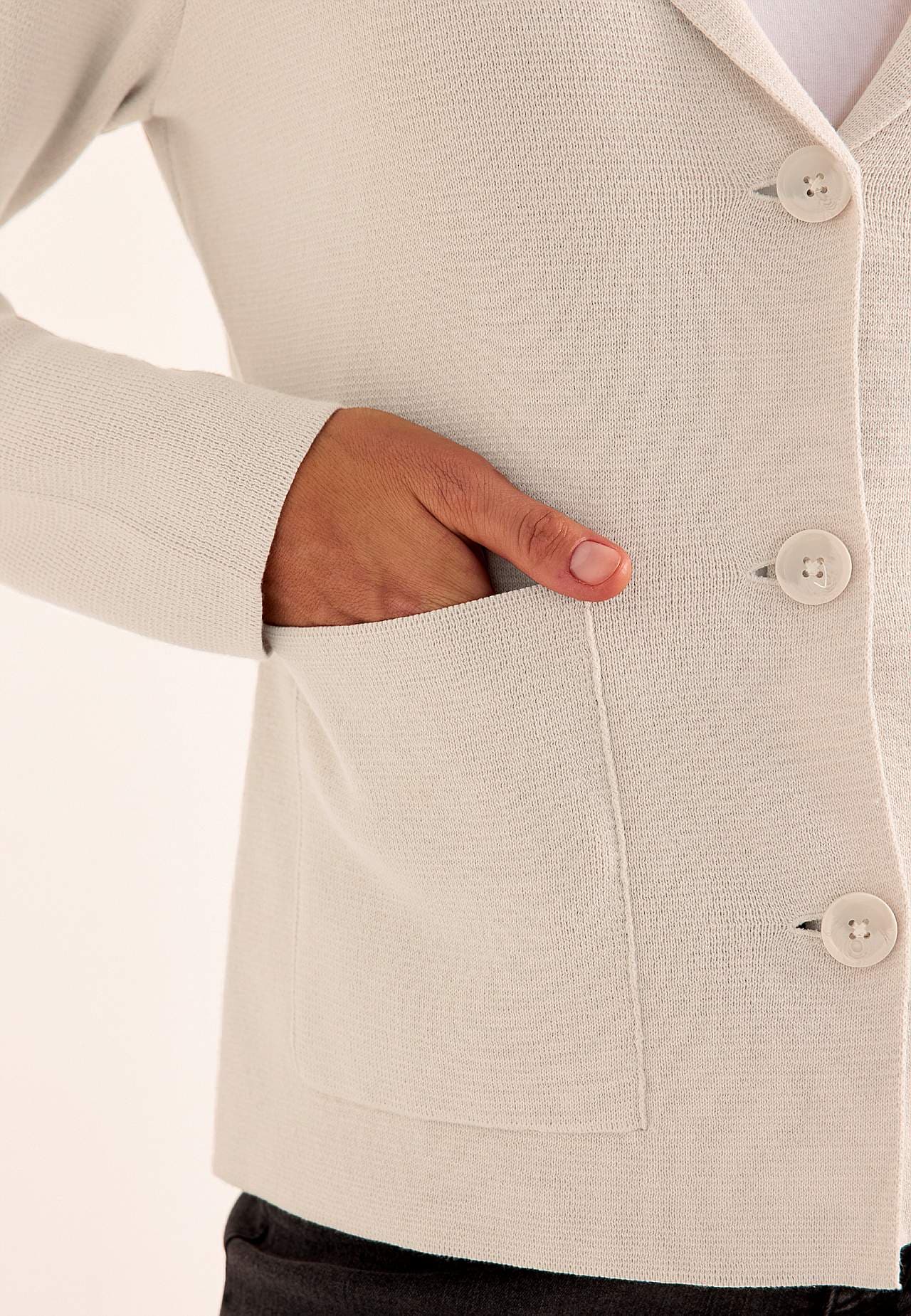 Paksemast pehmest puuvillasest materjalist peenkoes kardigan. Kergelt figuuri järgiv mudel. Puhas ja stiilne disain, mis sobib aastaringselt kandmiseks. Kolm suurt nööpi. Ees taskud. Pikad varrukad. Pikkus õlast vastavalt suurusele: u 61-70 cm.