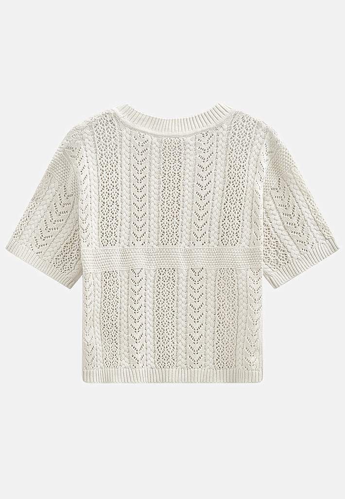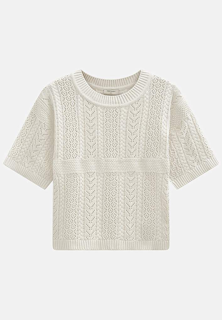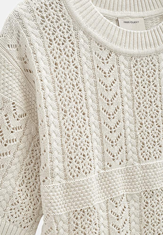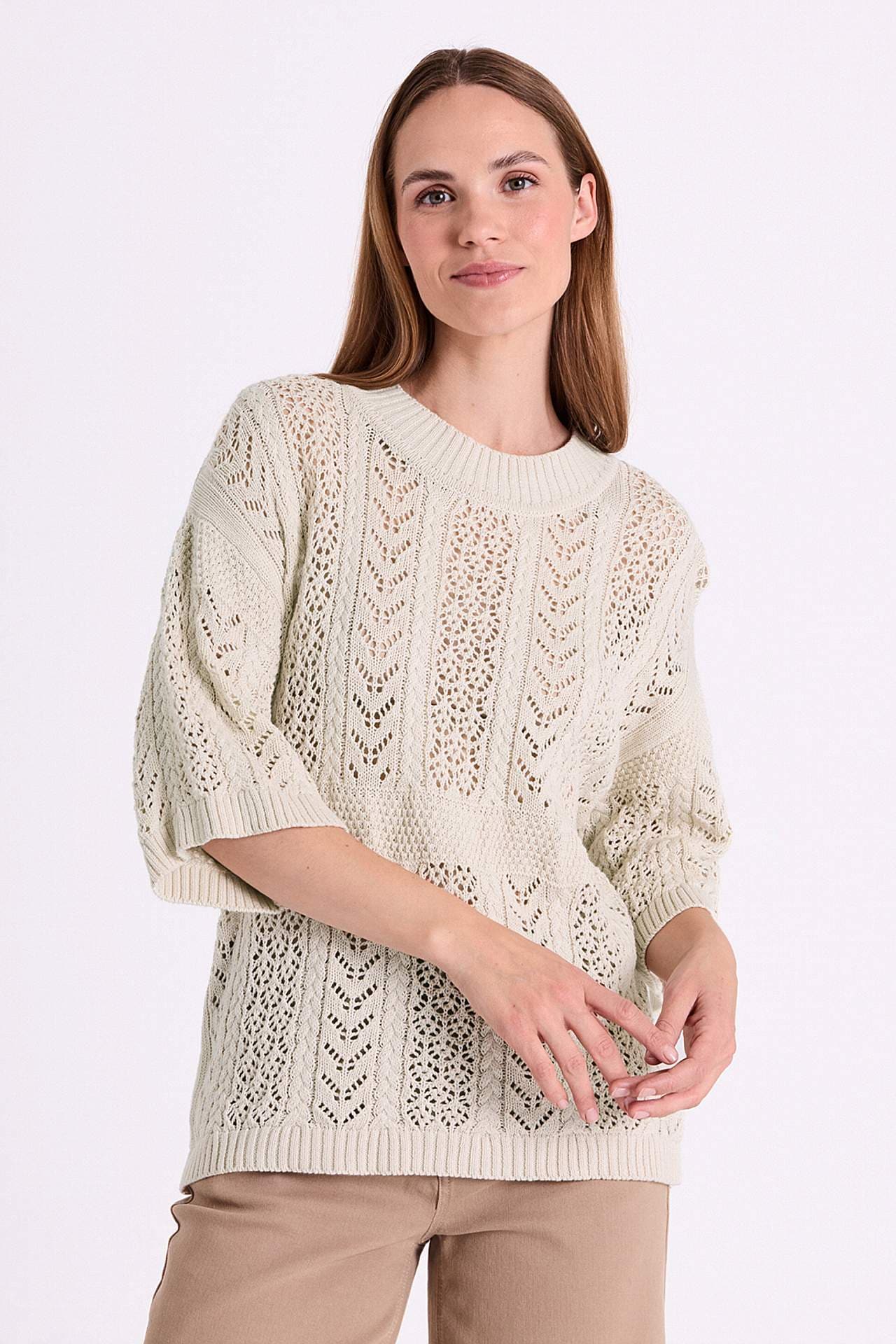 Kauni pitsilise mustriga, orgaanilisest puuvillast pehme džemper. Sama muster ees ja taga. Suurepärane kanda topi või särgiku peal. Avaram mudel. Soonikkoes äärega ümar kaelus. 3/4 pikkuses varrukate otstes soonikkoes kätised. Soonikkoes alläär. Pikkus õlast u 53 cm suurusel M (40).