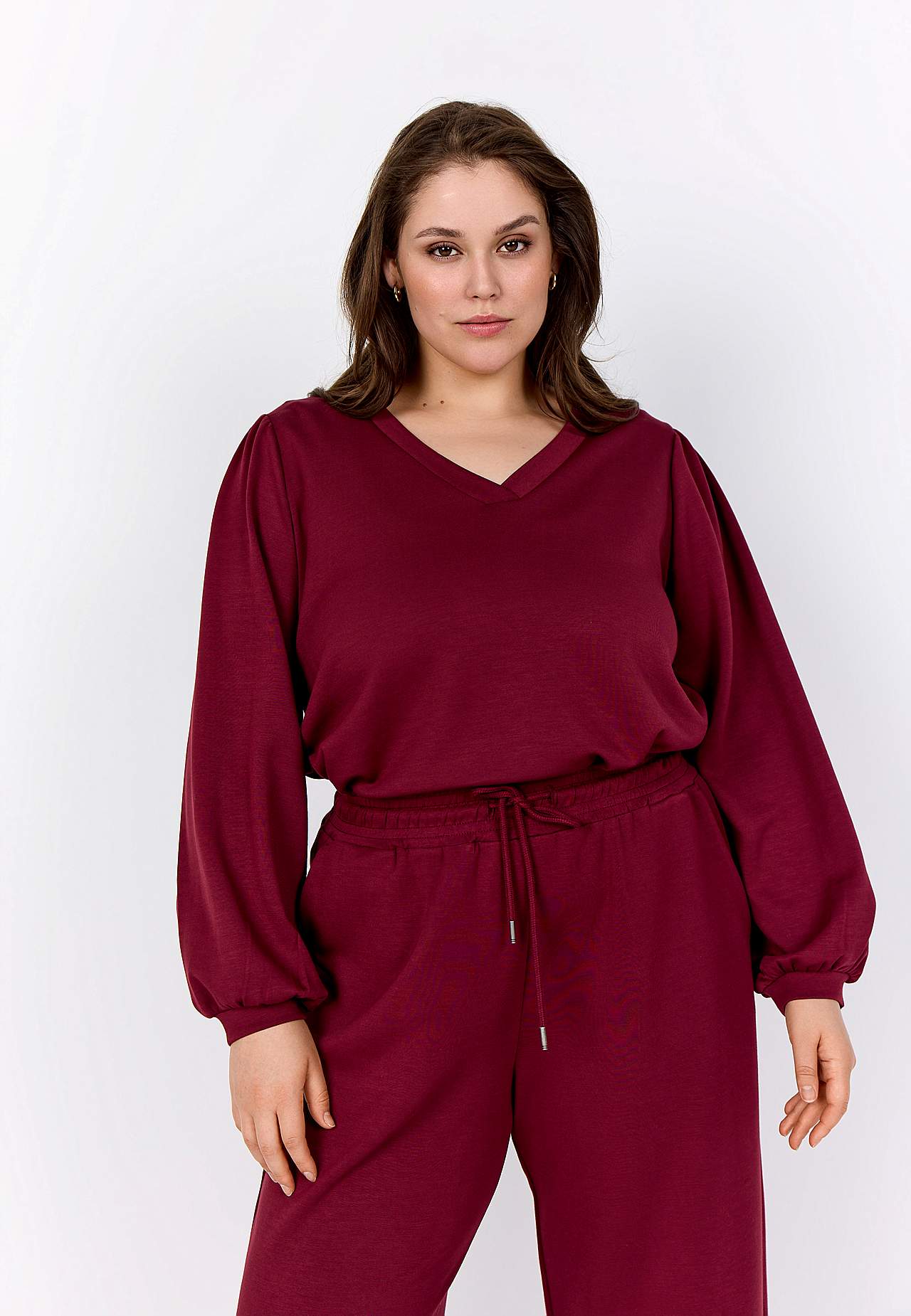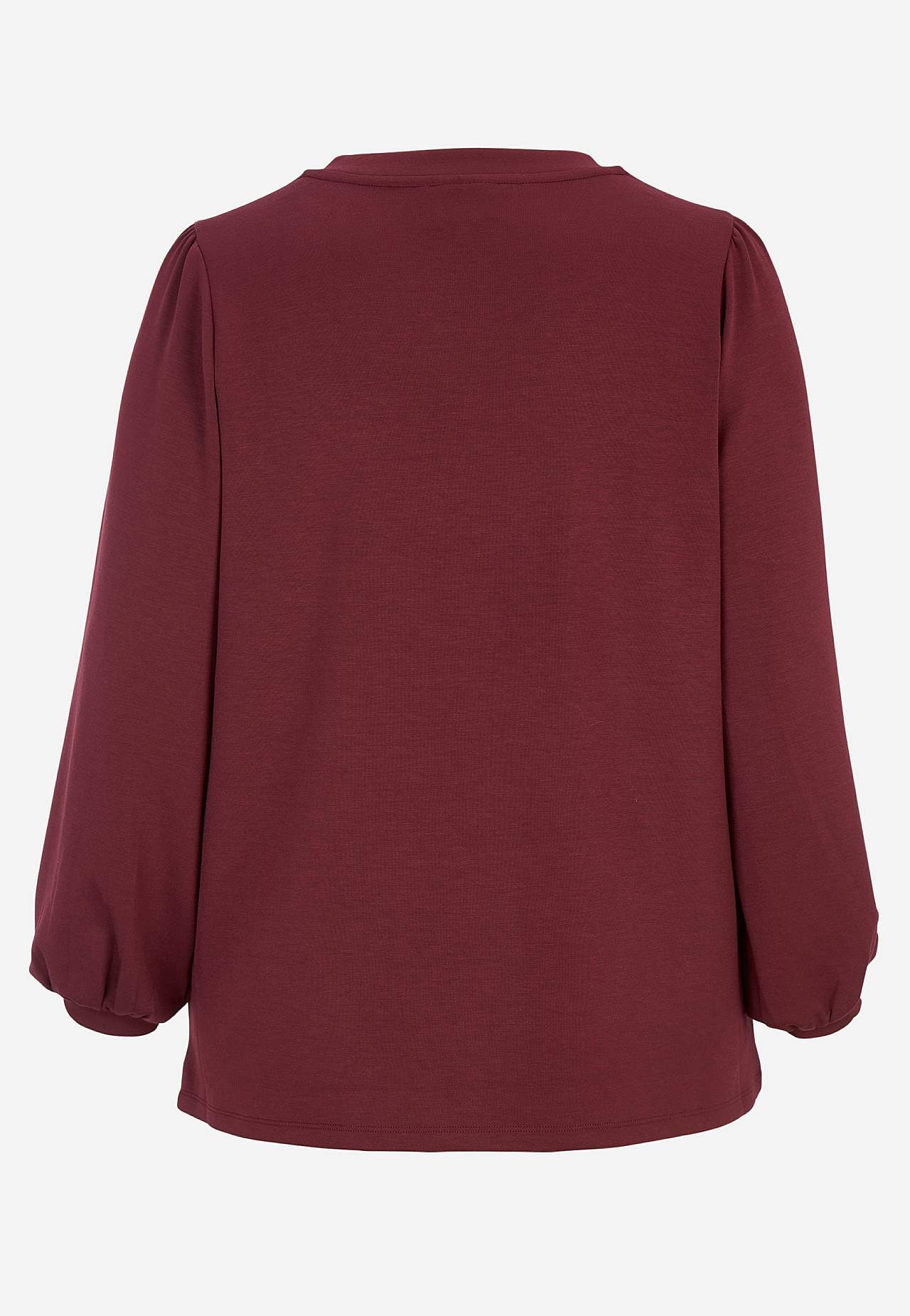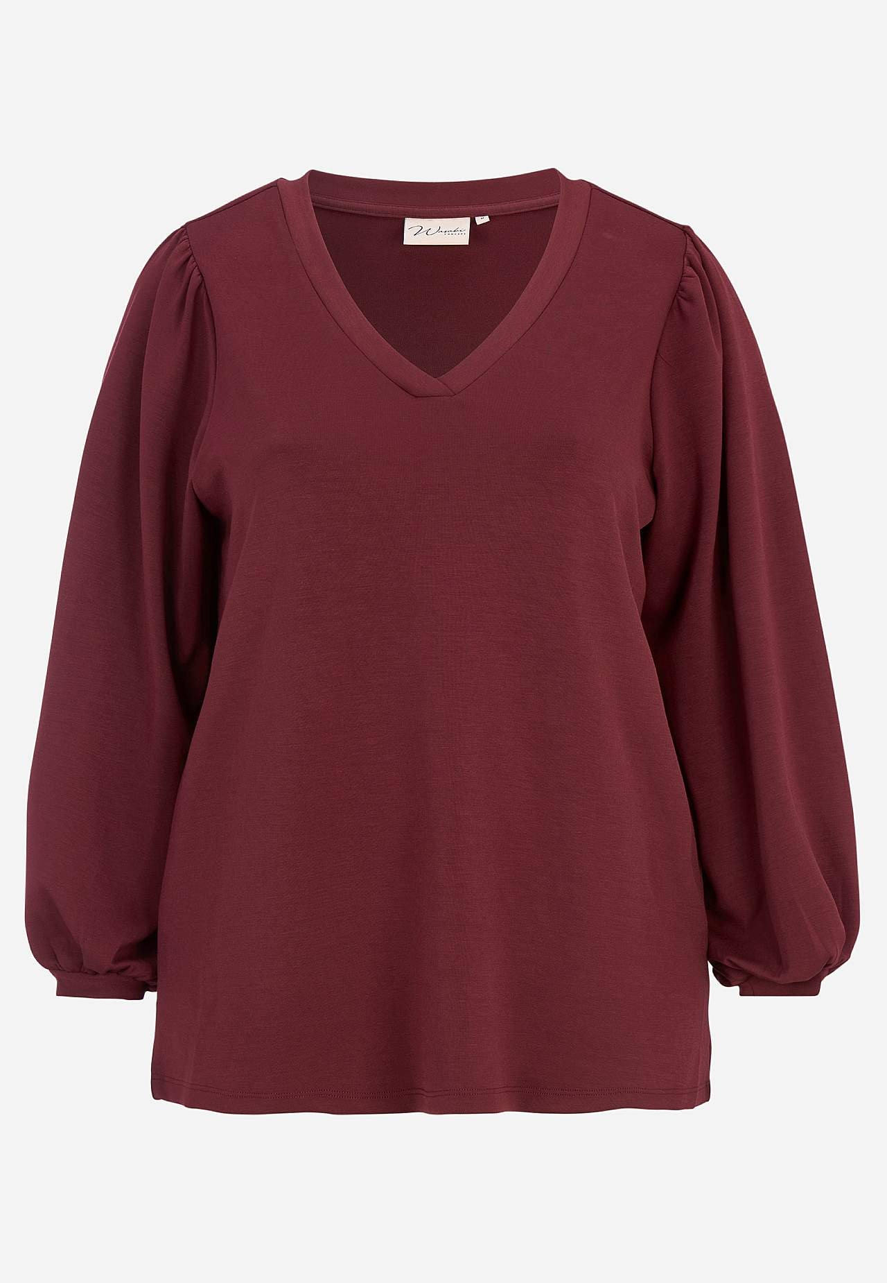 Siidpehmest ja veidi paksemast modaalsegusest materjalist topp. Avar lõige. V-kaelus. Õlgadel krooked. Pikkade laiade varrukate otstes kitsad kätised. Sirge alläär. Pikkus suurusel M (46/48) umbes 72 cm.