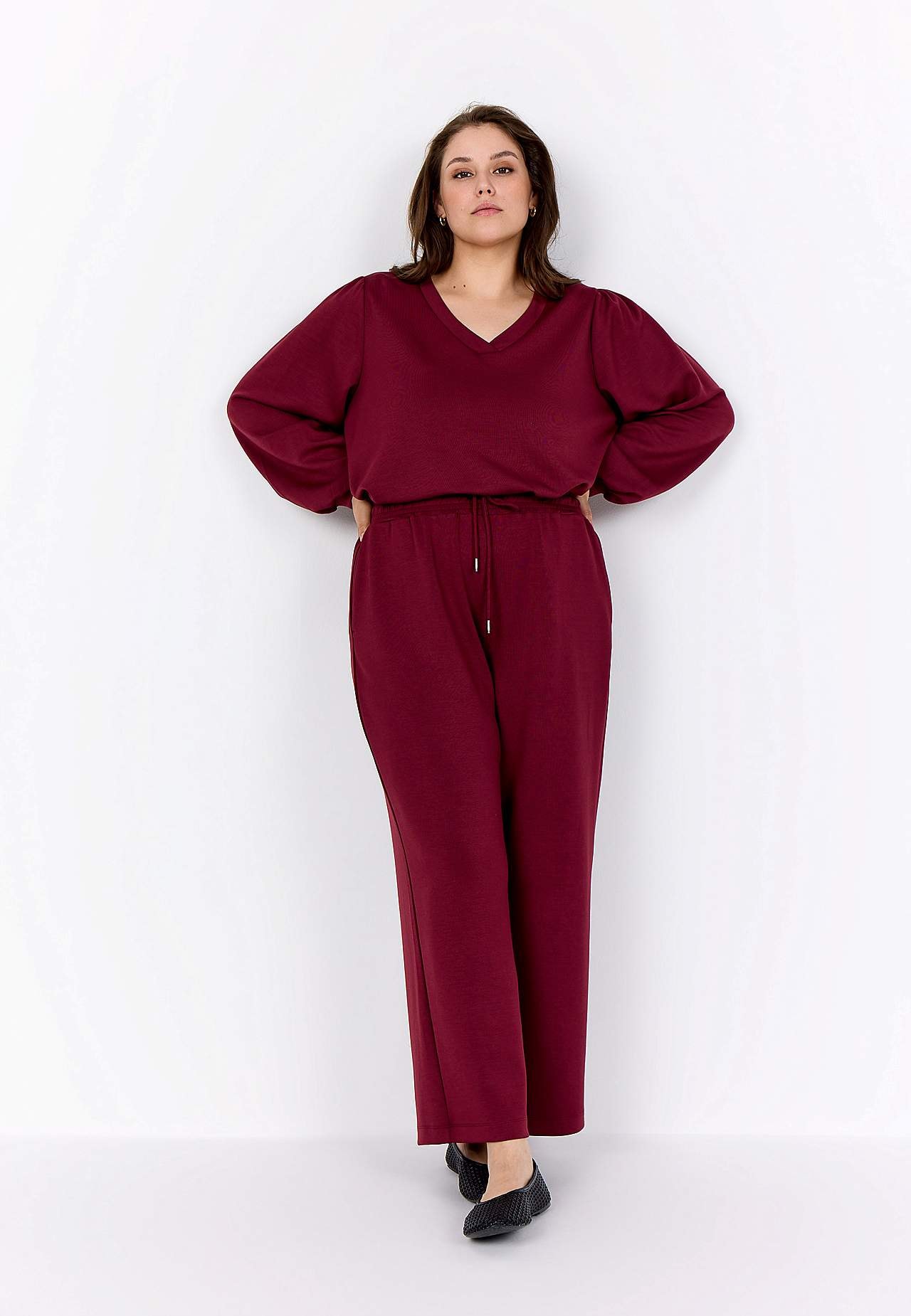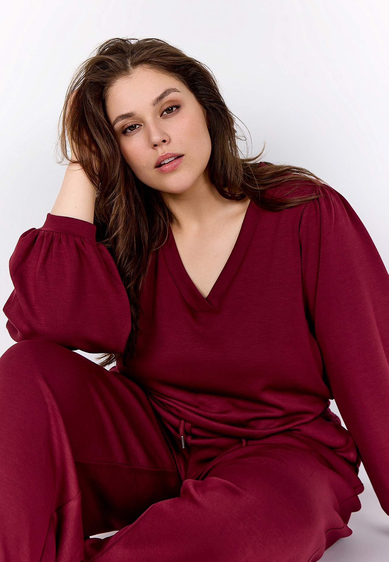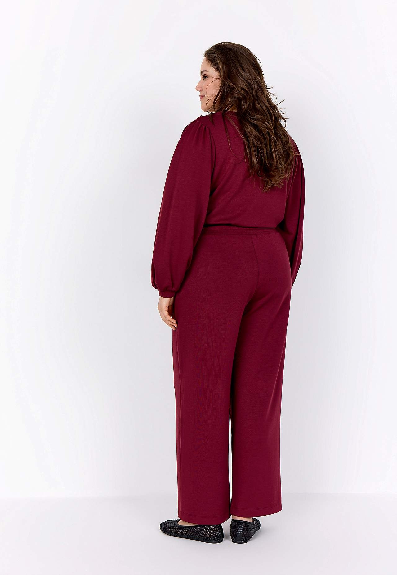 Siidpehmest ja veidi paksemast modaalsegusest materjalist topp. Avar lõige. V-kaelus. Õlgadel krooked. Pikkade laiade varrukate otstes kitsad kätised. Sirge alläär. Pikkus suurusel M (46/48) umbes 72 cm.