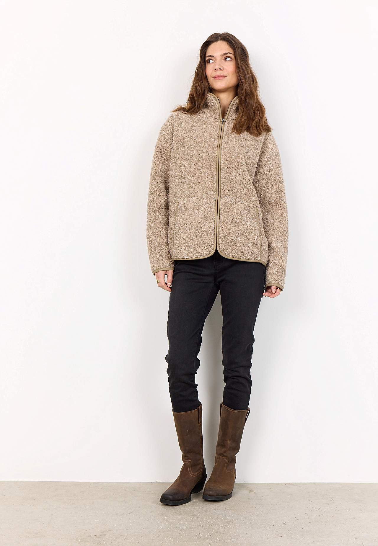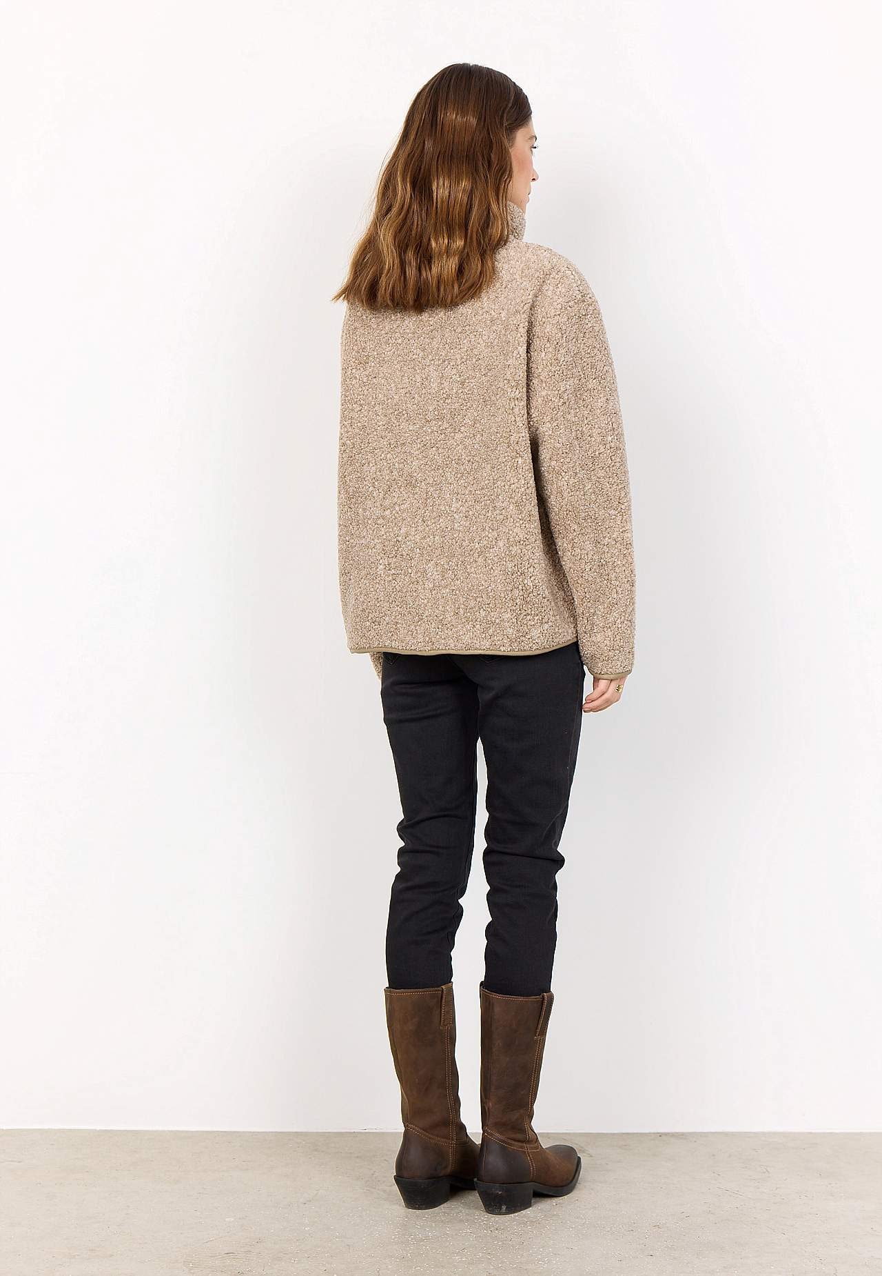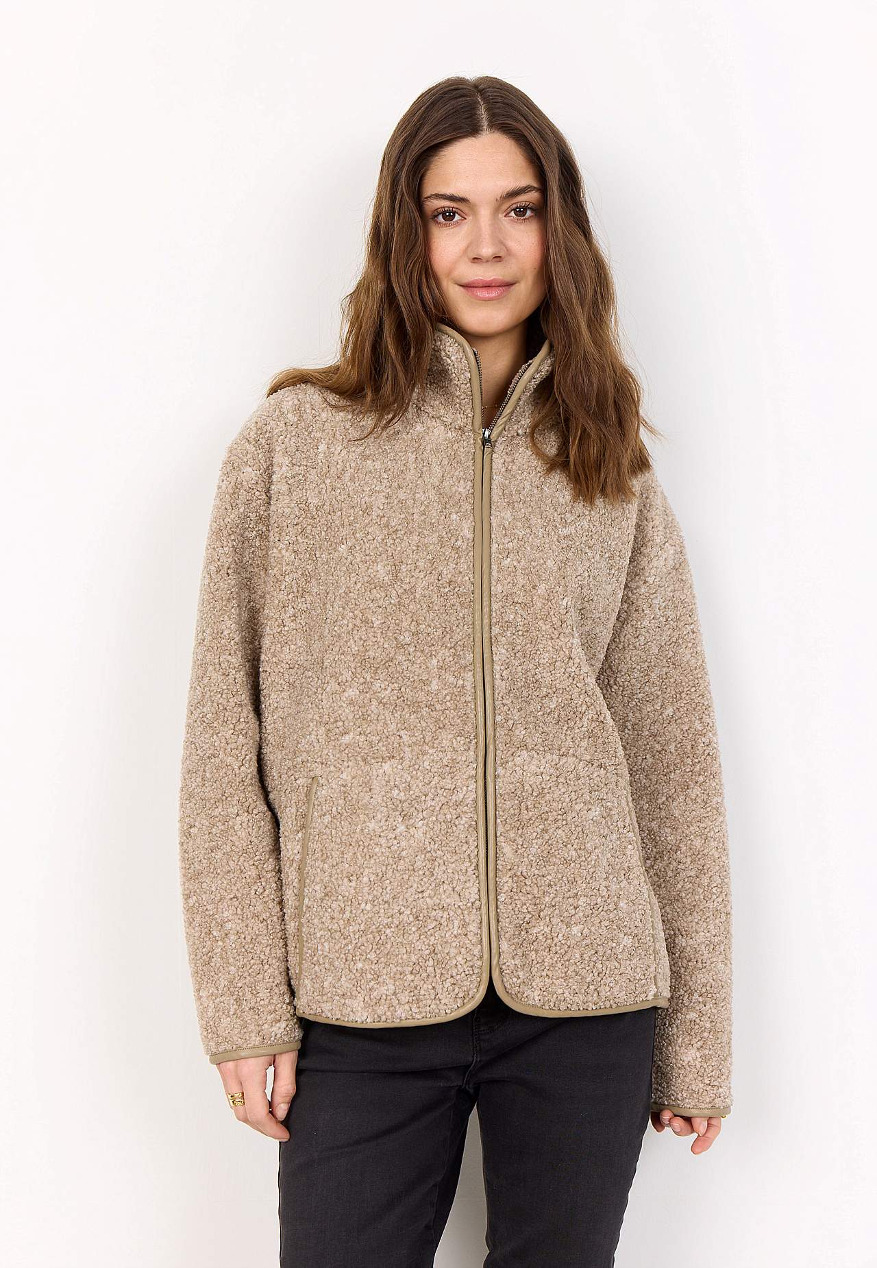 Ülipehme fliisjakk. Avar lõige. Mugav püstine krae. Pikendatud õlaosa. Tõmblukk-kinnis. Pehme voodriga taskud. Pikad varrukad kanditud ääristega. Kergelt kaarjas kanditud alläär. Pikkus u 62 cm suurusel M (40).