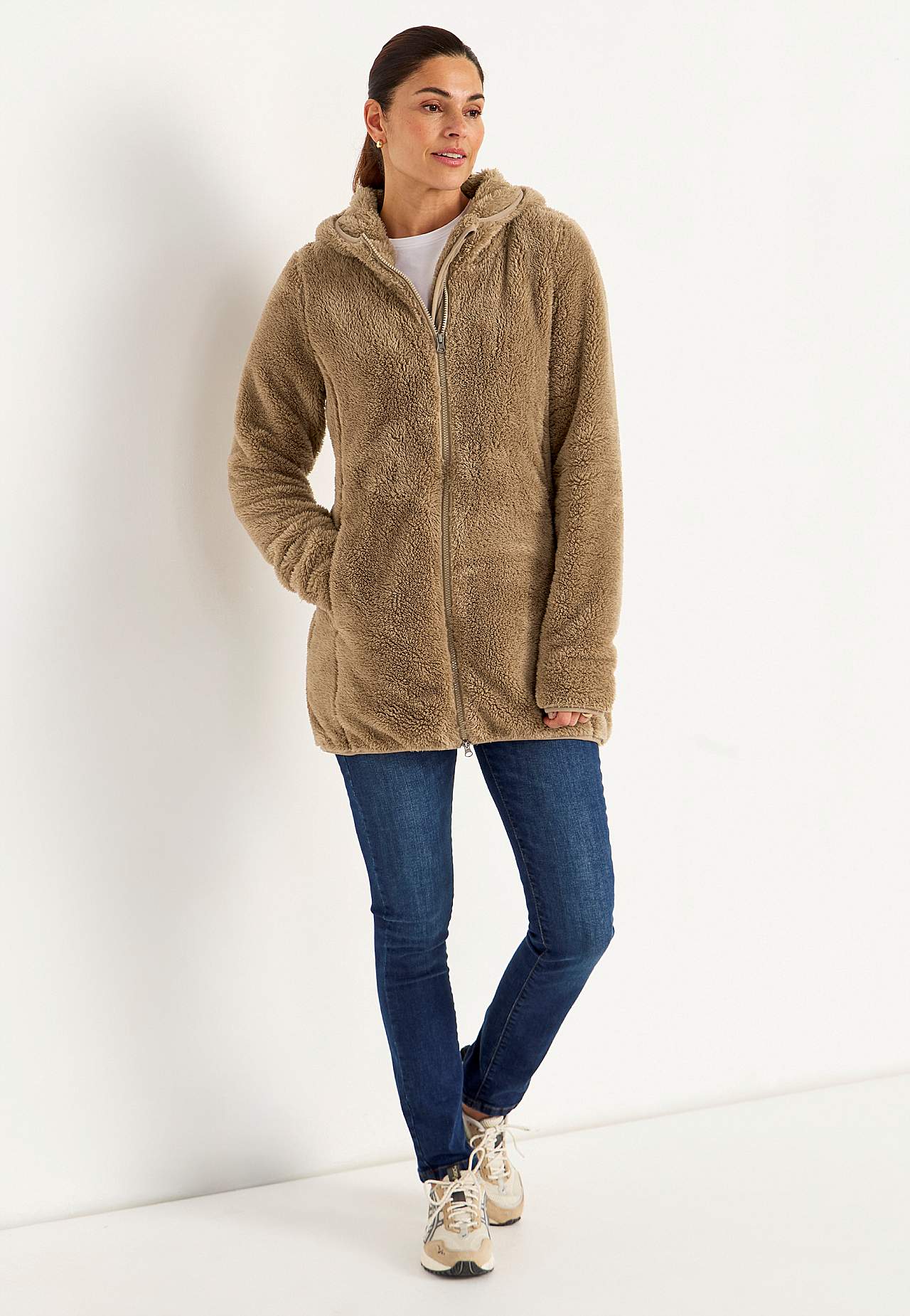 Pehmest materjalist pika tegumoega fliisjakk. Kinniõmmeldud kapuuts on ääristatud elastse sobituva kantpaelaga. Ees tõmbluku ja pehme voodriga taskud. Pikkade varrukate otstes on elastne kummikant. Praktiline kahesuunaline tõmblukk. Sirgel alläärel elastne kantpael. Seljapikkus vastavalt suurusele ca 81-89 cm.