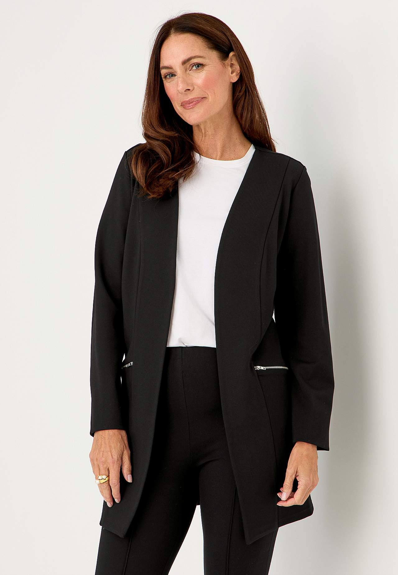 Avaralõikeline eest avatud pintsak. Paksem elastne trikotaažkangas. Mugav, pika tegumoega mudel. Hõbedast värvi tõmblukuga taskud. Pikad sirged varrukad. Kergelt kaarjas alläär. Ilma voodrita. Seljapikkus vastavalt suurusele ca 78-89 cm.