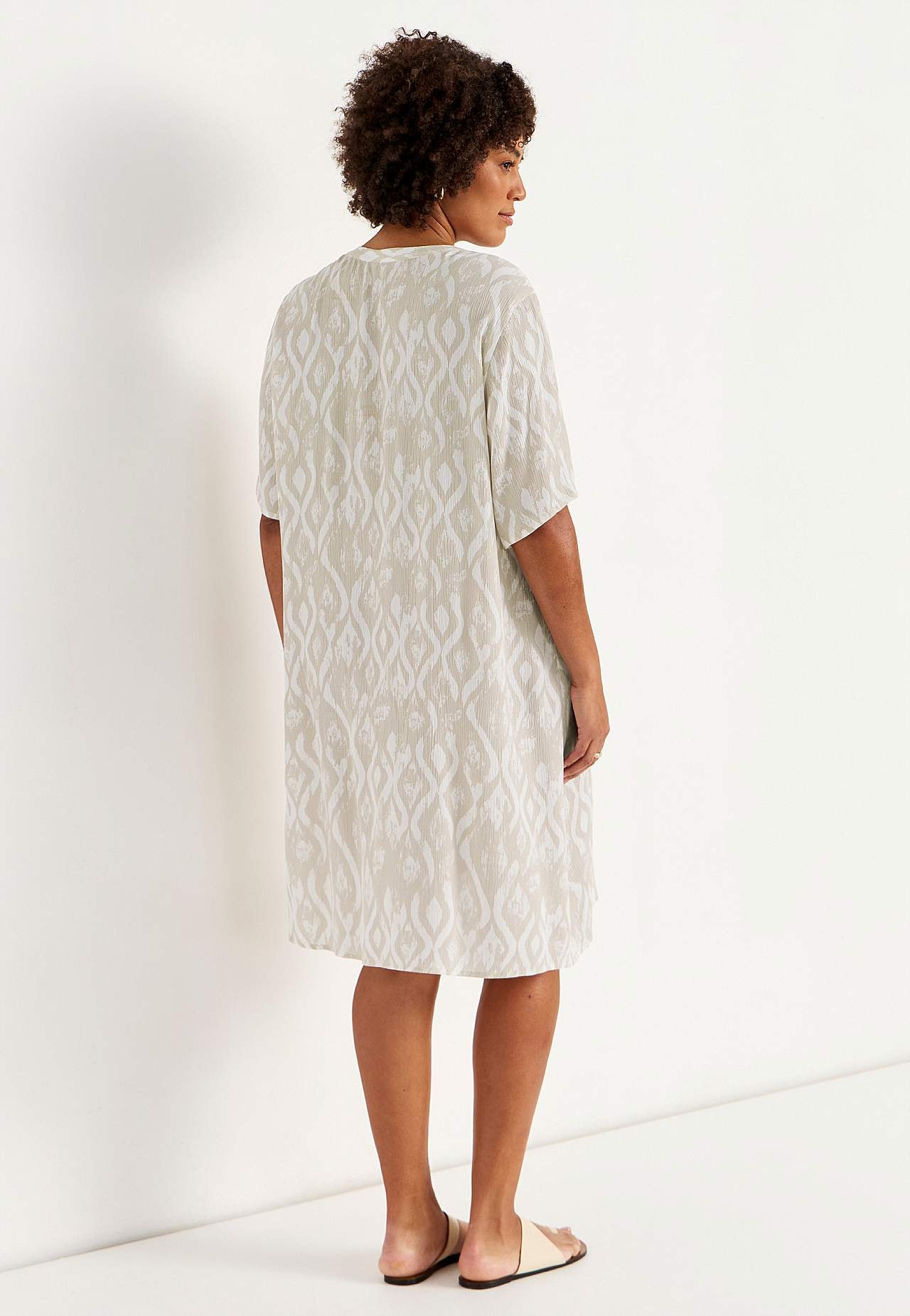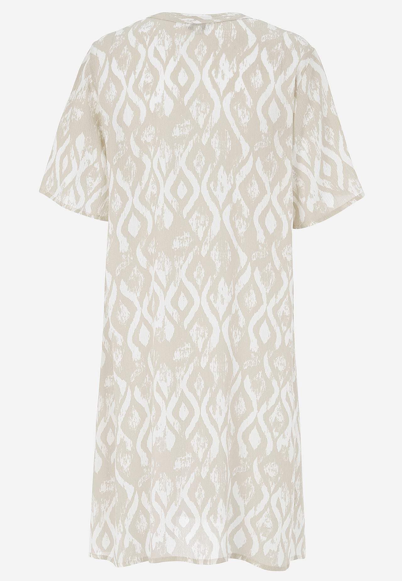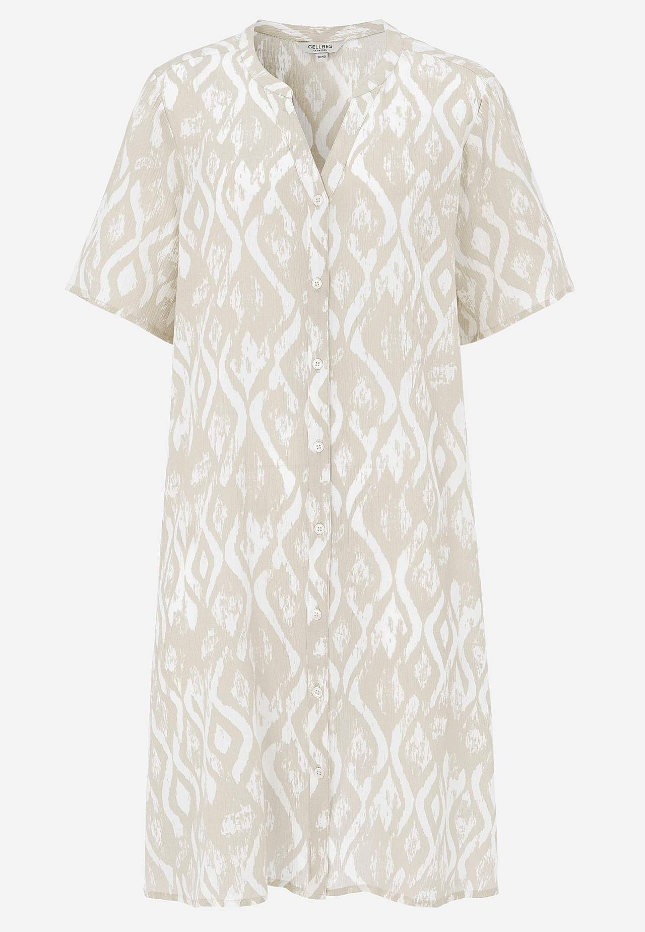 Õhuline, jahe materjal mati pinna ja ilusa tekstuuriga. A-lõikeline, avaram tegumood. Ees nööbiliist. Lühikesed varrukad. Seljapikkus vastavalt suurusele umbes 97–105 cm.
