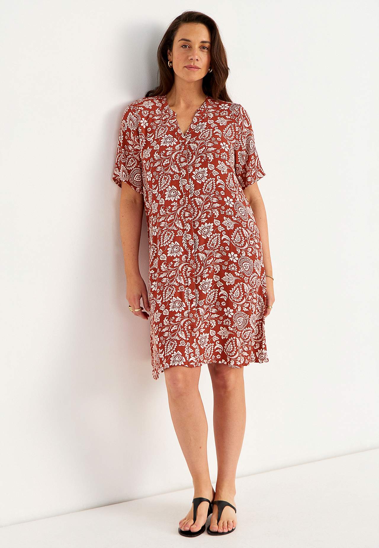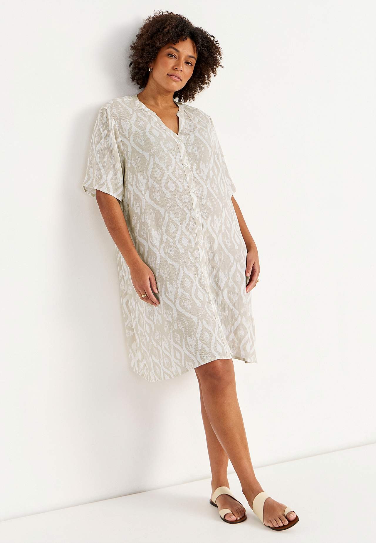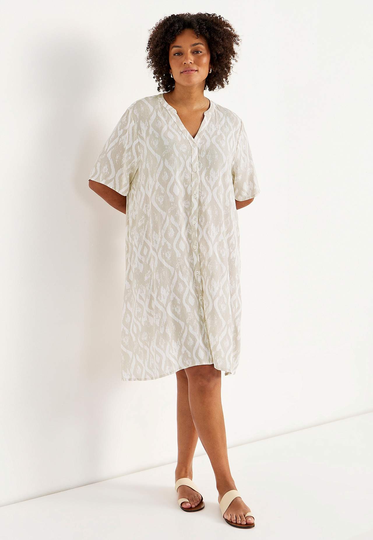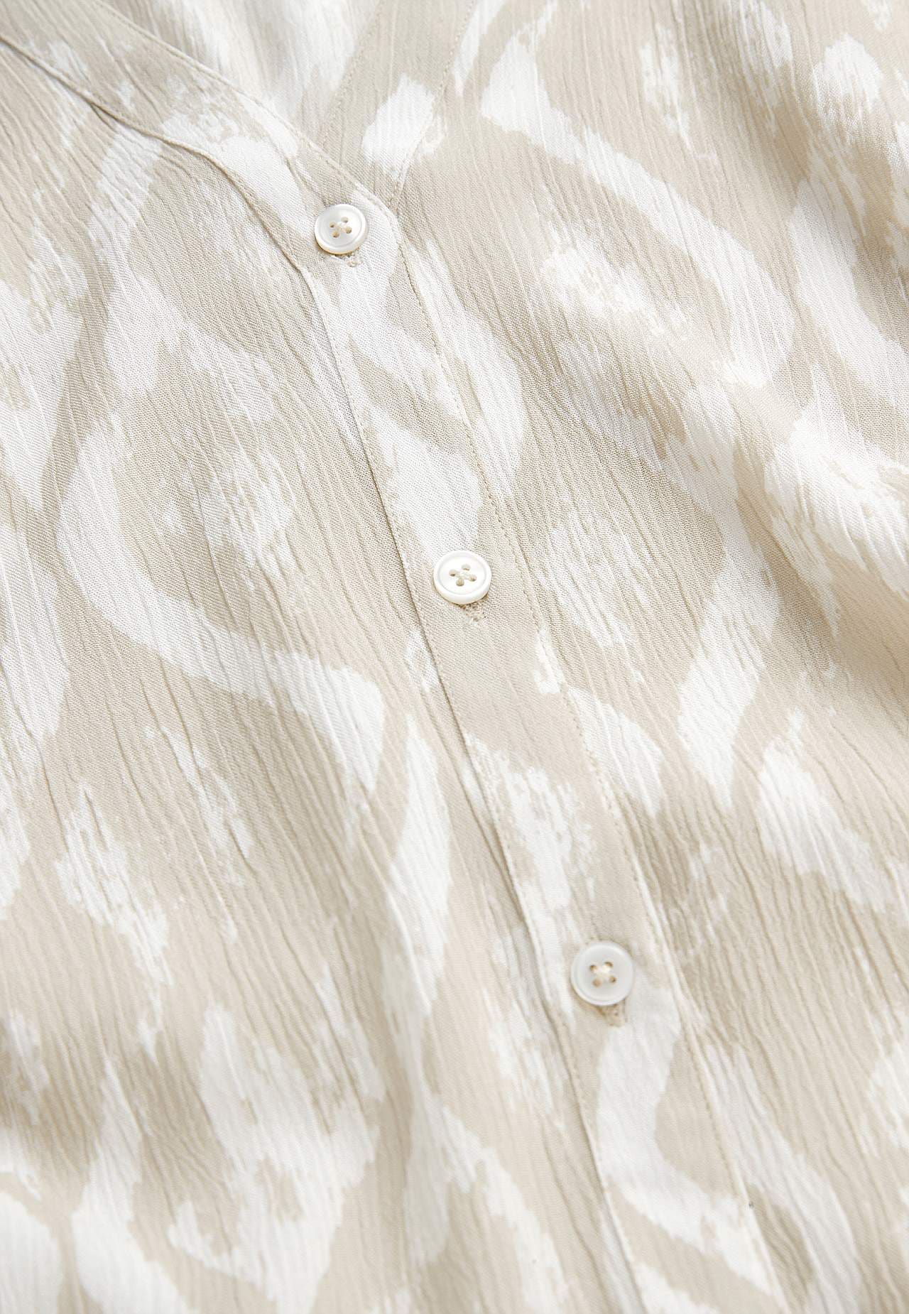 Õhuline, jahe materjal mati pinna ja ilusa tekstuuriga. A-lõikeline, avaram tegumood. Ees nööbiliist. Lühikesed varrukad. Seljapikkus vastavalt suurusele umbes 97–105 cm.