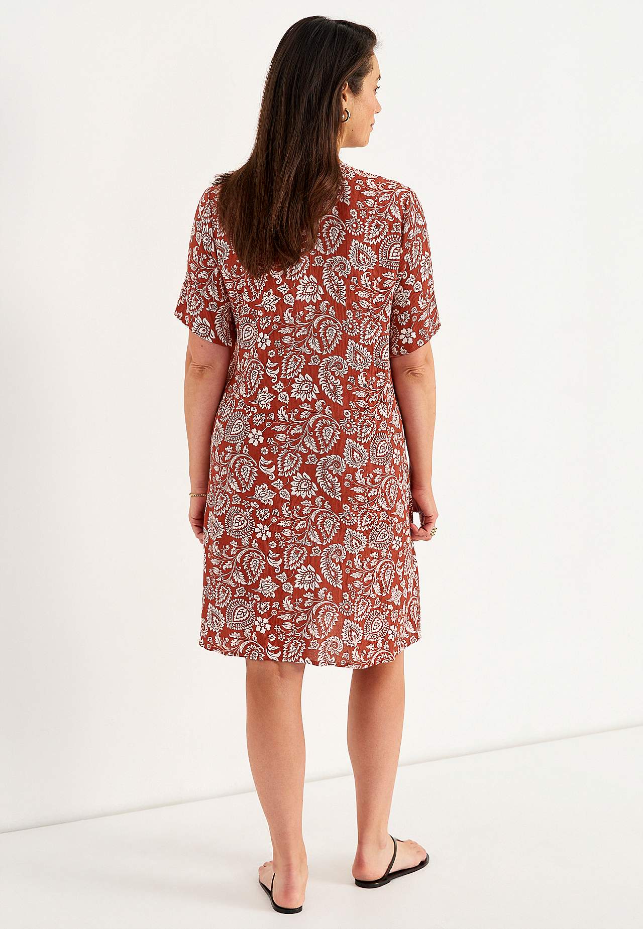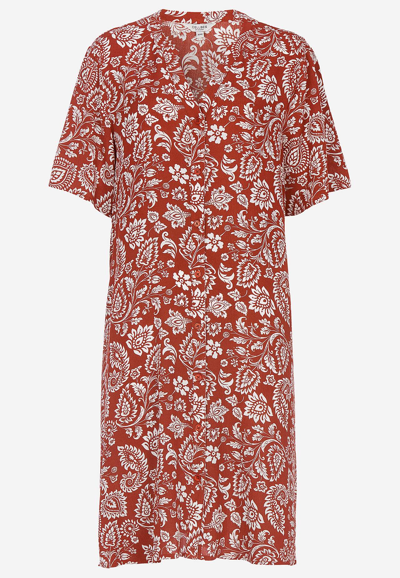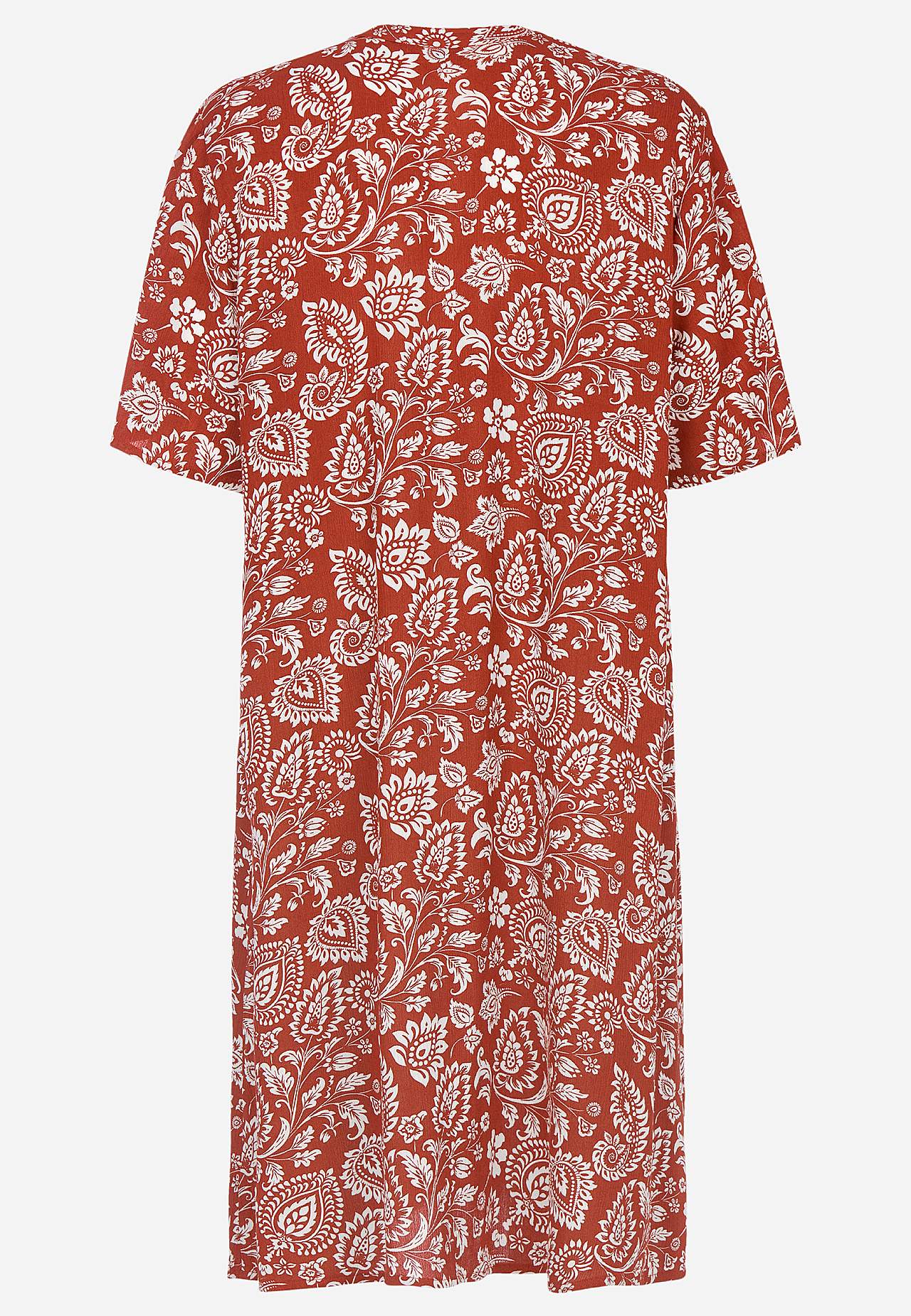 Õhuline, jahe materjal mati pinna ja ilusa tekstuuriga. A-lõikeline, avaram tegumood. Ees nööbiliist. Lühikesed varrukad. Seljapikkus vastavalt suurusele umbes 97–105 cm.