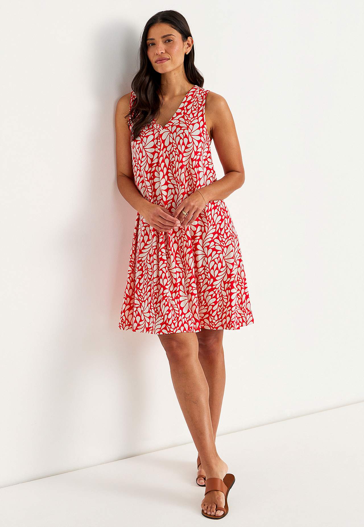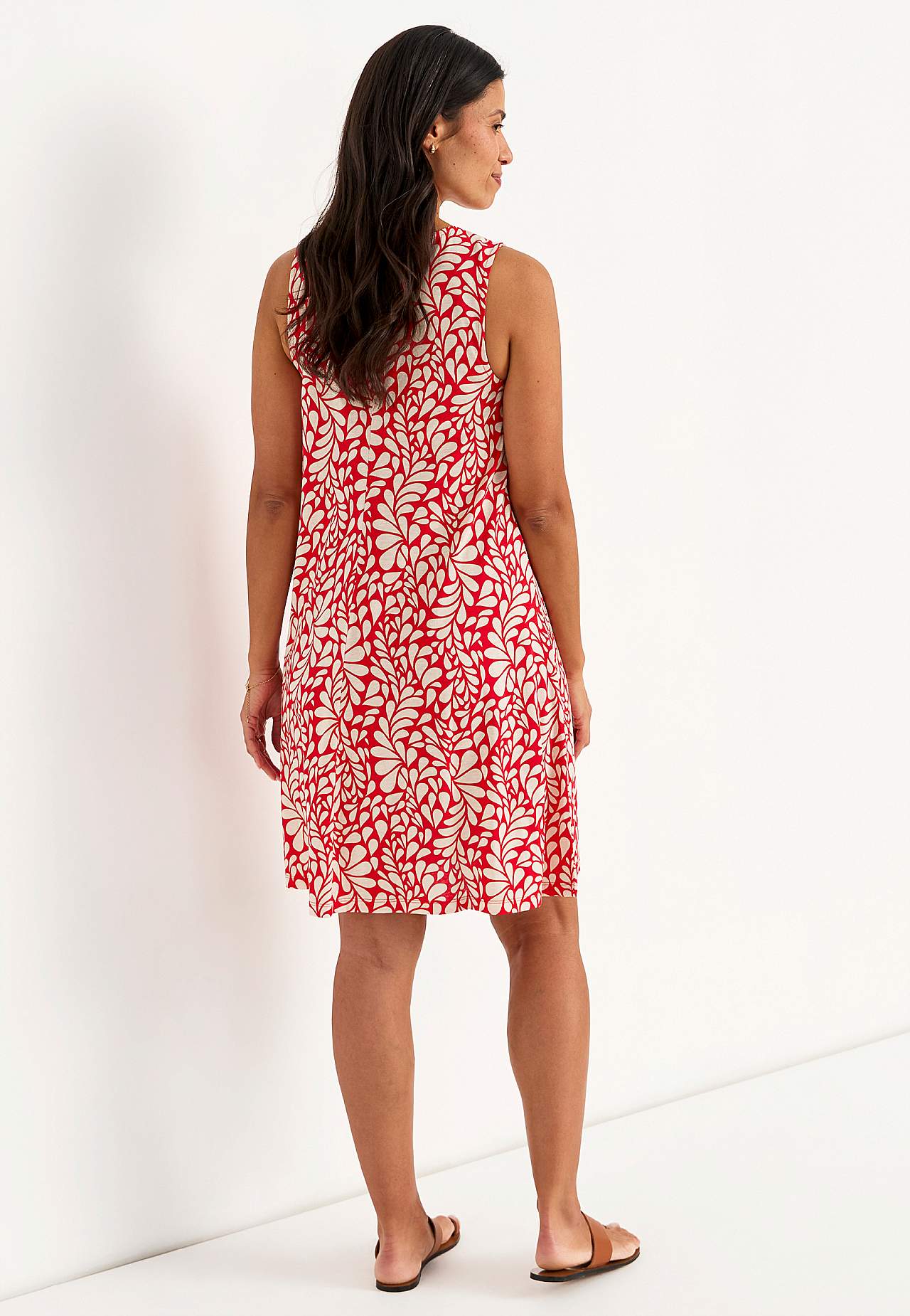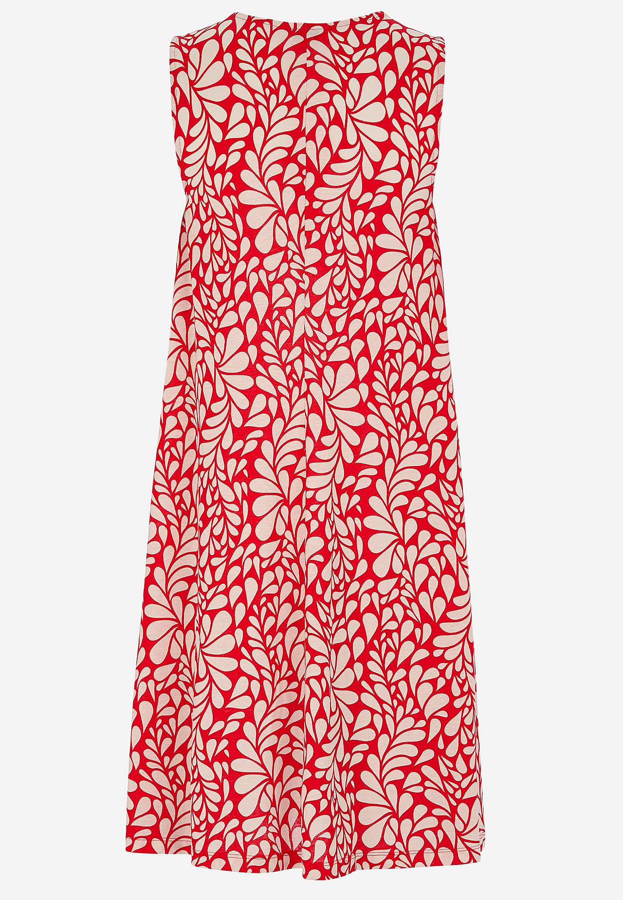 Varrukateta trikotaažist kleit. Õhuline mudel pehmest ja mõnusast puuvilla-viskoosisegust. Avar tegumaad, kergelt A-lõikeline. Pikkus õlast vastavalt suurusele umbes 95-106 cm.