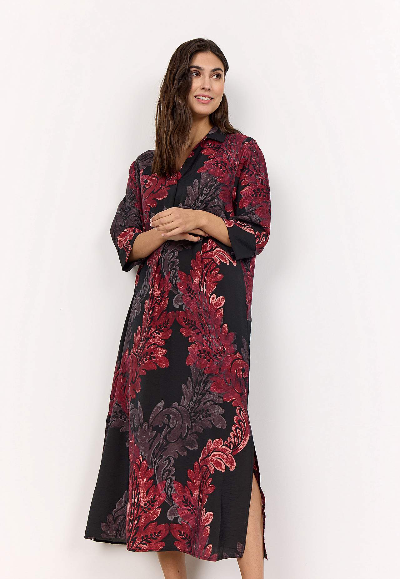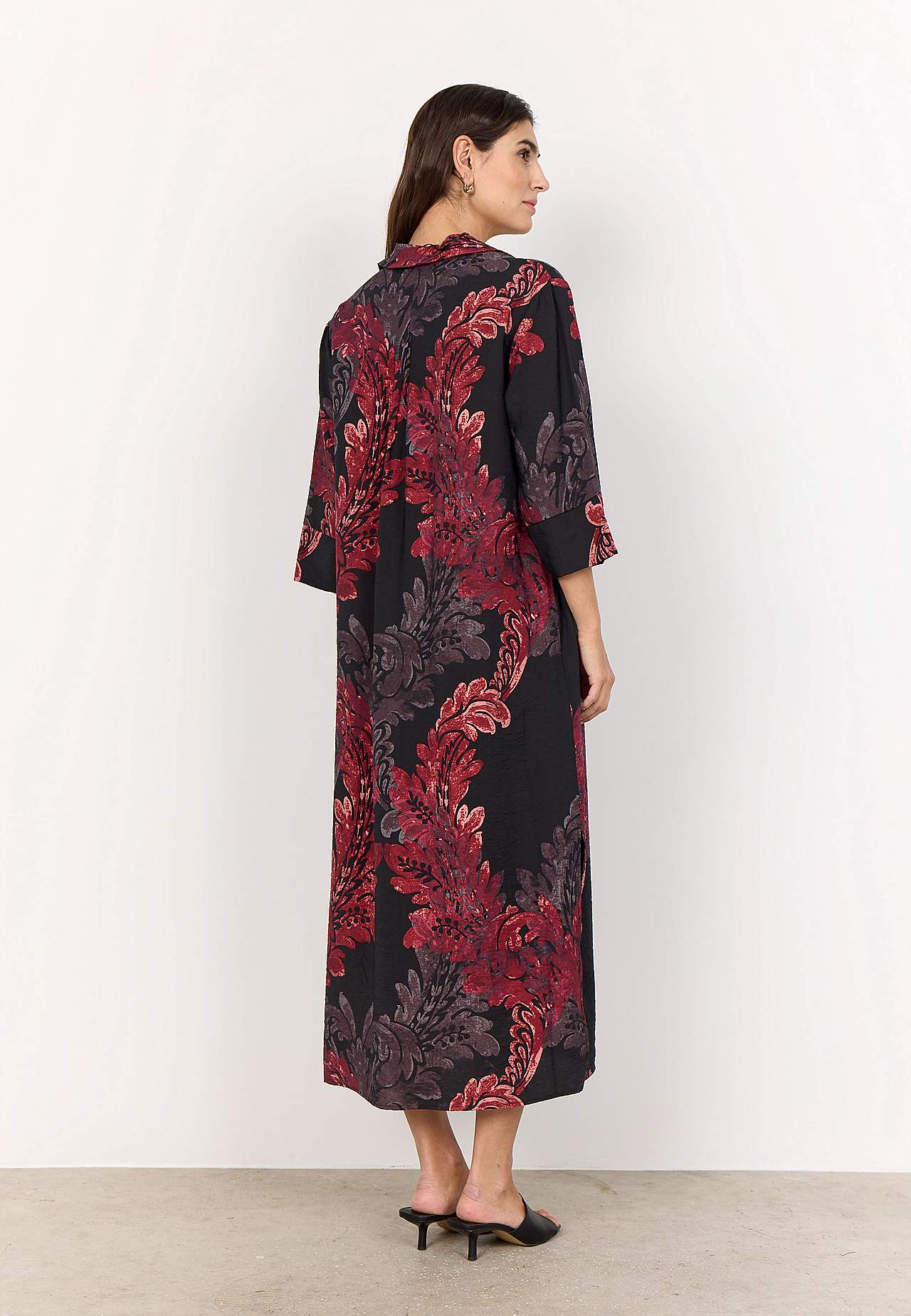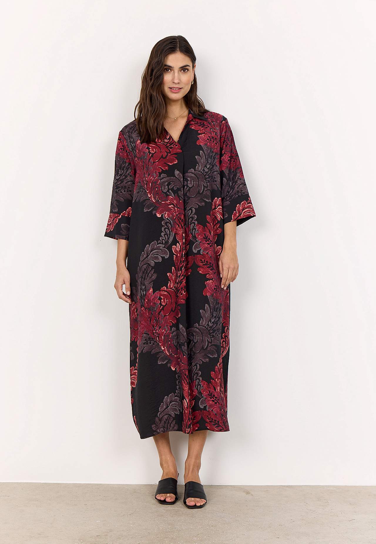 Kerge läikega jahutavast viskoosisegusest materjalist kleit. Kaftani-lõikeline avar mudel. Kraega ja voldiga V-kaelus. Taga dekoratiivne volt. Laiade kätistega kolmveerandpikkuses avarad varrukad. Sirge alläär, külgedel lõhikud. Pikkus õlast u. 127cm suurusel S (38).