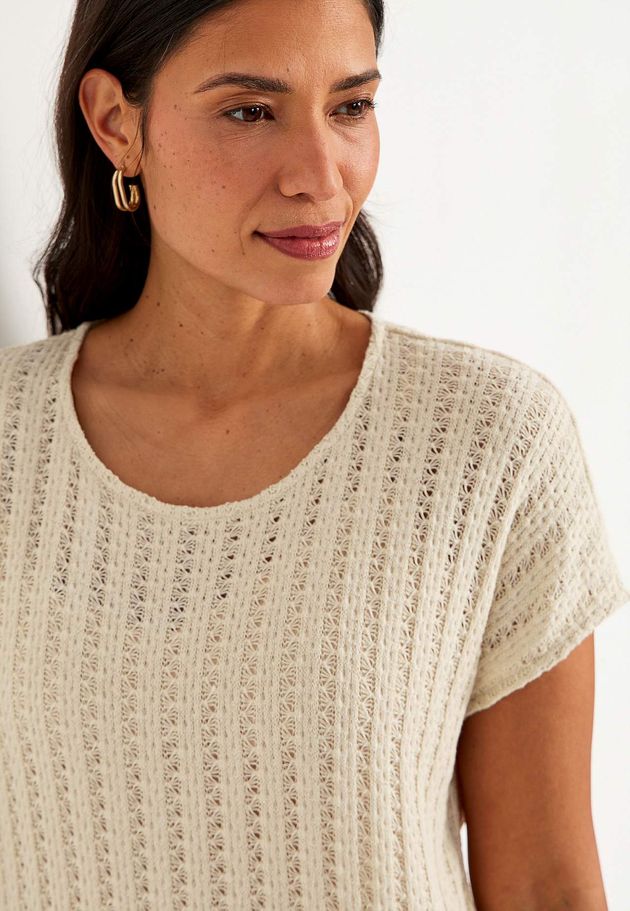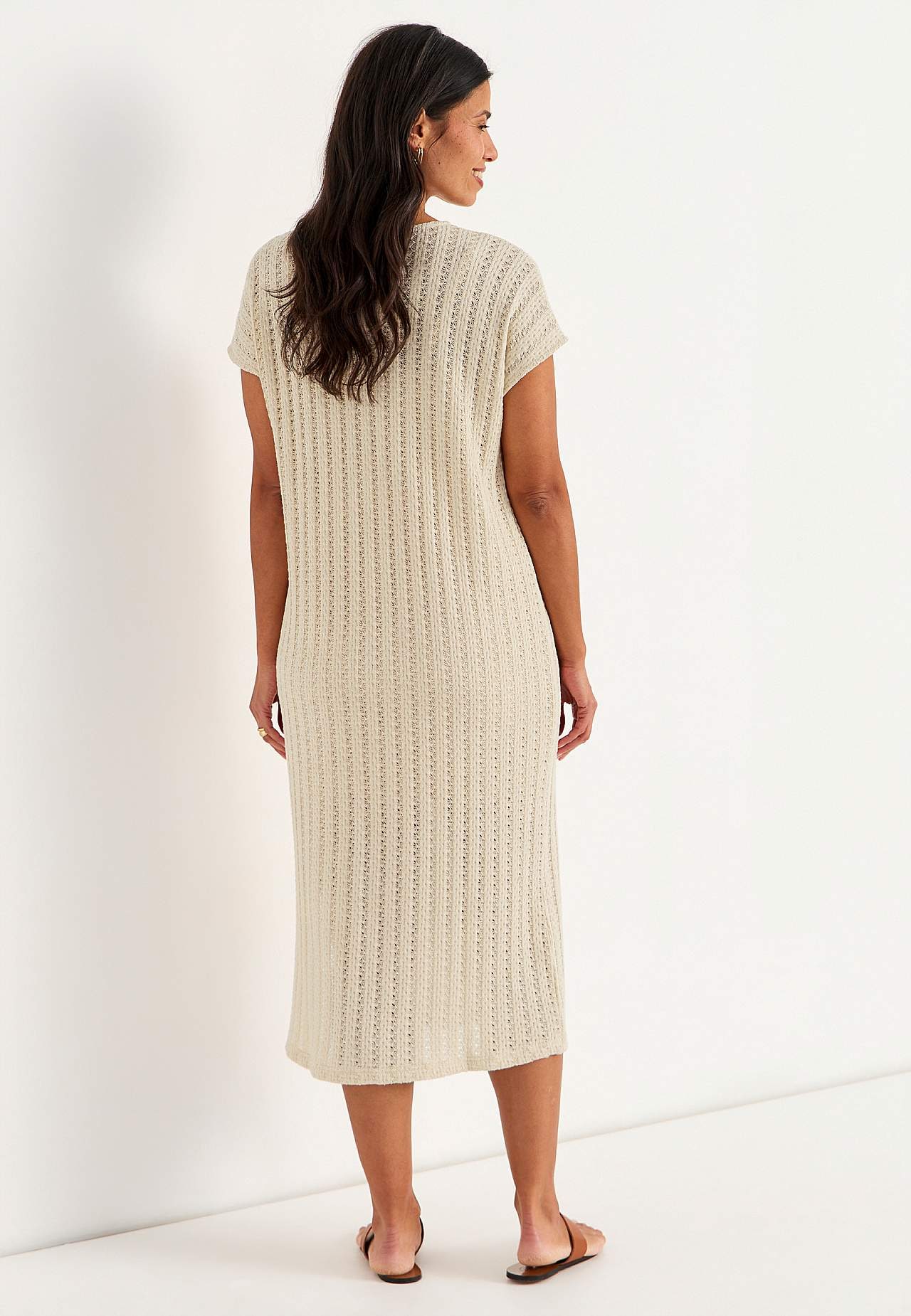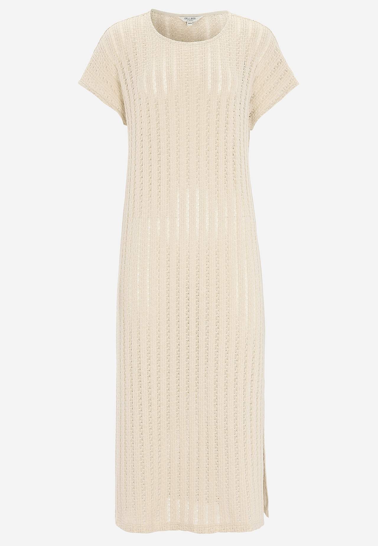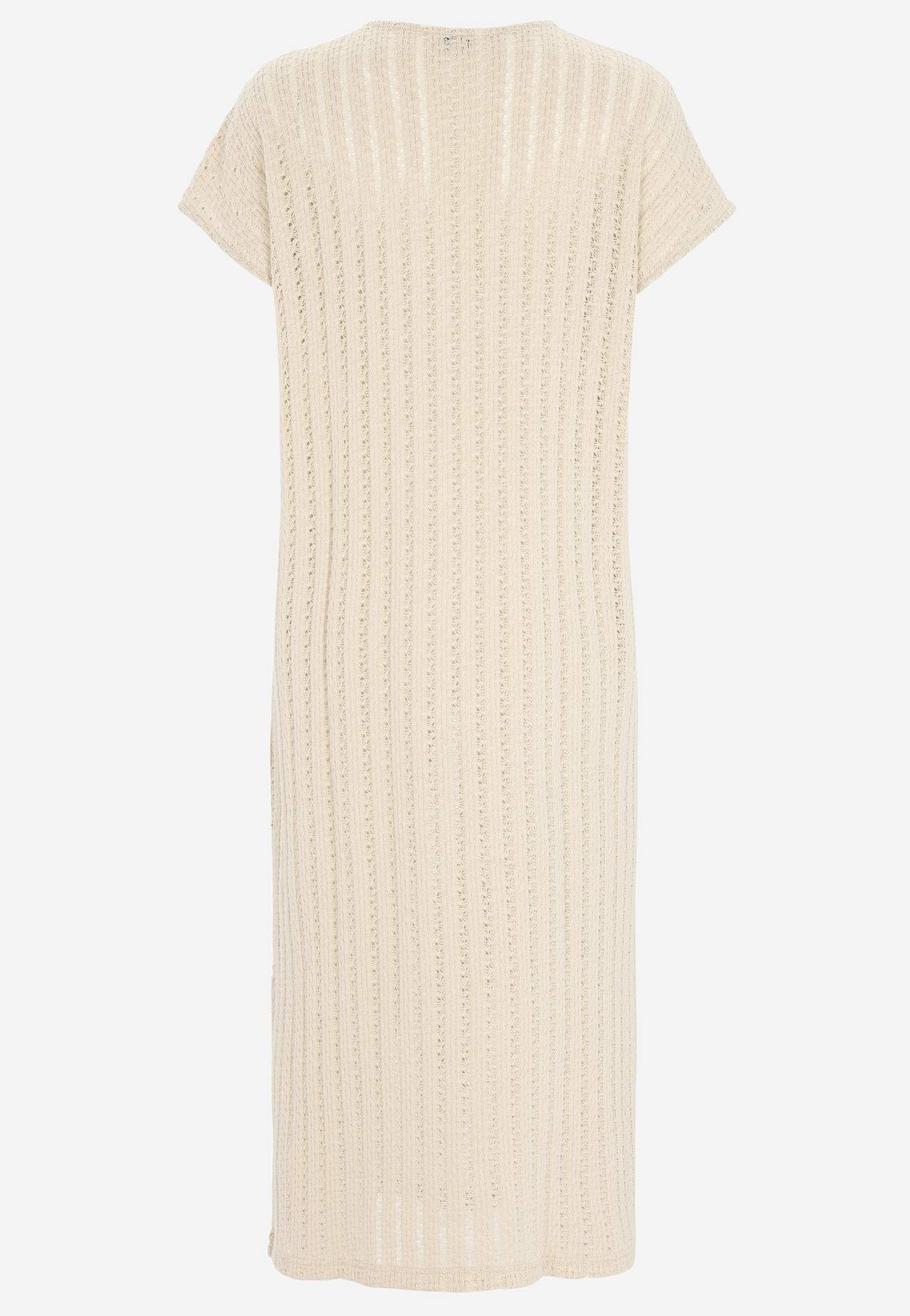 Õhuline, efektne pitsimustriline trikotaažkleit. Pehmest ja vastupidavast puuvillasegusest materjalist. Voodrita, pikk kaftanilõikeline mudel. Suurepärane kanda topi ja valgete teksade peal. Avaram mudel. Ümar kaelus. Lühikesed varrukad. Kergelt kaarjas alläär, küljel lõhik. Seljapikkus kõikidel suurustel u. 124 cm.