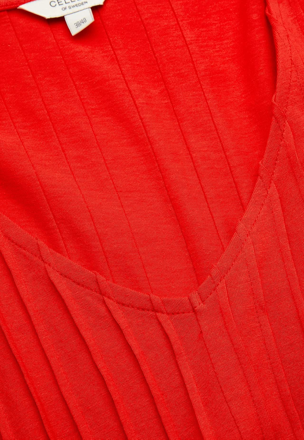 Trikotaažkleit, ees ja taga dekoratiivsed nöörvoldid. Sirgelõikeline V-kaelusega mudel. Avaram tegumood. Lühikesed varrukad. Kergelt kaarjas alläär. Pikkus õlast u. 123 cm kõikidel suurustel.