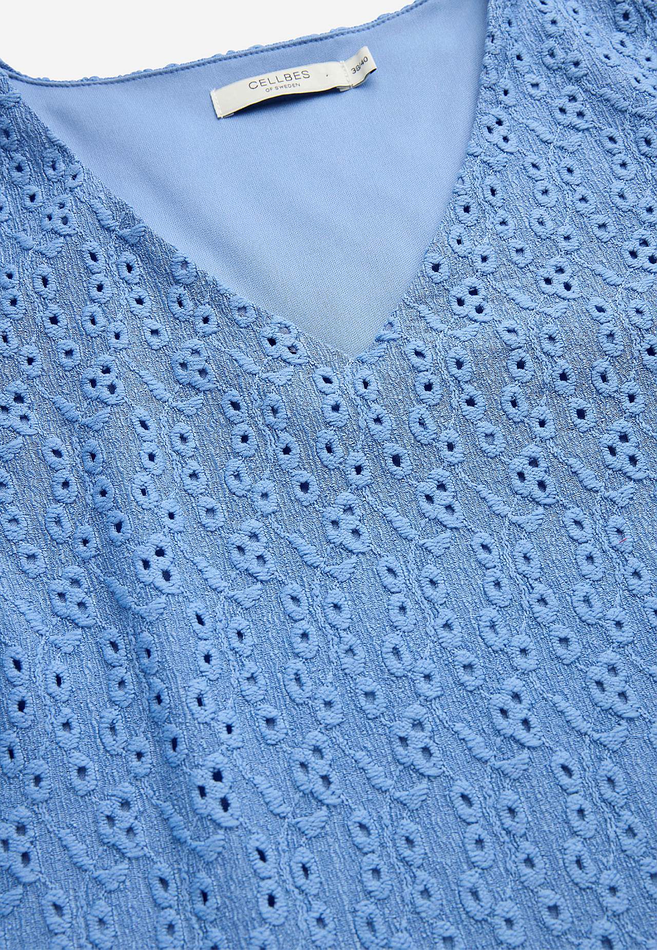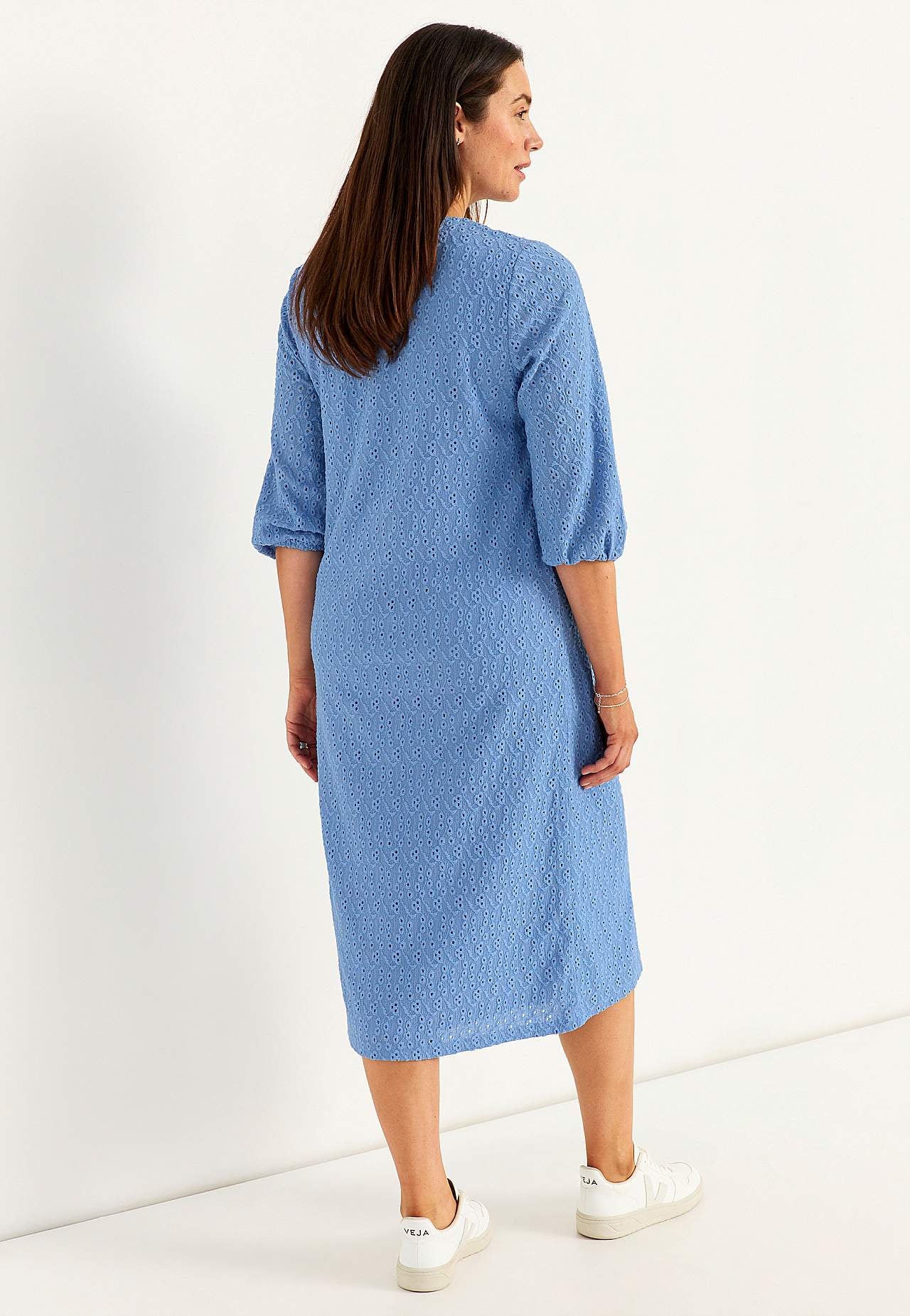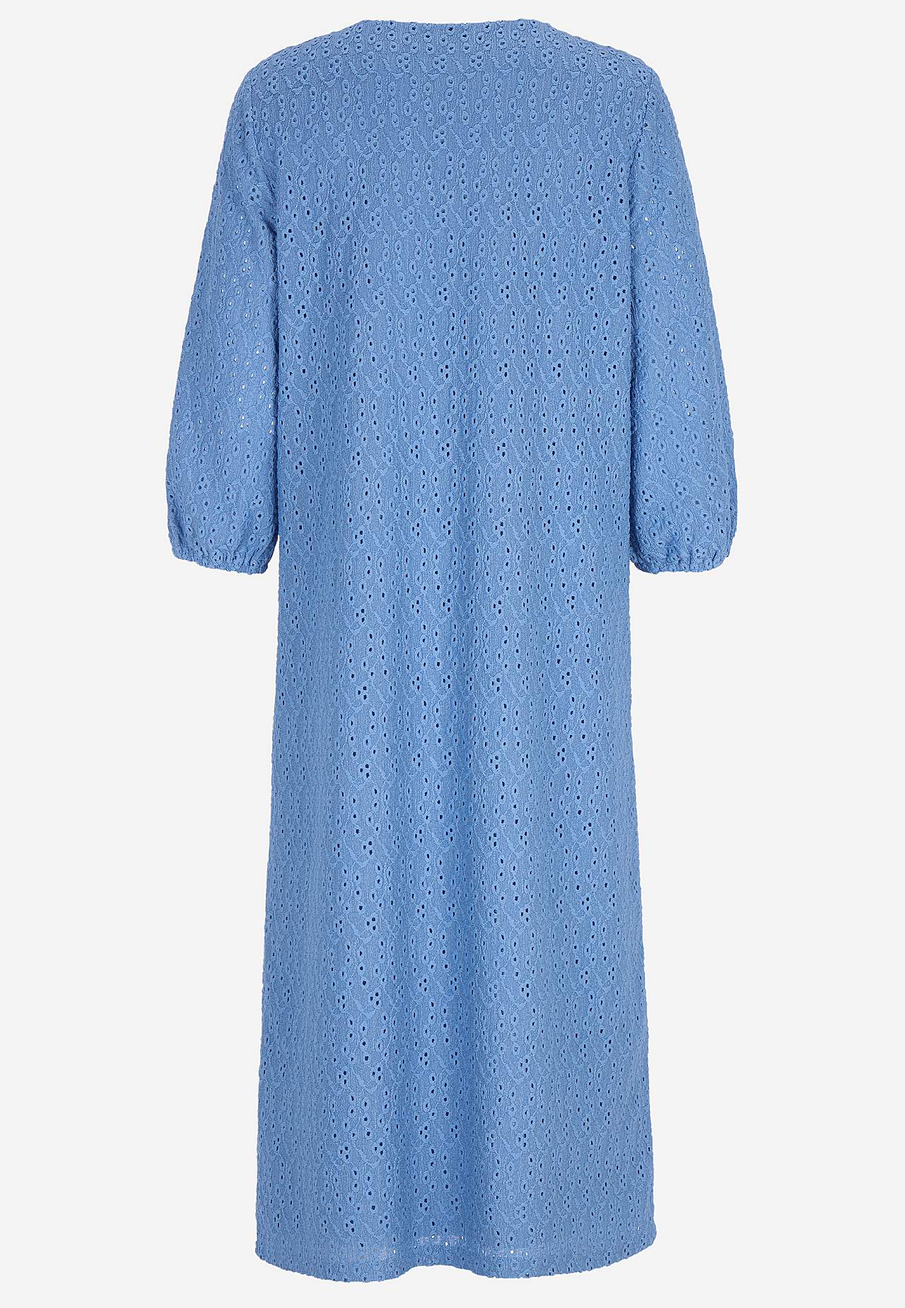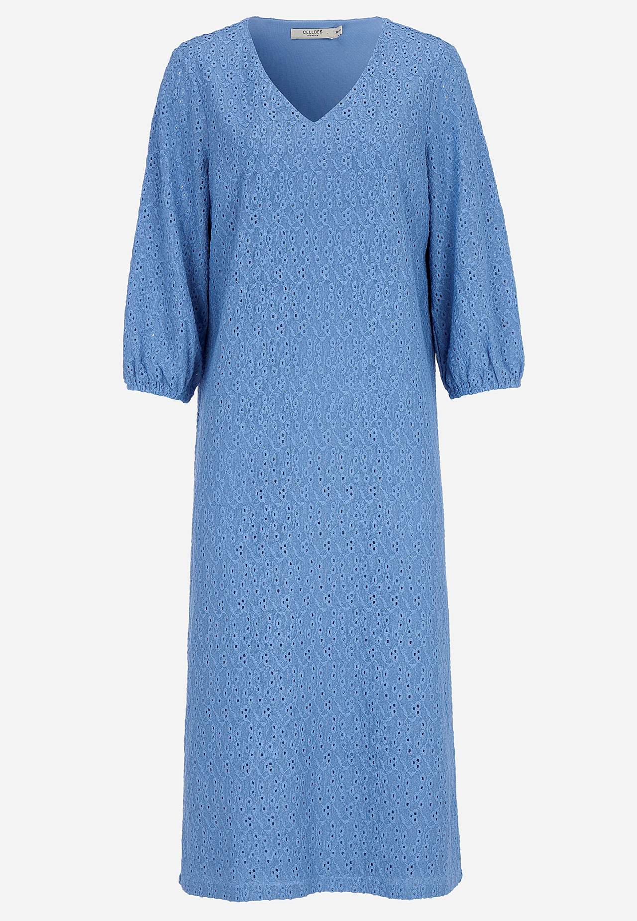 Struktuurne muster, voodriga kleit broderiitikandiga. Mugav, elastne kangas. Kergelt A-lõikeline tegumood. V-kaelus. Rinna kohal sissevõtted. 3/4 ilma voodrita varrukad, mille otstes elastne mansett. Sirge alläär. Seljapikkus kõikidel suurustel umbes 120 cm.