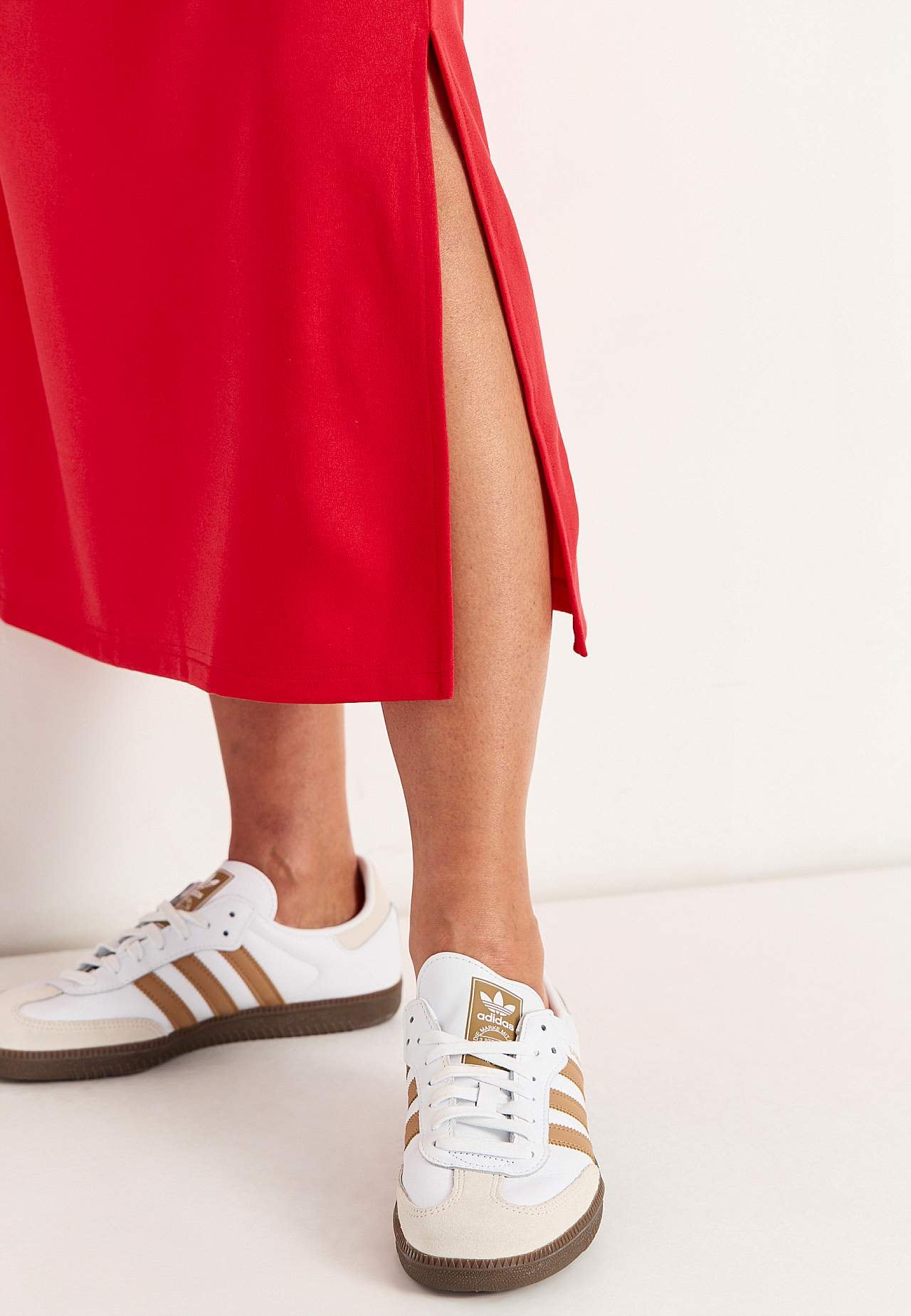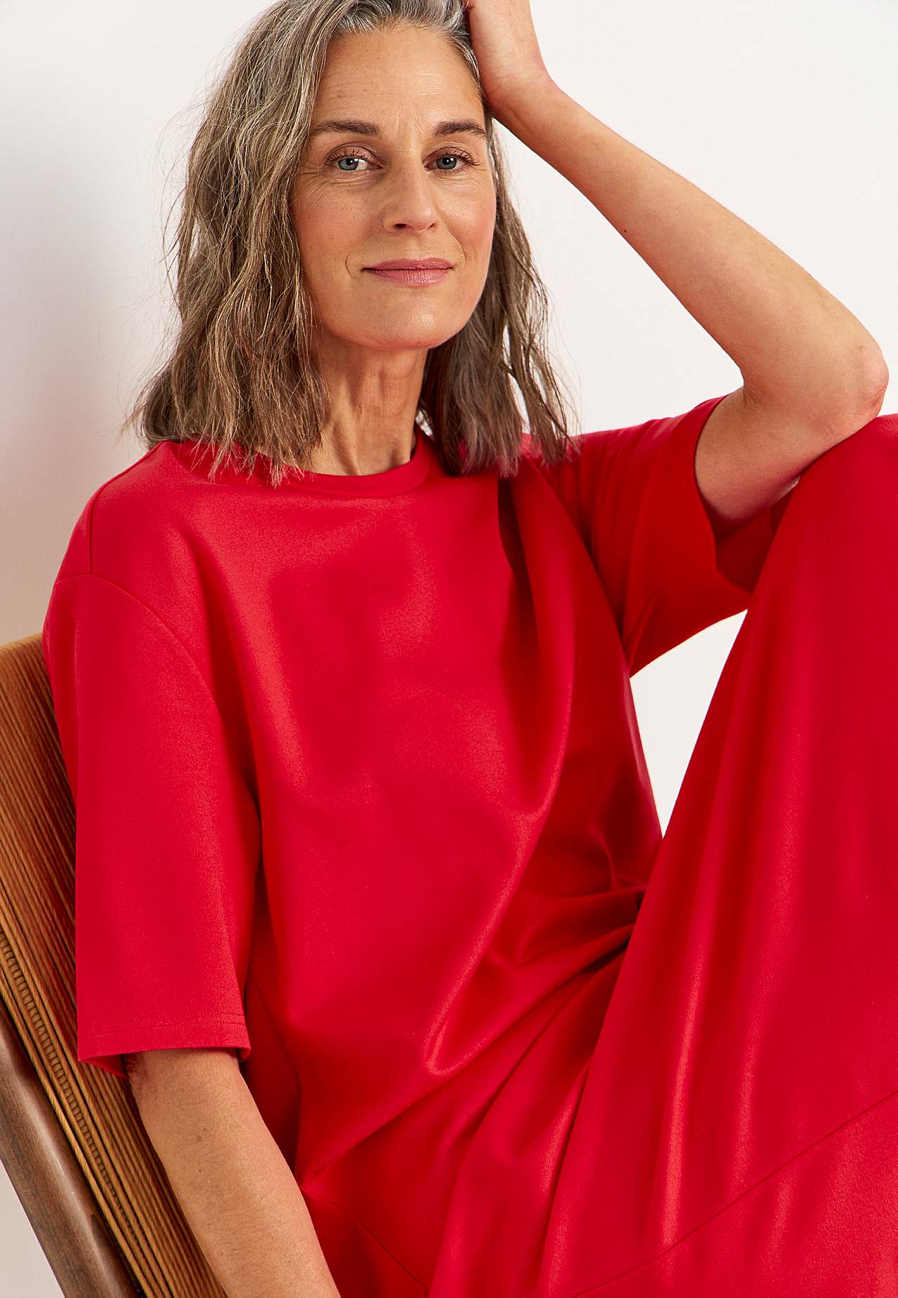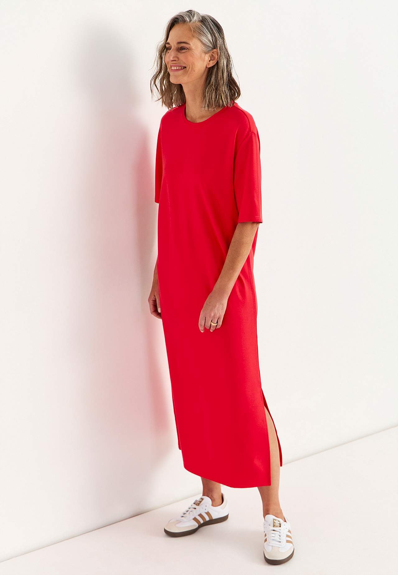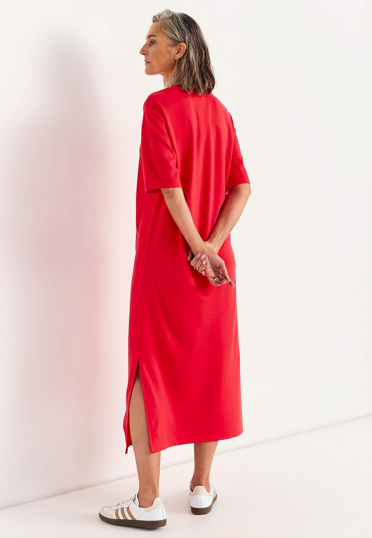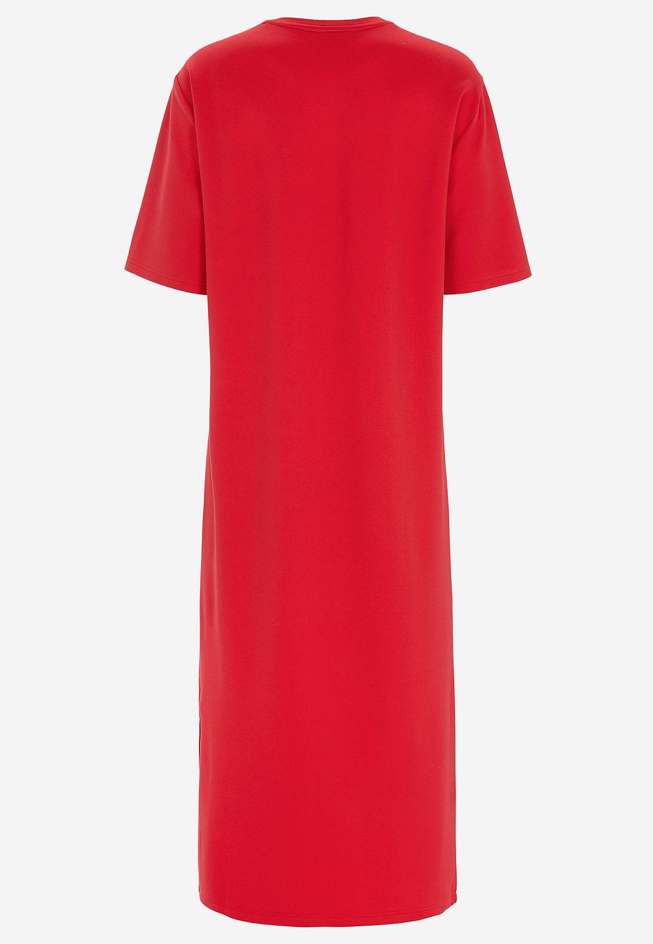 Pehmest, elastsest paksemast trikotaažist kleit. Sirge lõikega. Ümar kaelus. Pikendatud õlaosa. Lühikesed varrukad. Sirge alläär, külgedel lõhikud. Pikkus õlast kõikidel suurustel umbes 121 cm.