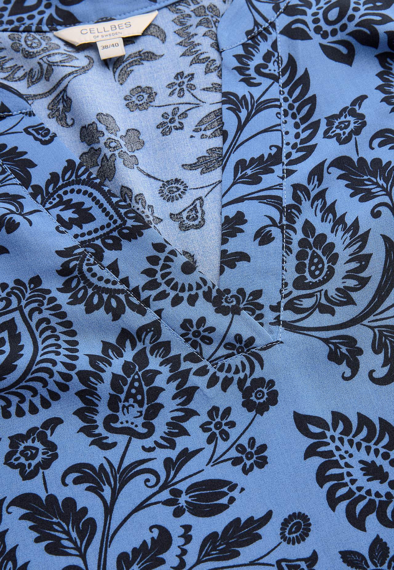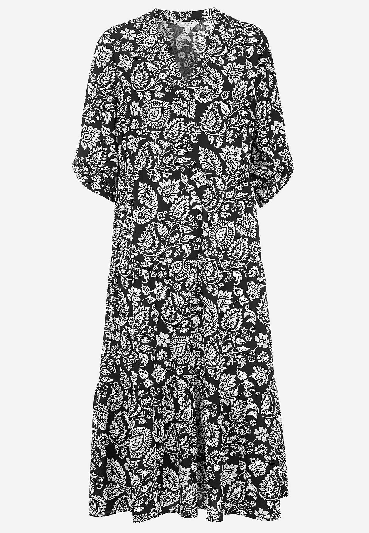 Jahutavast viskoosist volangidega kleit. A-lõikeline, avaram mudel. Pehmest, hästilangevast materjalist. Ümar kaelus V-kaelusega. Kergelt kaarjas alläär. Pikkus õlast u 121-124 cm.