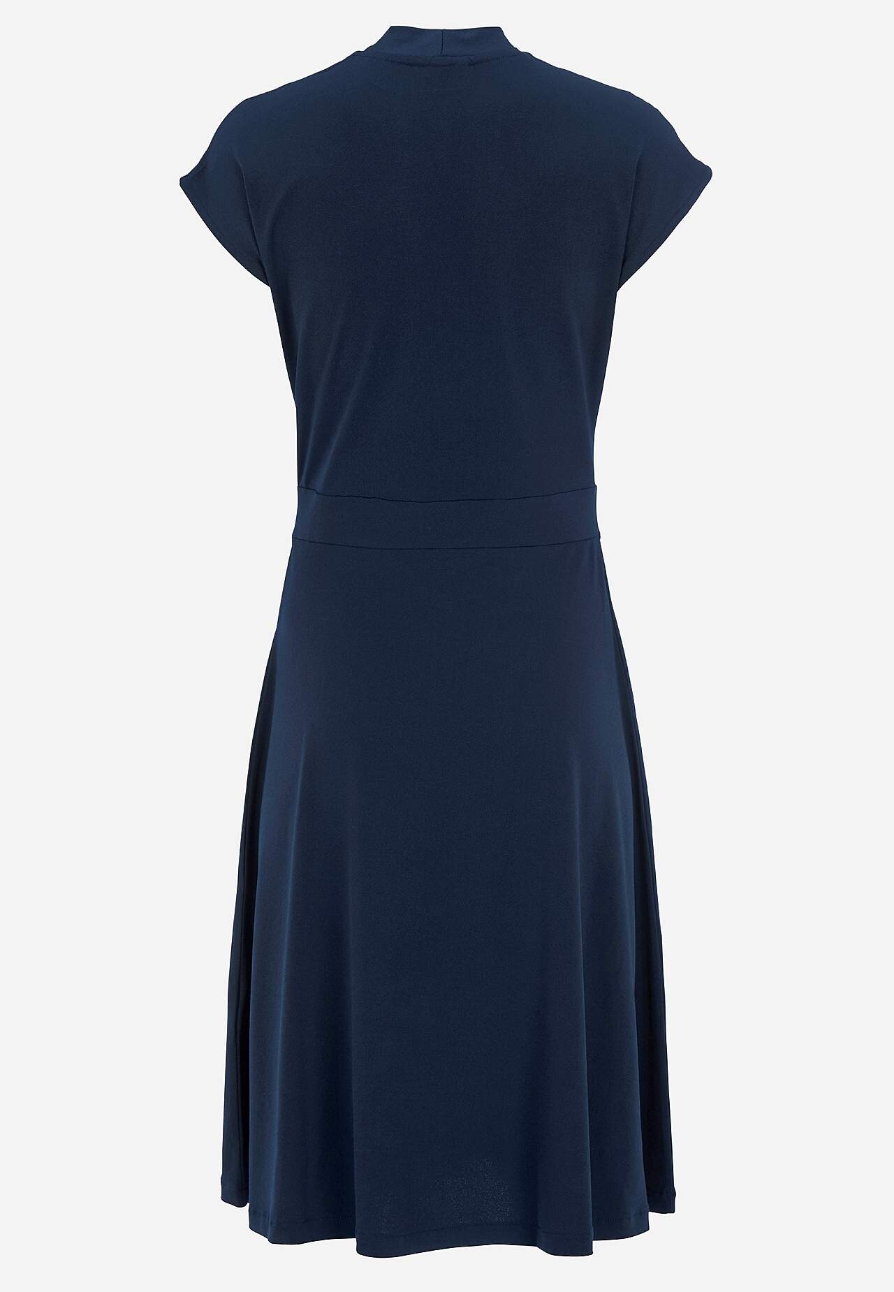 Naiselik, mugavast pehmest trikotaažist kleit. Väga elastne materjal mugava tegumoega. V-kaelusega mudel on väikese püstkraega. Figuuri rõhutav vöökoht. Ees ilus hõlmiklõige ja krooked. Lühikesed varrukad. Alt laienev ja kauni drapeeringuga seelikuosa. Pikkus õlast umbes 106 cm suurusel M (40).