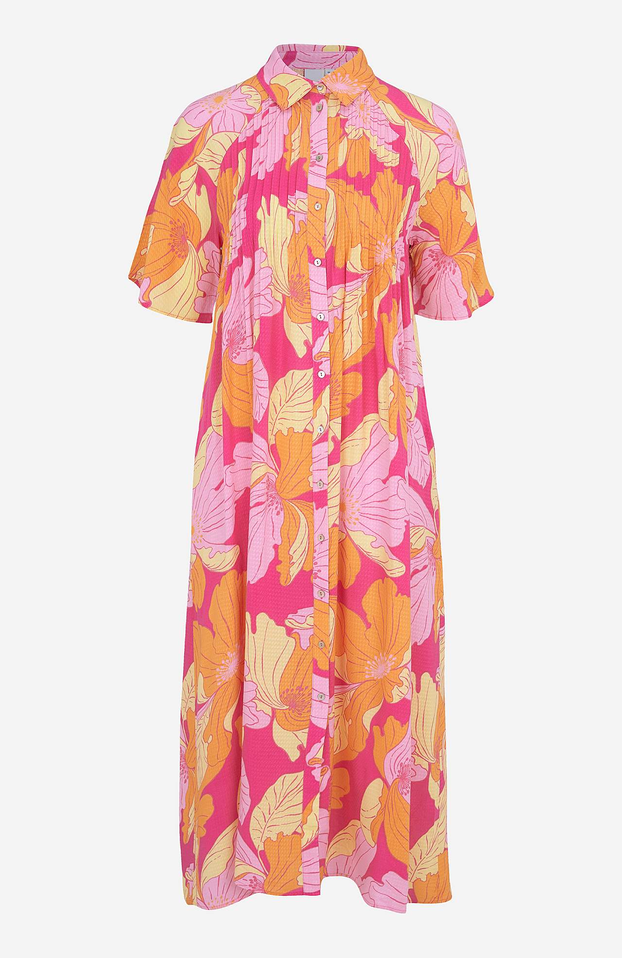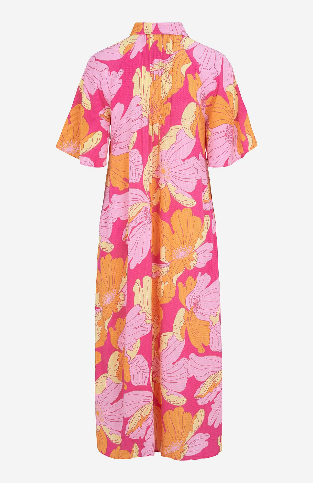 Sirgelõikeline, üleni nööbitav särkkraega mudel. Struktuurse koega pehme ja hästi langev materjal. Ees ja taga dekoratiivsed nöörvoldid. Kauni laiusega lühikesed varrukad. Küljetaskud. Pikkus õlast ca 126 cm suuruse S (36) puhul.
