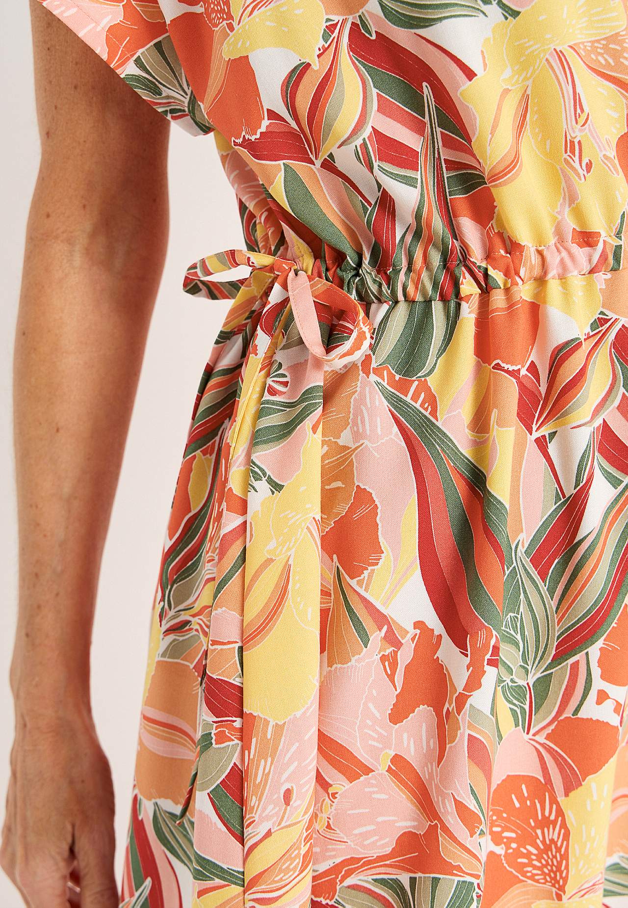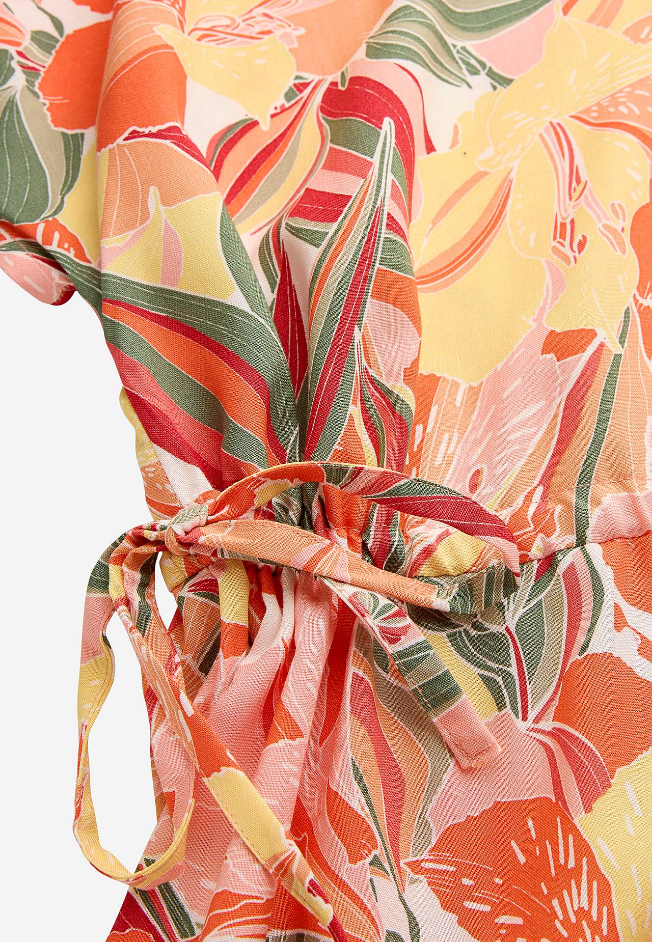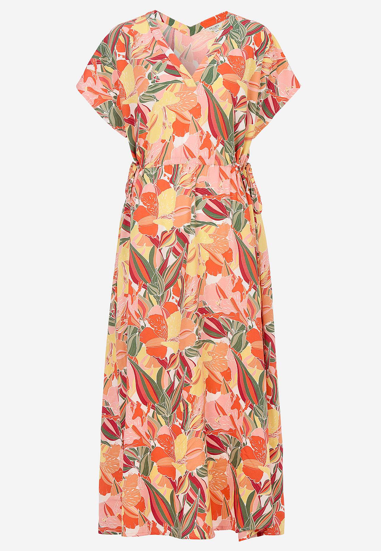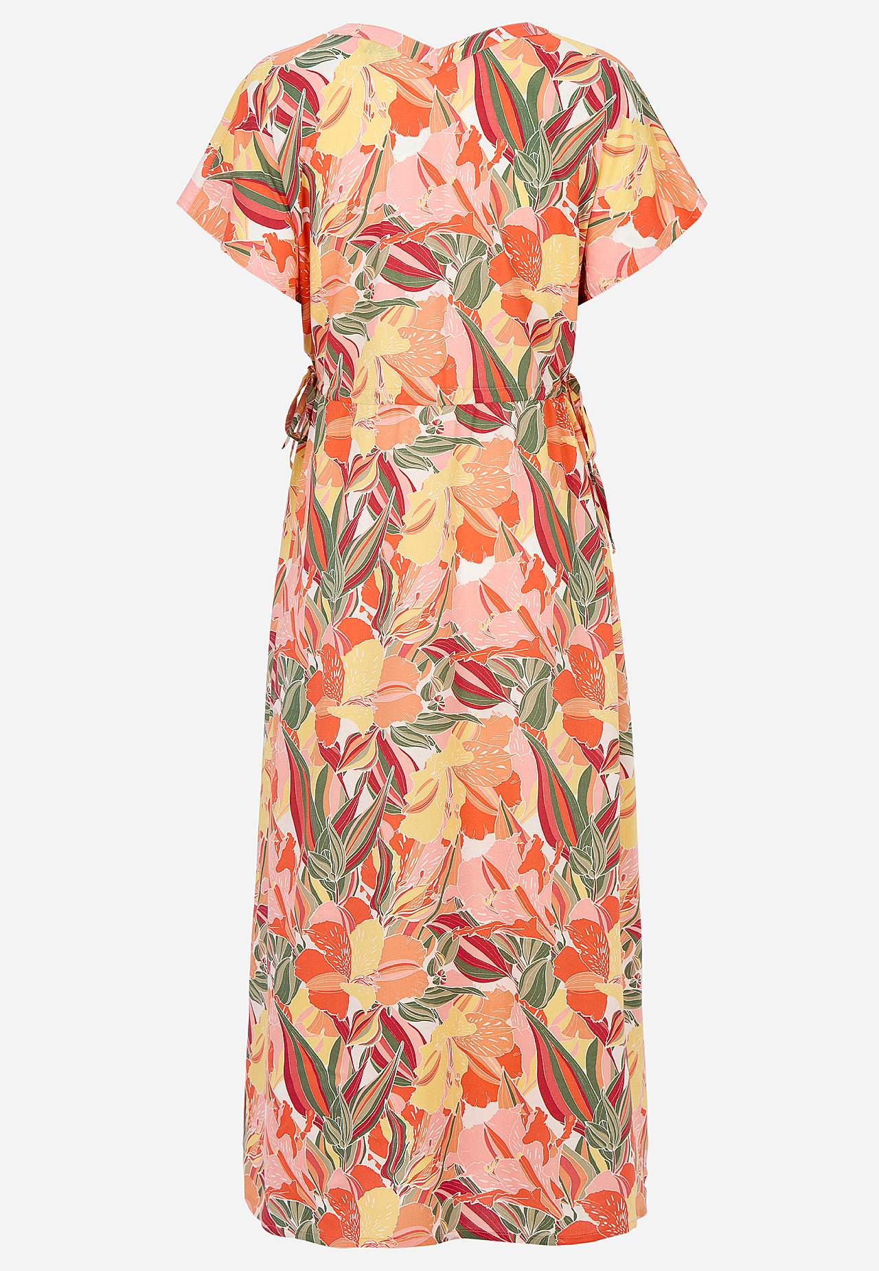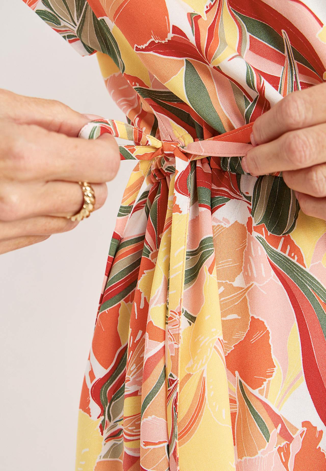 Õhuline ja jahutav mati viimistlusega materjal. Avar, lai tegumood. Laiad varrukad. Vöökohal peidetud seospael. Reguleeritav ja mõlema külje pealt seotav. Saate ise valida kas soovite avaramat või rohkem taljesse vöökohta. Kergelt ümar alläär. Seljapikkus umbes 128 cm kõikidel suurustel.