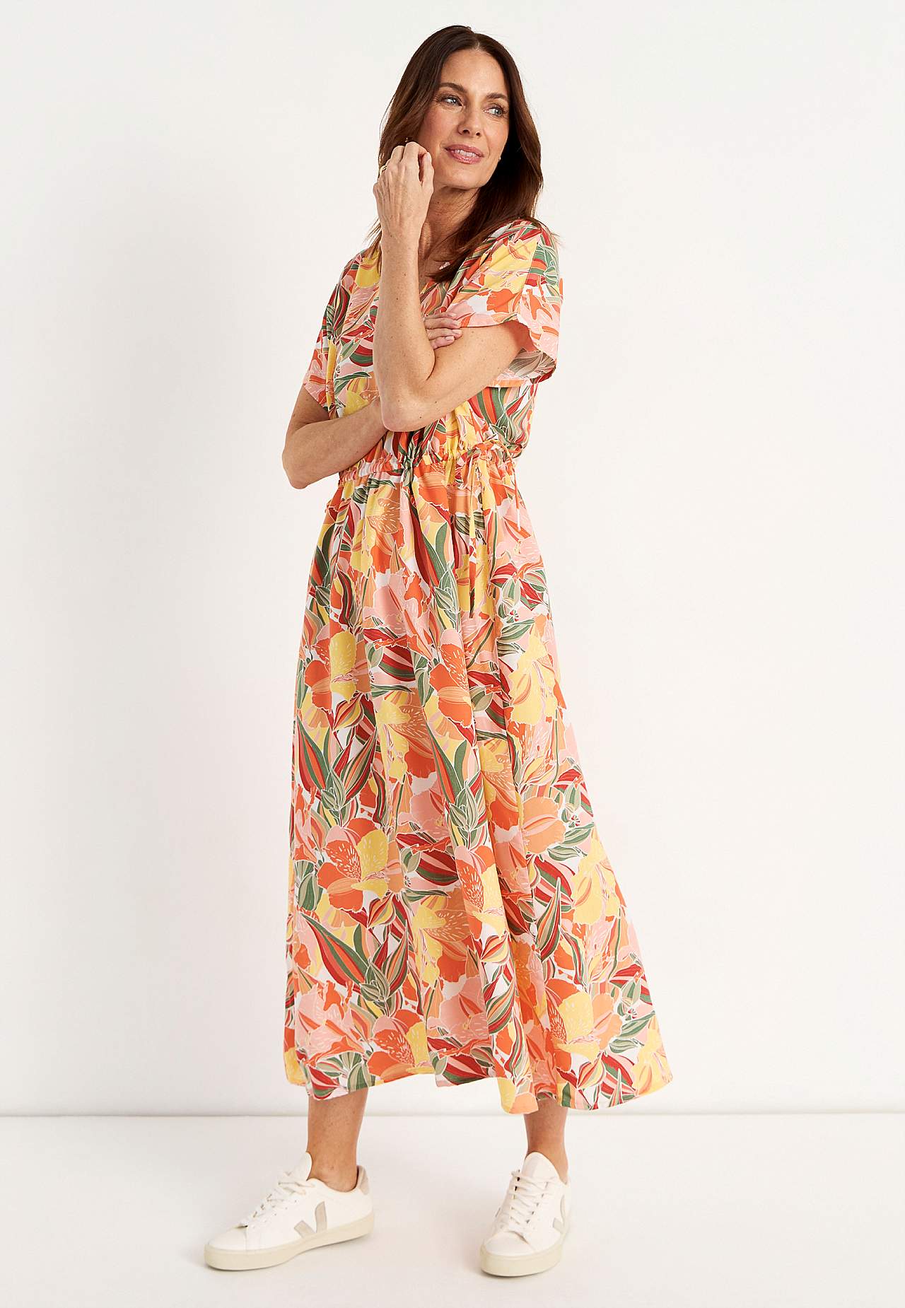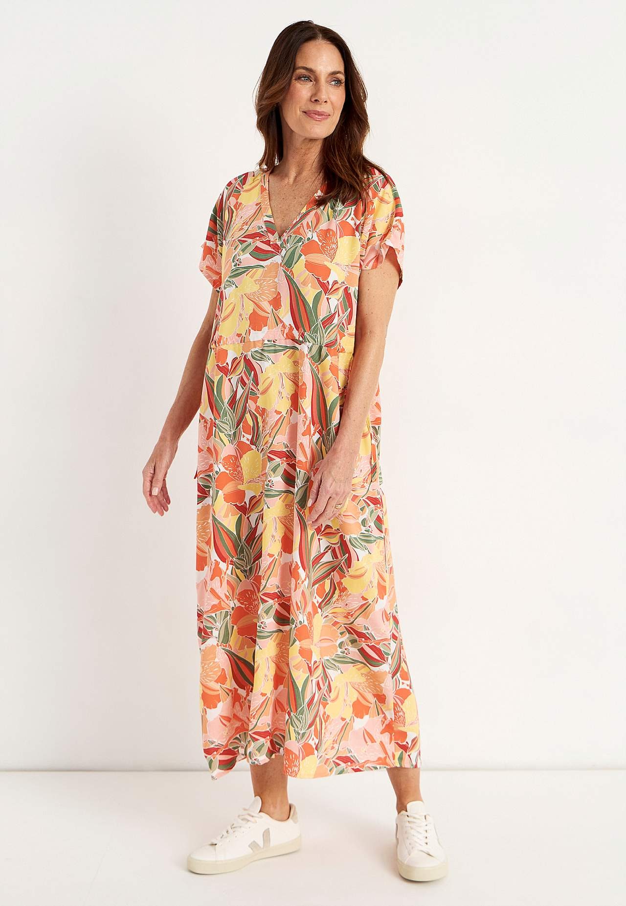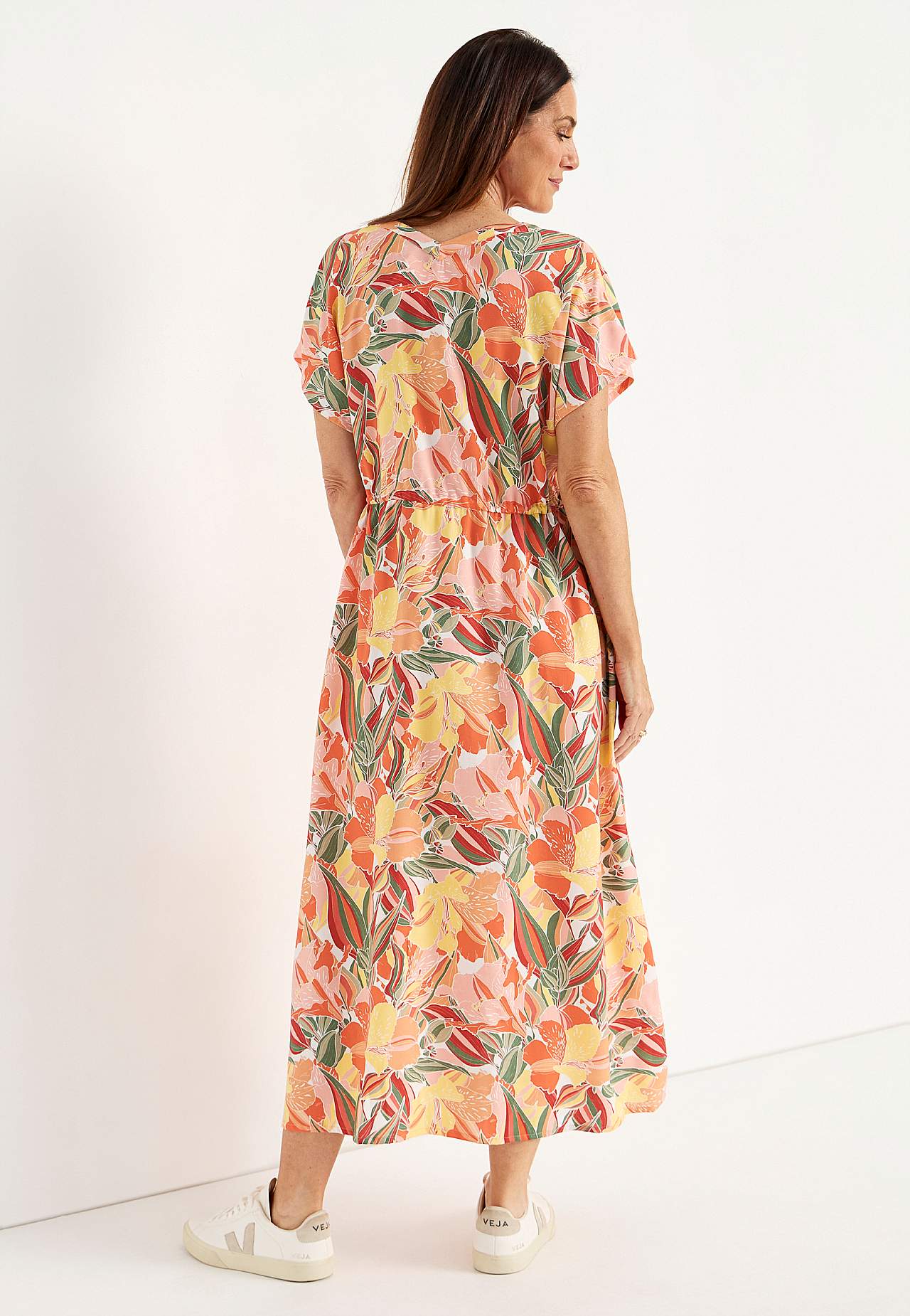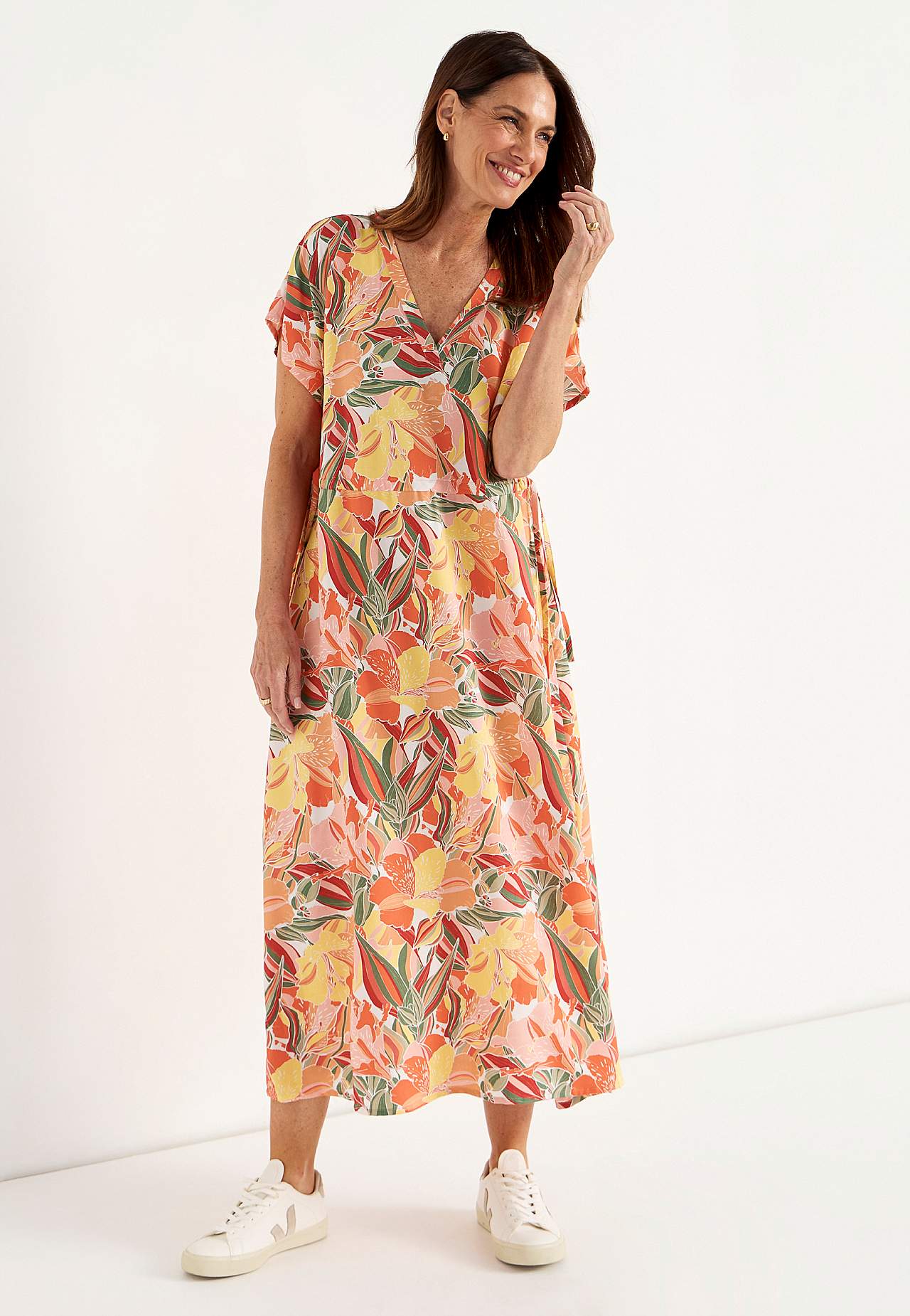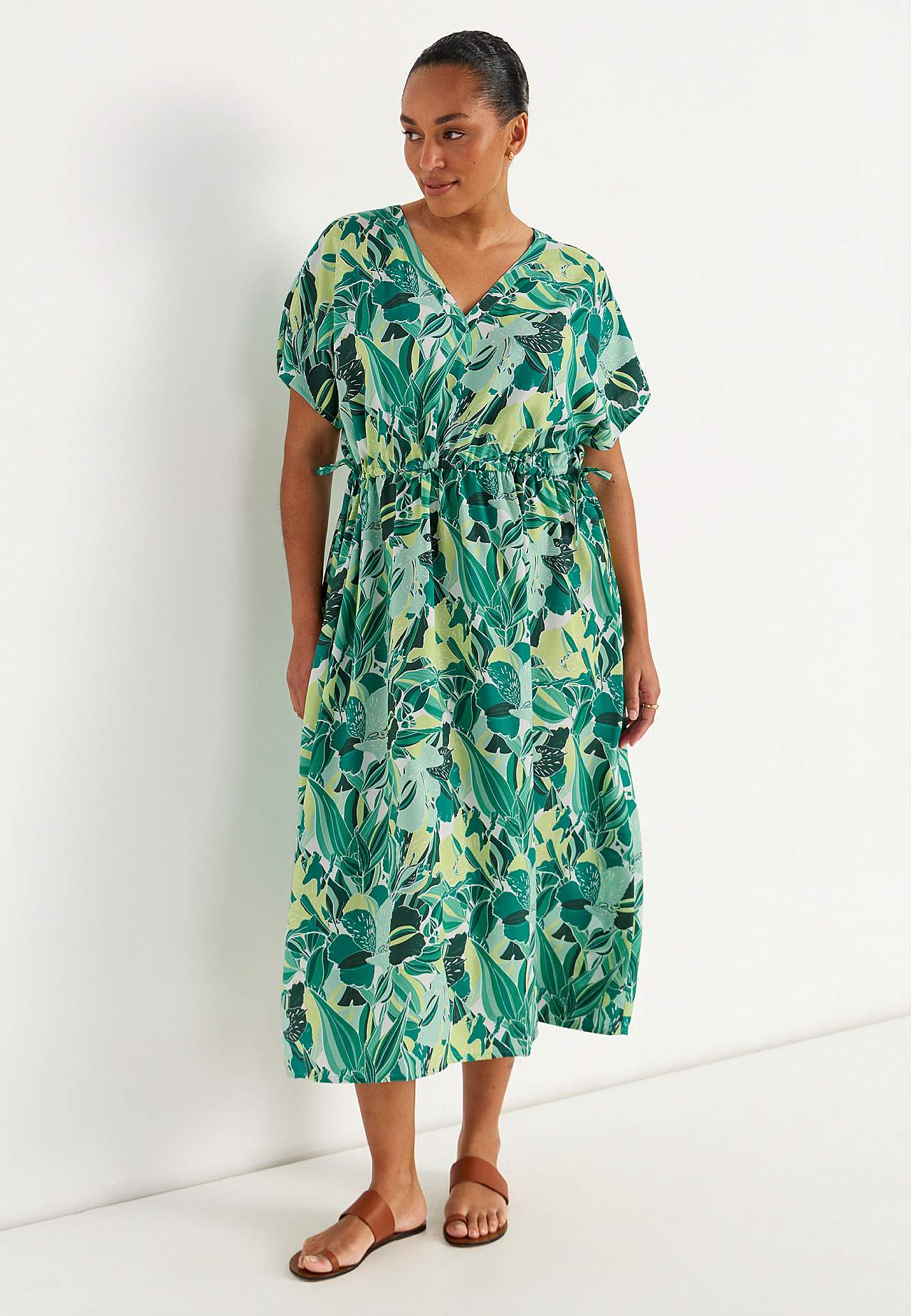 Õhuline ja jahutav mati viimistlusega materjal. Avar, lai tegumood. Laiad varrukad. Vöökohal peidetud seospael. Reguleeritav ja mõlema külje pealt seotav. Saate ise valida kas soovite avaramat või rohkem taljesse vöökohta. Kergelt ümar alläär. Seljapikkus umbes 128 cm kõikidel suurustel.