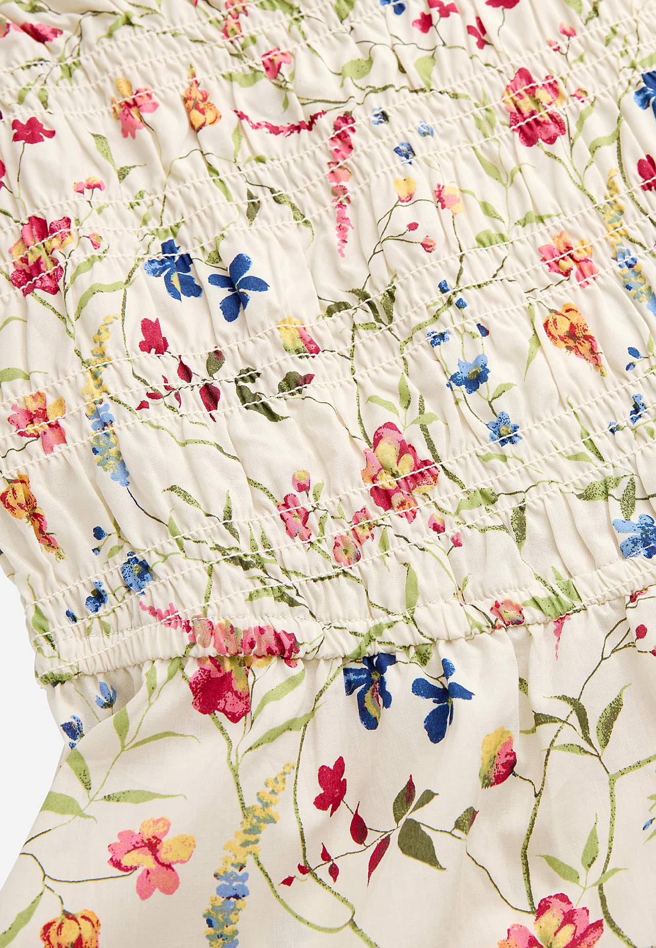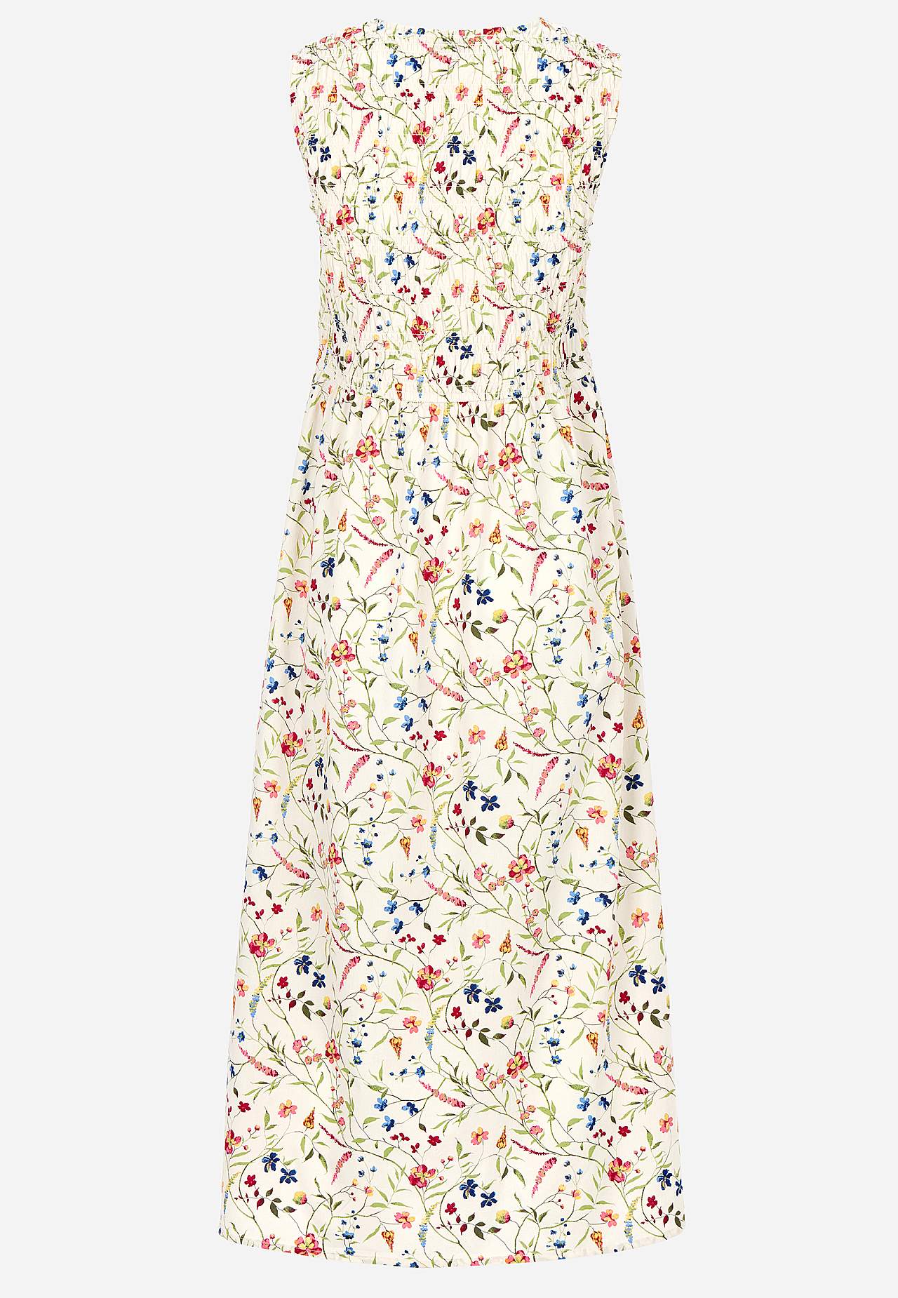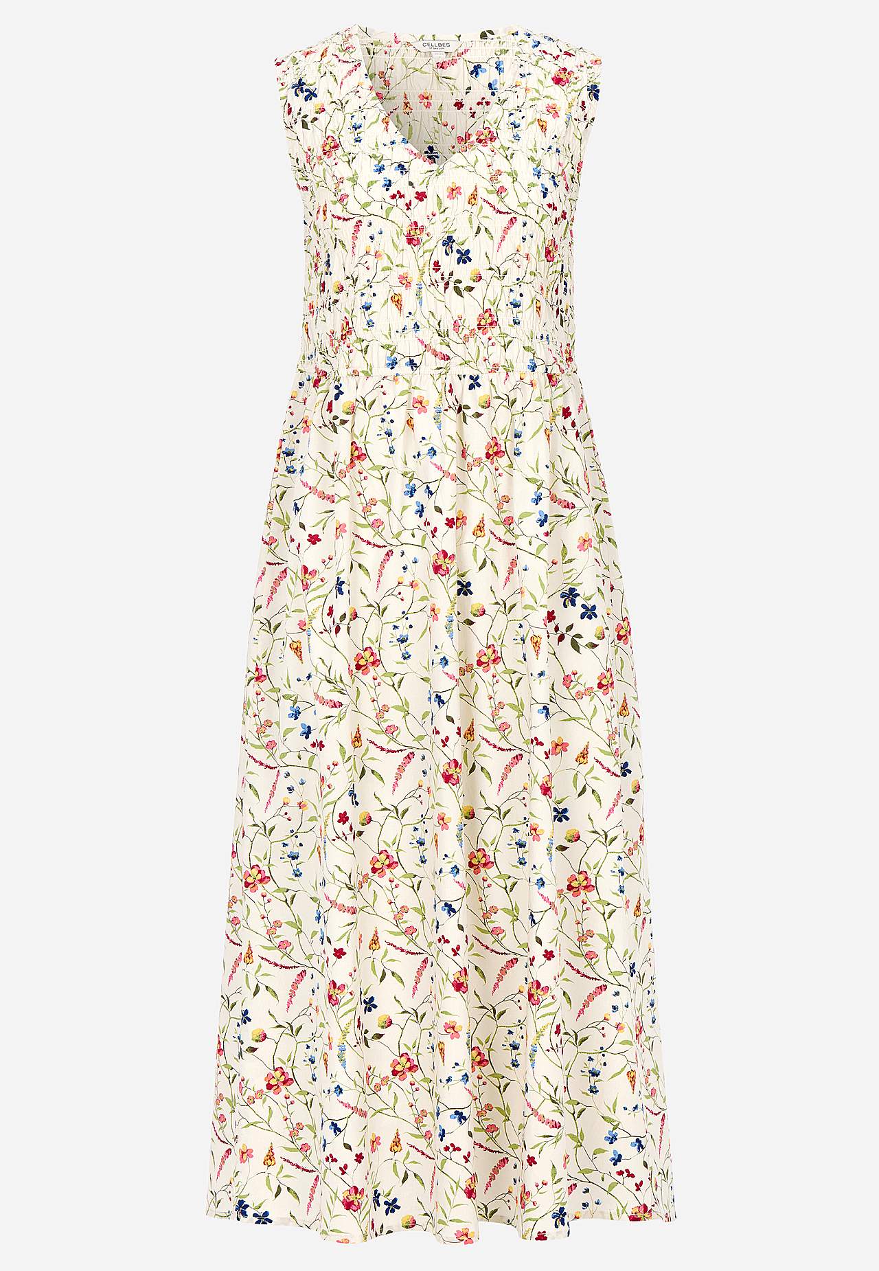 Kleit suvisteks pidustusteks. Armas, kroogitud ülaosaga, varrukateta kleit. Pehme, sileda pinnaga, kerge ja jahe popliinkangas. Elastsete kroogetega ülaosa ja laiem seelikuosa. V-kaelus. Vöökohal läbilõige. Kergelt kaarjas alläär. Seljapikkus kõikidel suurustel u. 128 cm.