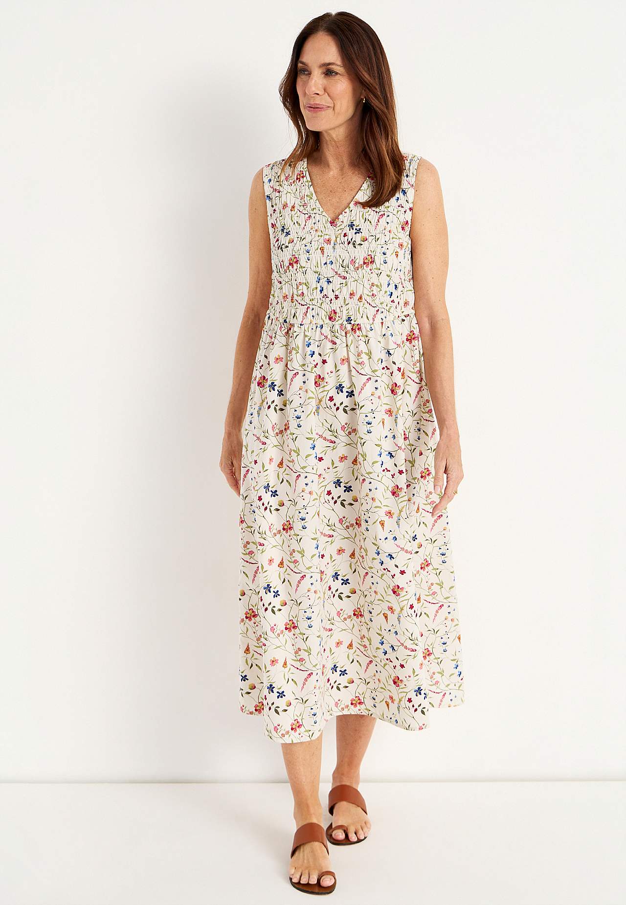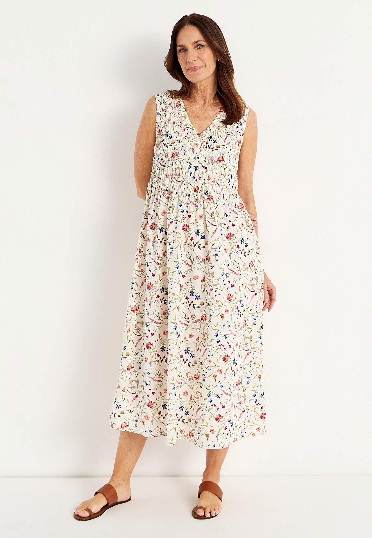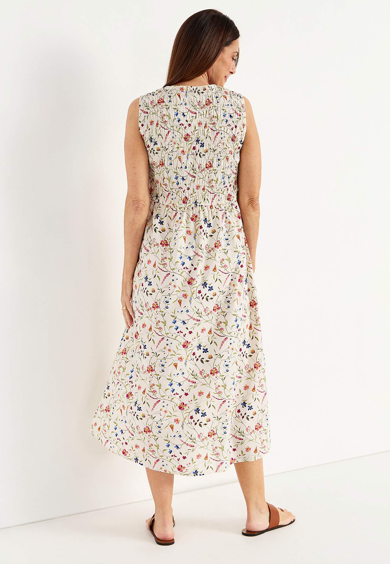 Kleit suvisteks pidustusteks. Armas, kroogitud ülaosaga, varrukateta kleit. Pehme, sileda pinnaga, kerge ja jahe popliinkangas. Elastsete kroogetega ülaosa ja laiem seelikuosa. V-kaelus. Vöökohal läbilõige. Kergelt kaarjas alläär. Seljapikkus kõikidel suurustel u. 128 cm.