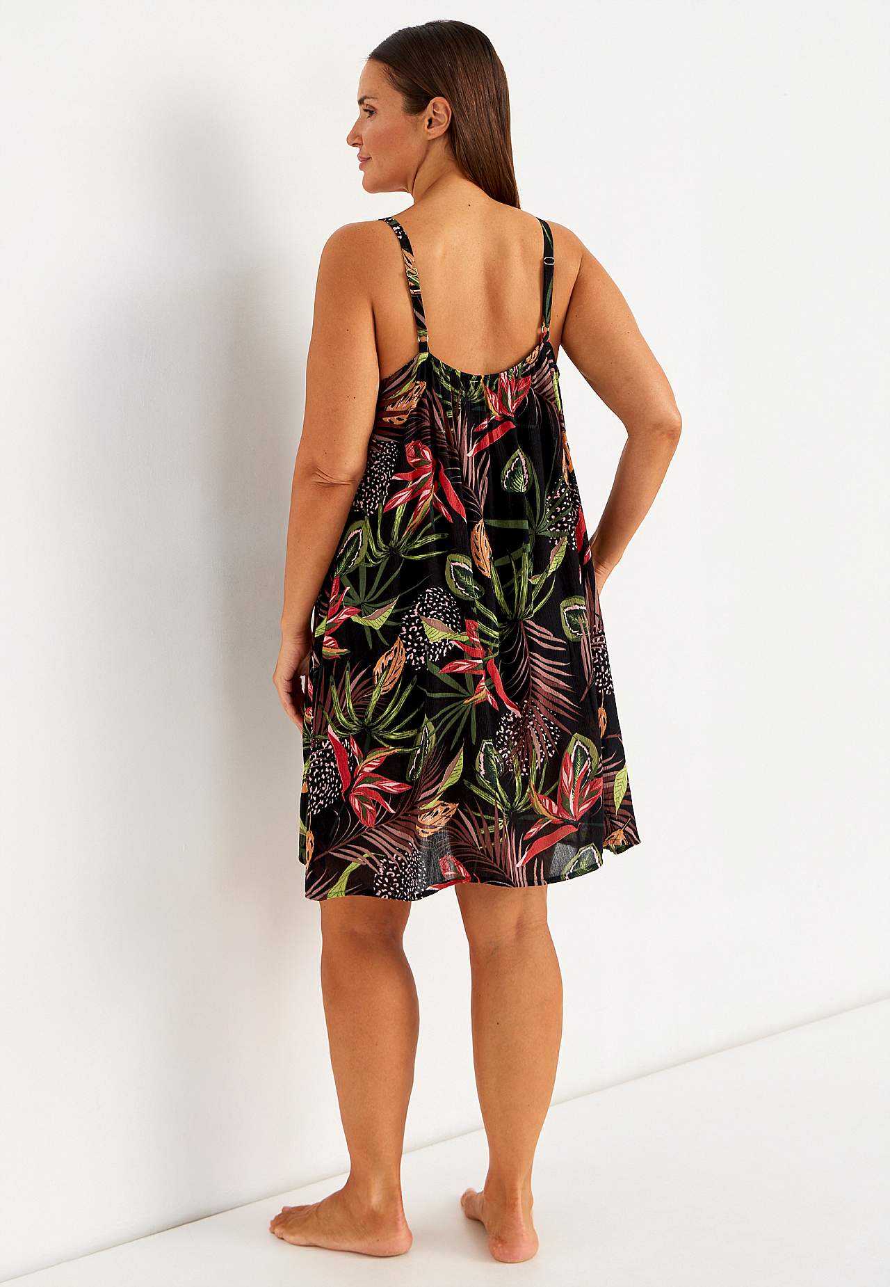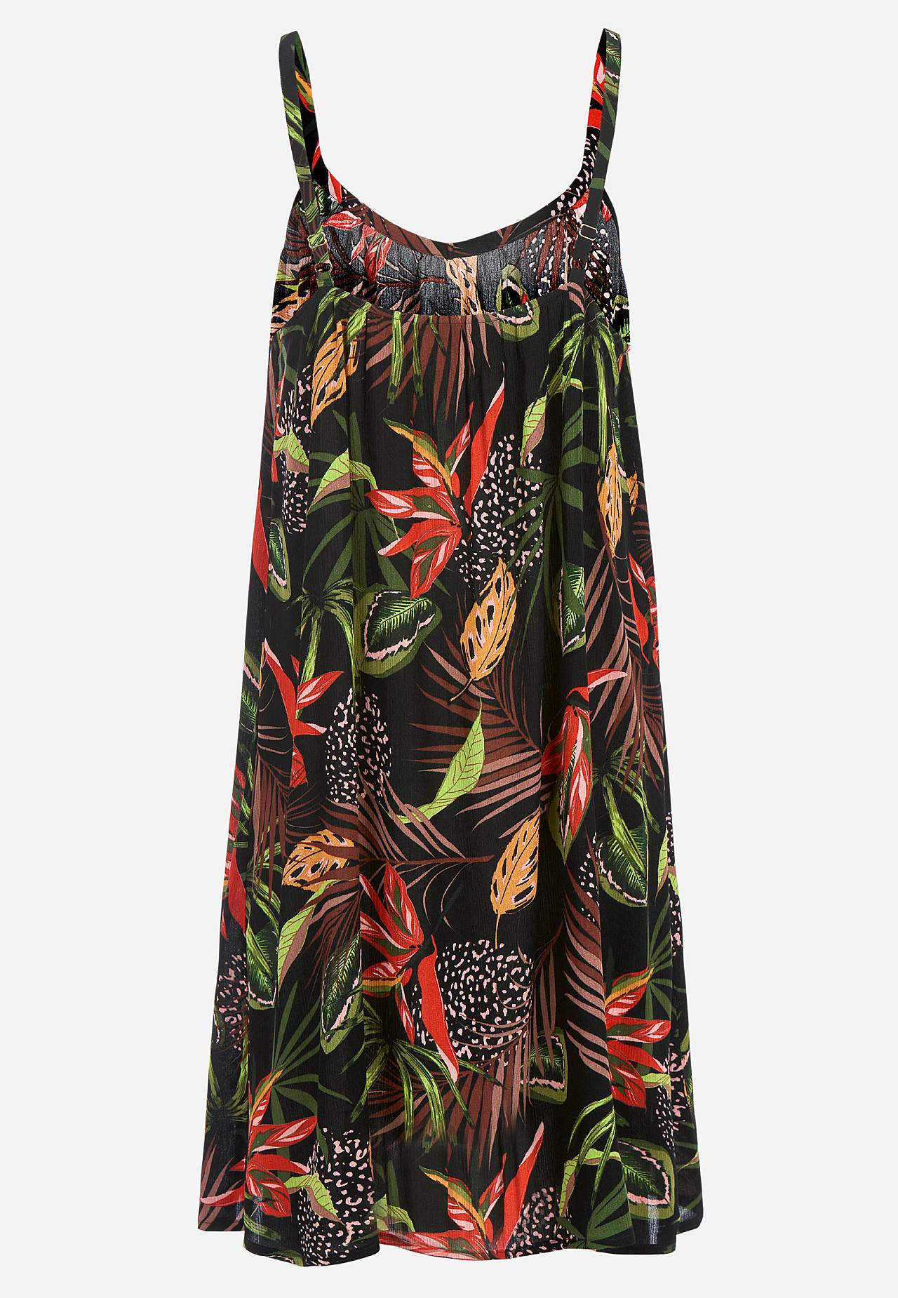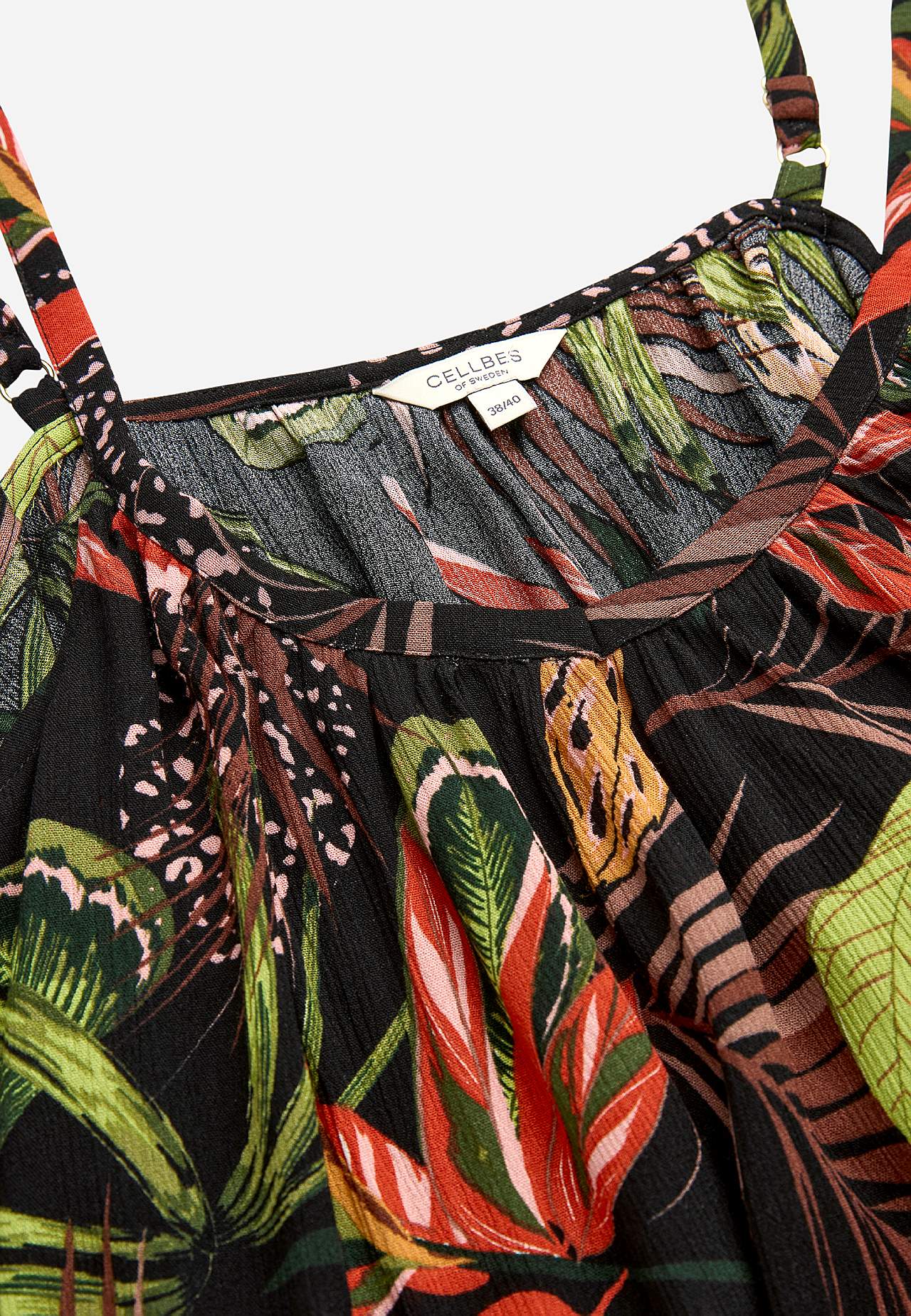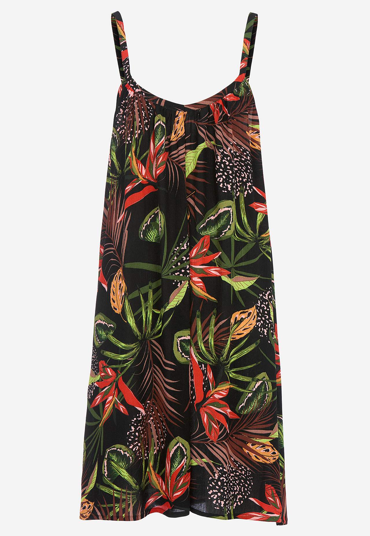 Õlapaeltega, viskooskreppkangast kleit. Õhuline ja pehme materjal. Mõnus, avar A-lõikeline. Reguleeritavad õlapaelad. Kergelt kaarjas alläär. Seljapikkus vastavalt suurusele u 69-76 cm.