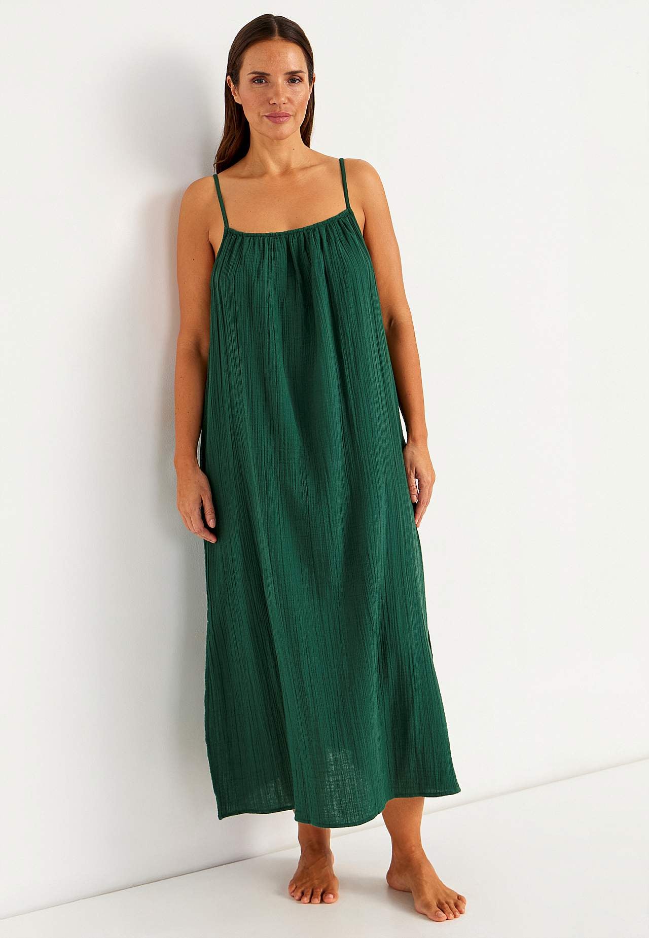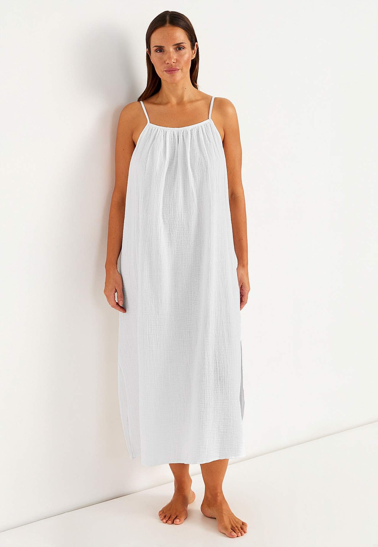 Naturaalse tekstuuriga puuvillasest musliinist kleit. Õhuline ja pehme, jaheda tundega materjal. Avar, sirge lõige. Kitsad reguleeritavad õlapaelad. Sirge alläär, külgedel pikad lõhikud. Pikkus eest keskelt vastavalt suurusele u 114-121 cm.