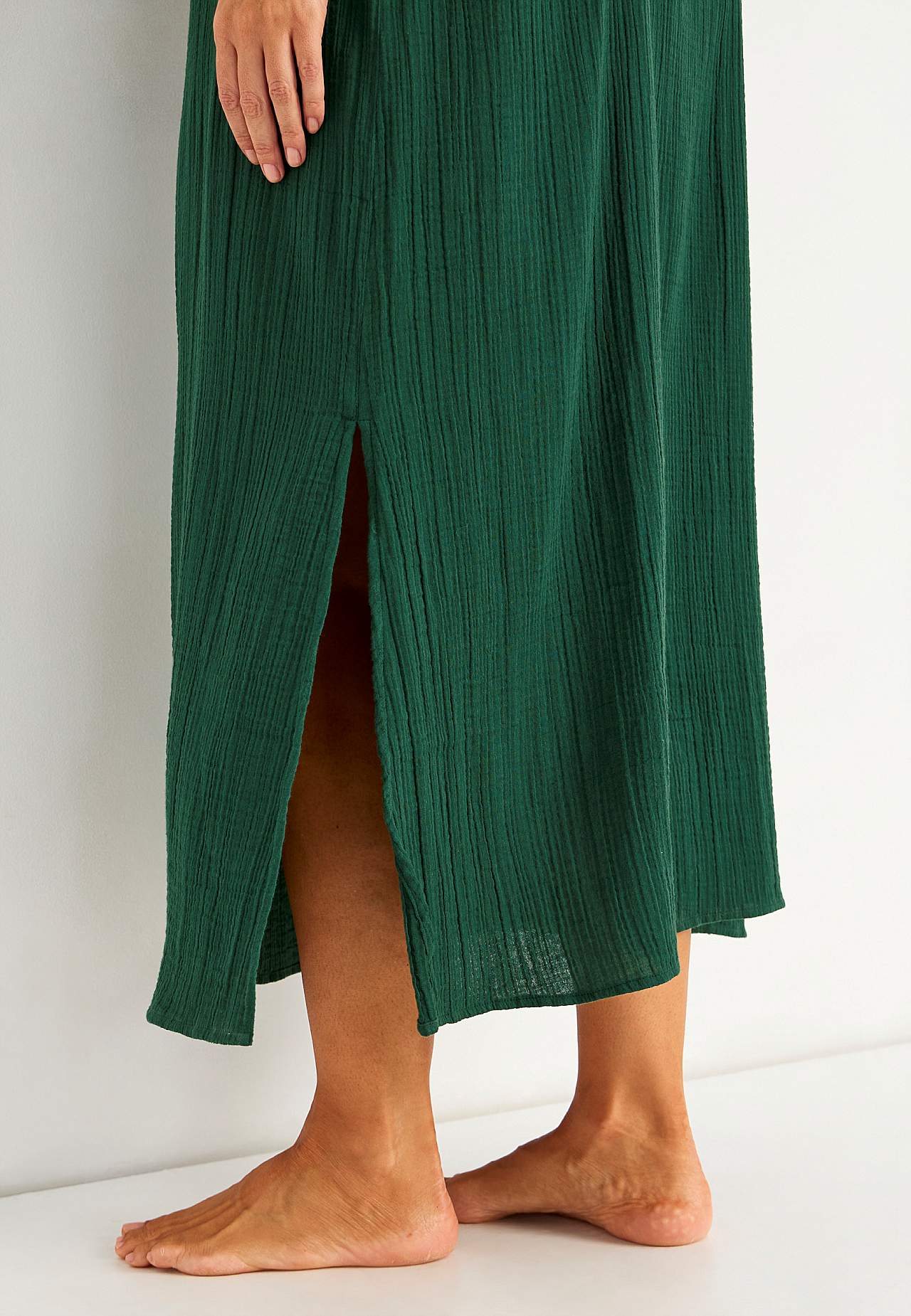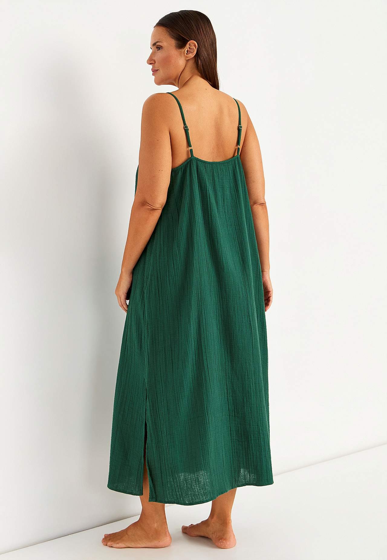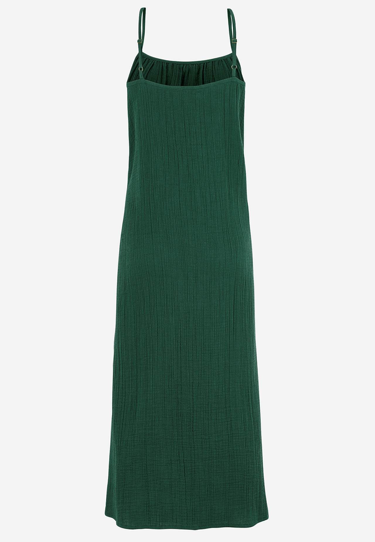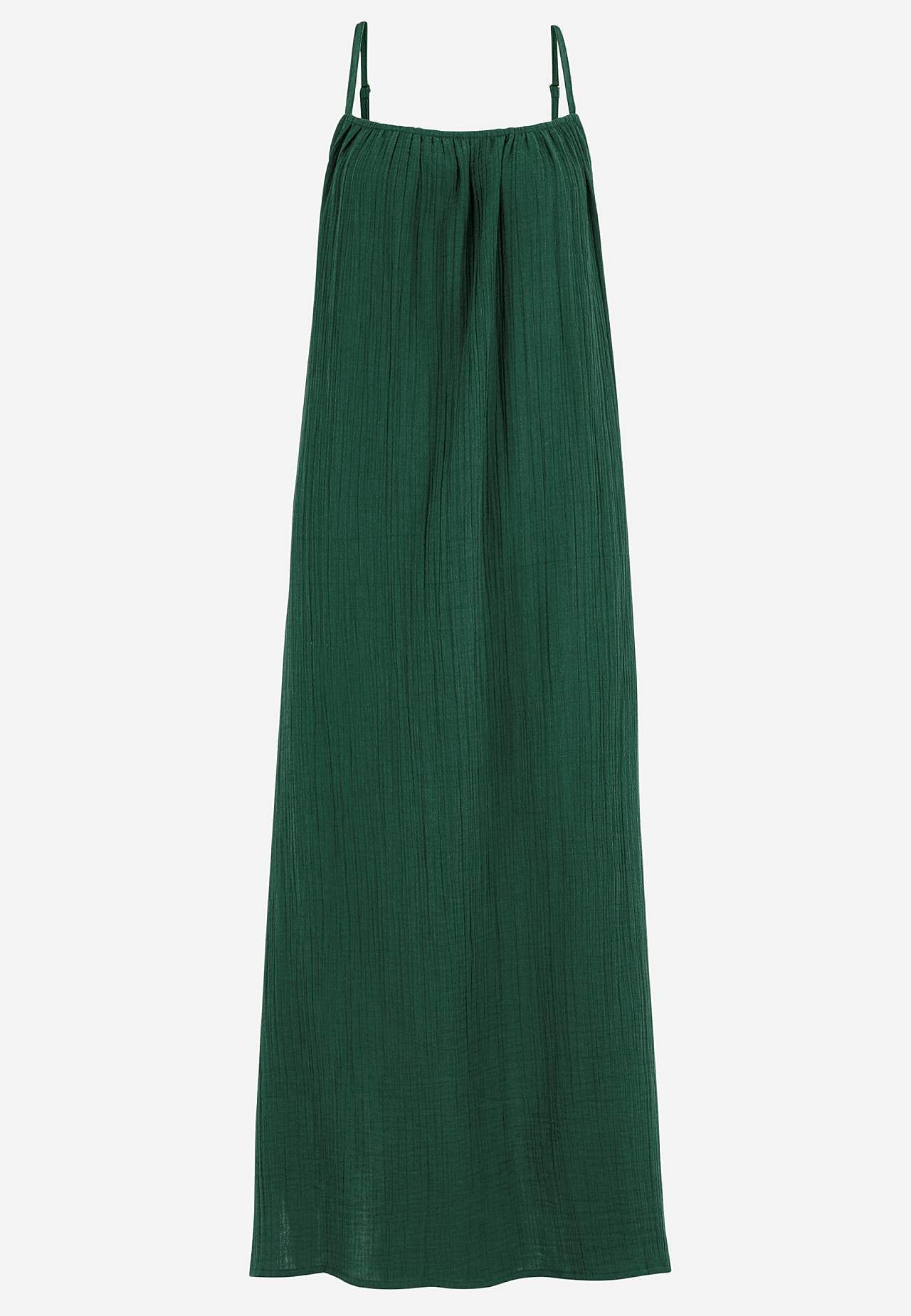 Naturaalse tekstuuriga puuvillasest musliinist kleit. Õhuline ja pehme, jaheda tundega materjal. Avar, sirge lõige. Kitsad reguleeritavad õlapaelad. Sirge alläär, külgedel pikad lõhikud. Pikkus eest keskelt vastavalt suurusele u 114-121 cm.