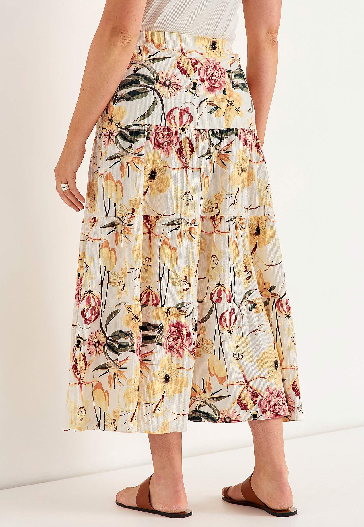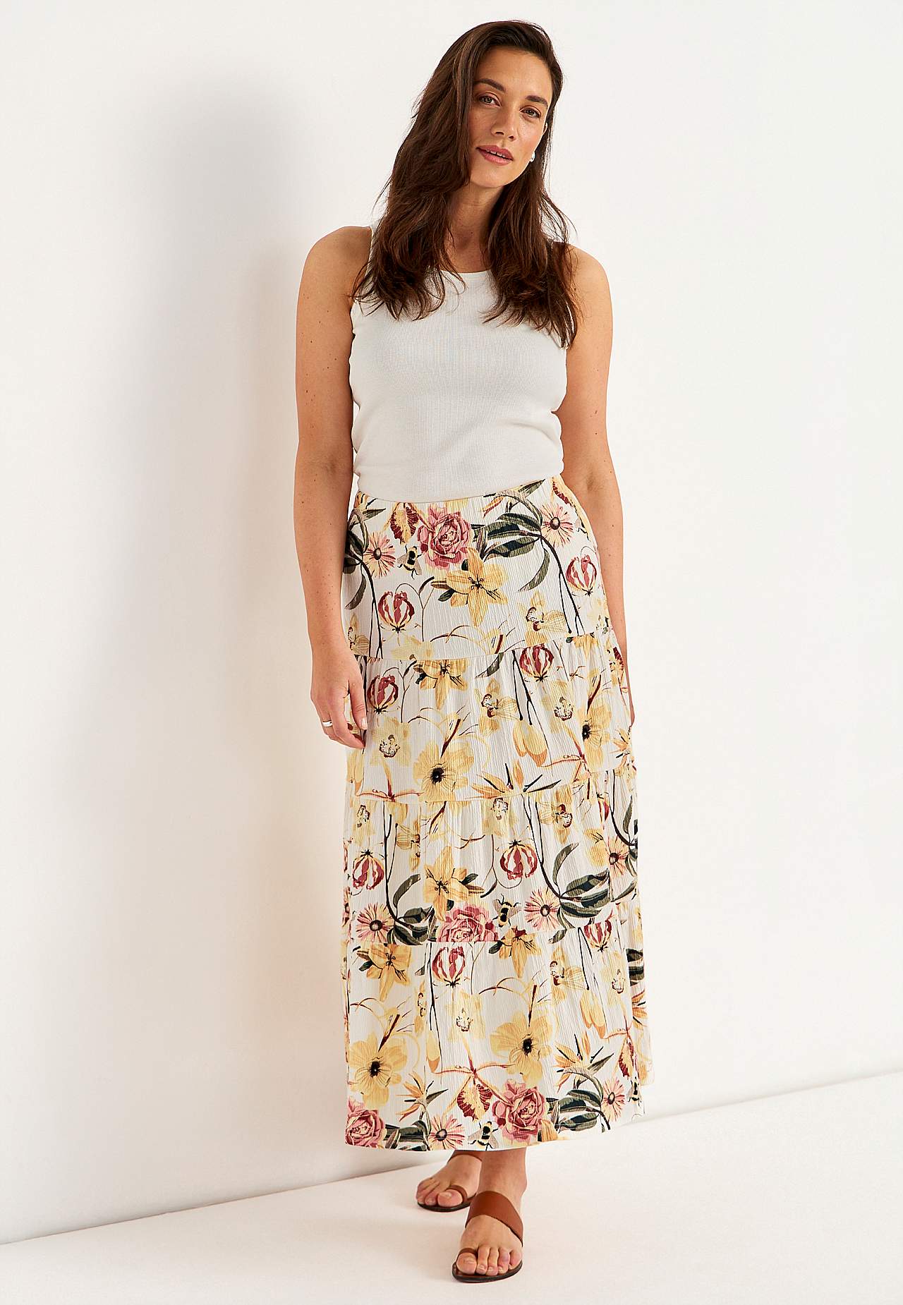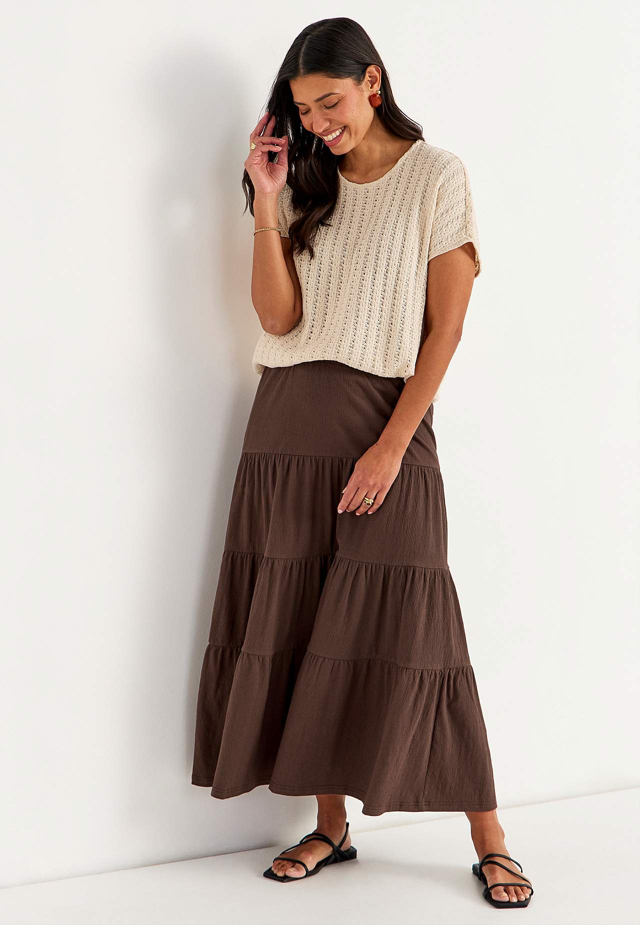 Pehme ja elastne, kortsulise struktuuriga materjalist seelik. Avaram, A-lõikeline. Pehme ja elastne värvel. Kaarjas alläär. Sobita tootega 701369. Pikkus: 90 cm.