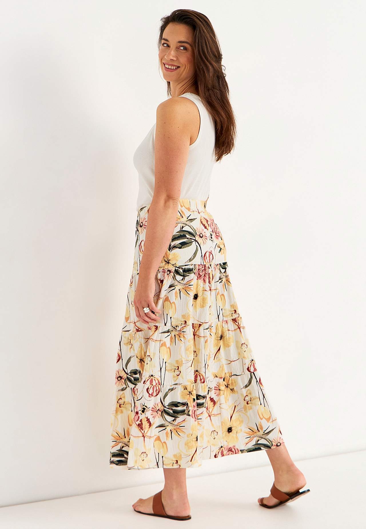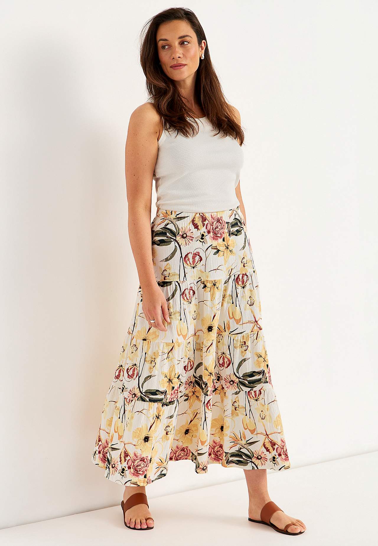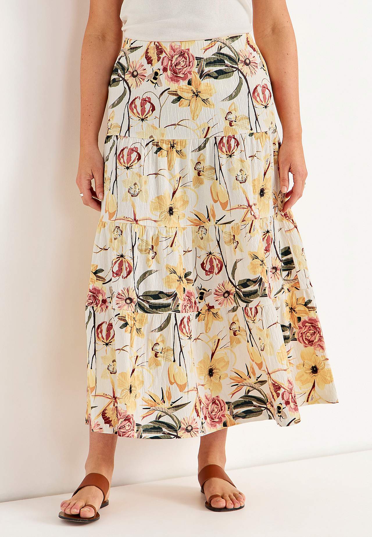 Pehme ja elastne, kortsulise struktuuriga materjalist seelik. Avaram, A-lõikeline. Pehme ja elastne värvel. Kaarjas alläär. Sobita tootega 701369. Pikkus: 90 cm.