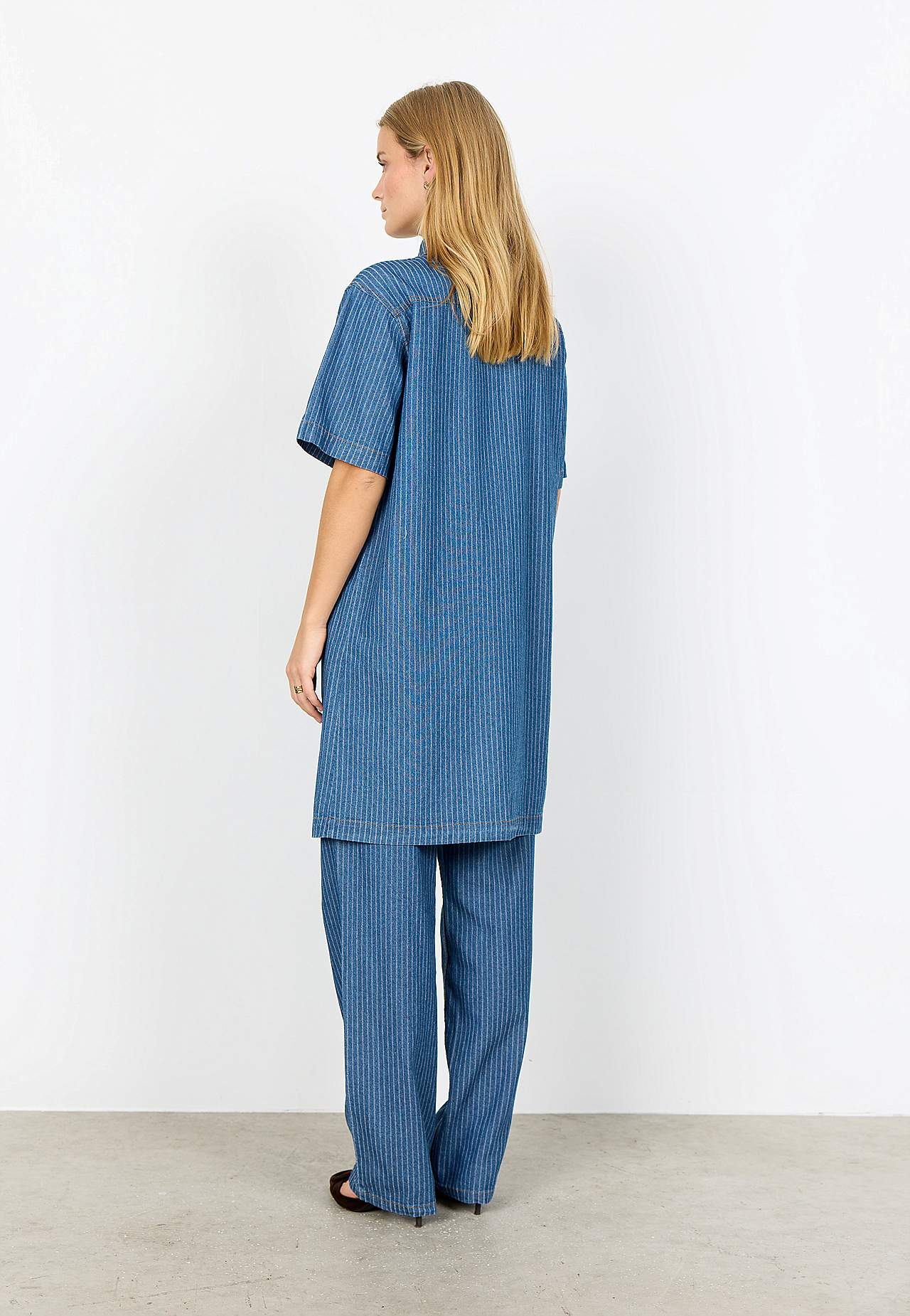 Mugavast teksamaterjalist triibuline kleit. Sirge, avar tegumood. Klassikaline särkkrae, nööpidega mudel. Kaks rinnataskut. Taga passe. Lühikesed ja laiad varrukad. Sirge alläär. Pikkus õlast u 90 cm suurusel S (38).