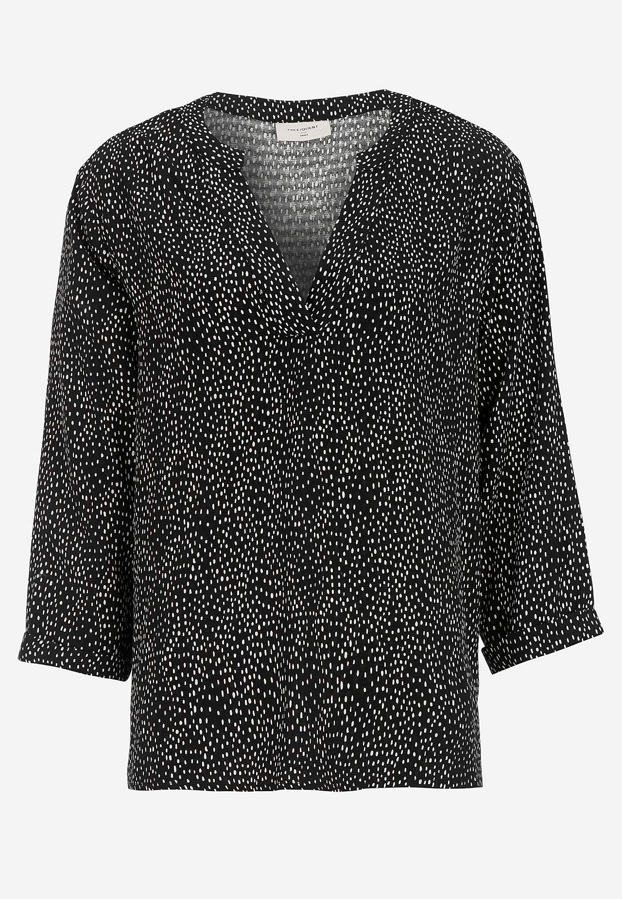 Žakaarkoes mustriline pluus. Pehmest ja jahutavast viskoosist. Avaram mudel. Ümar kaelus V-kaelusega. Kolmveerandpikkuses üleskeeratavad varrukad. Sirge alläär on tagant veidi pikem, külgedel lõhikud. Pikkus õlast u 68 cm suurusel S (38).