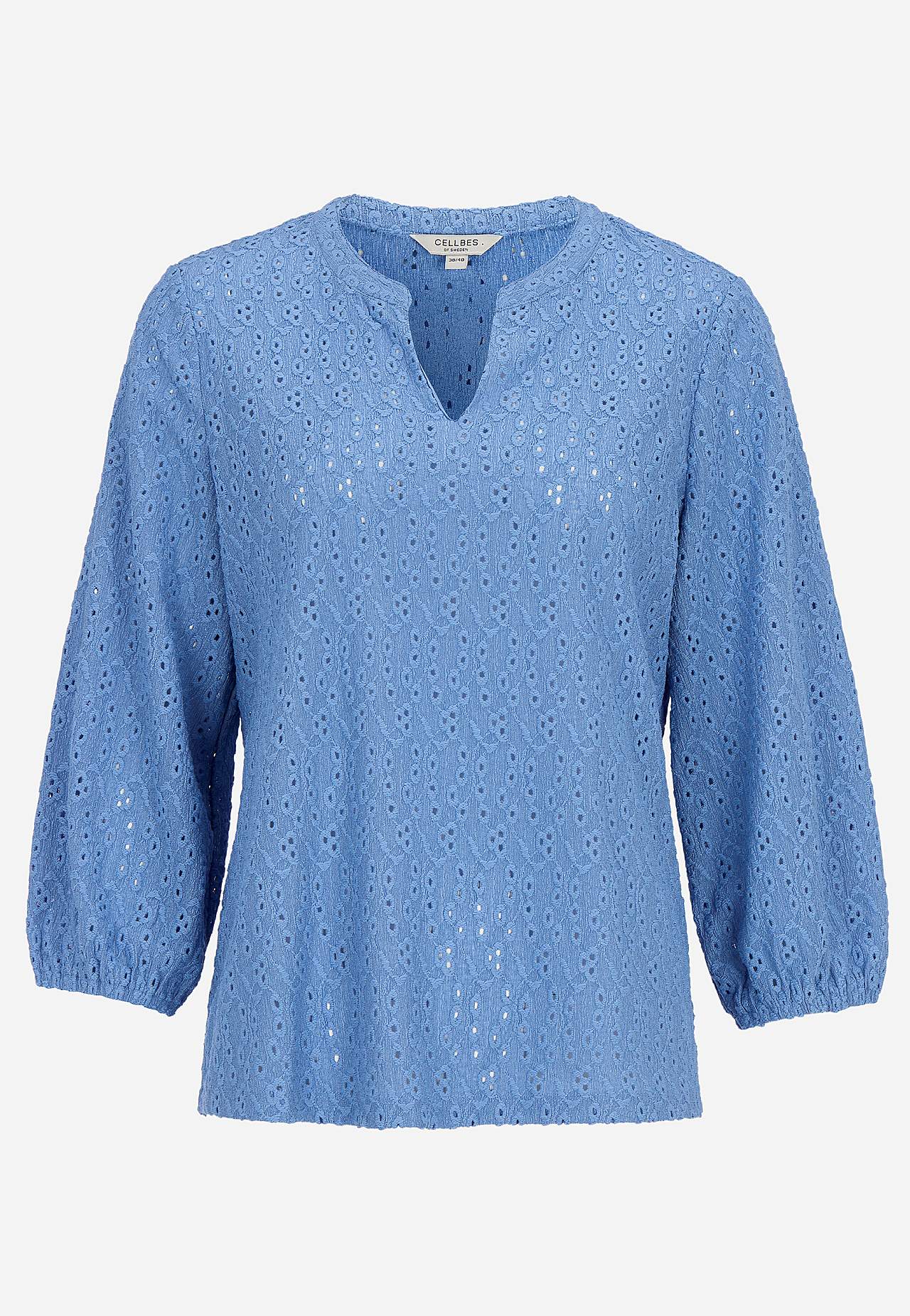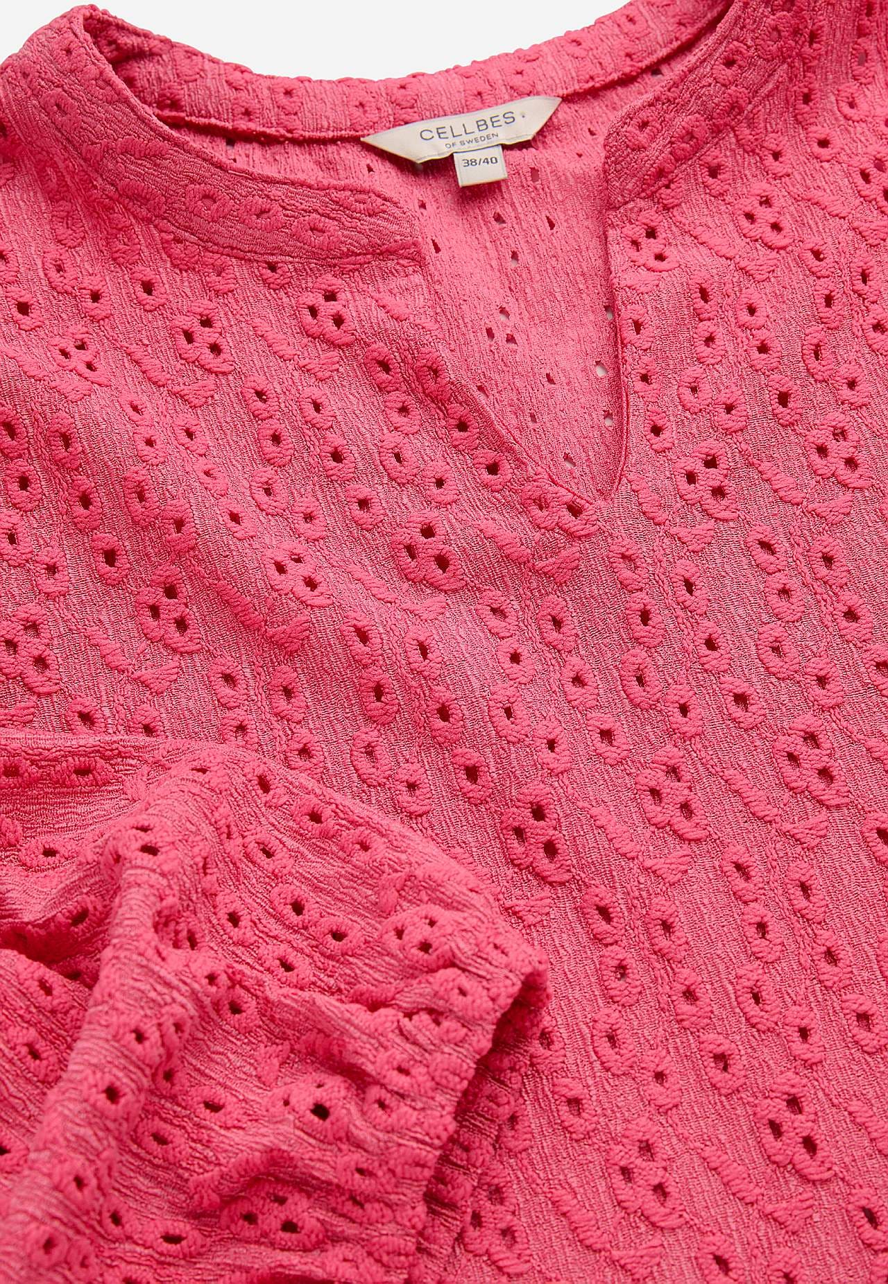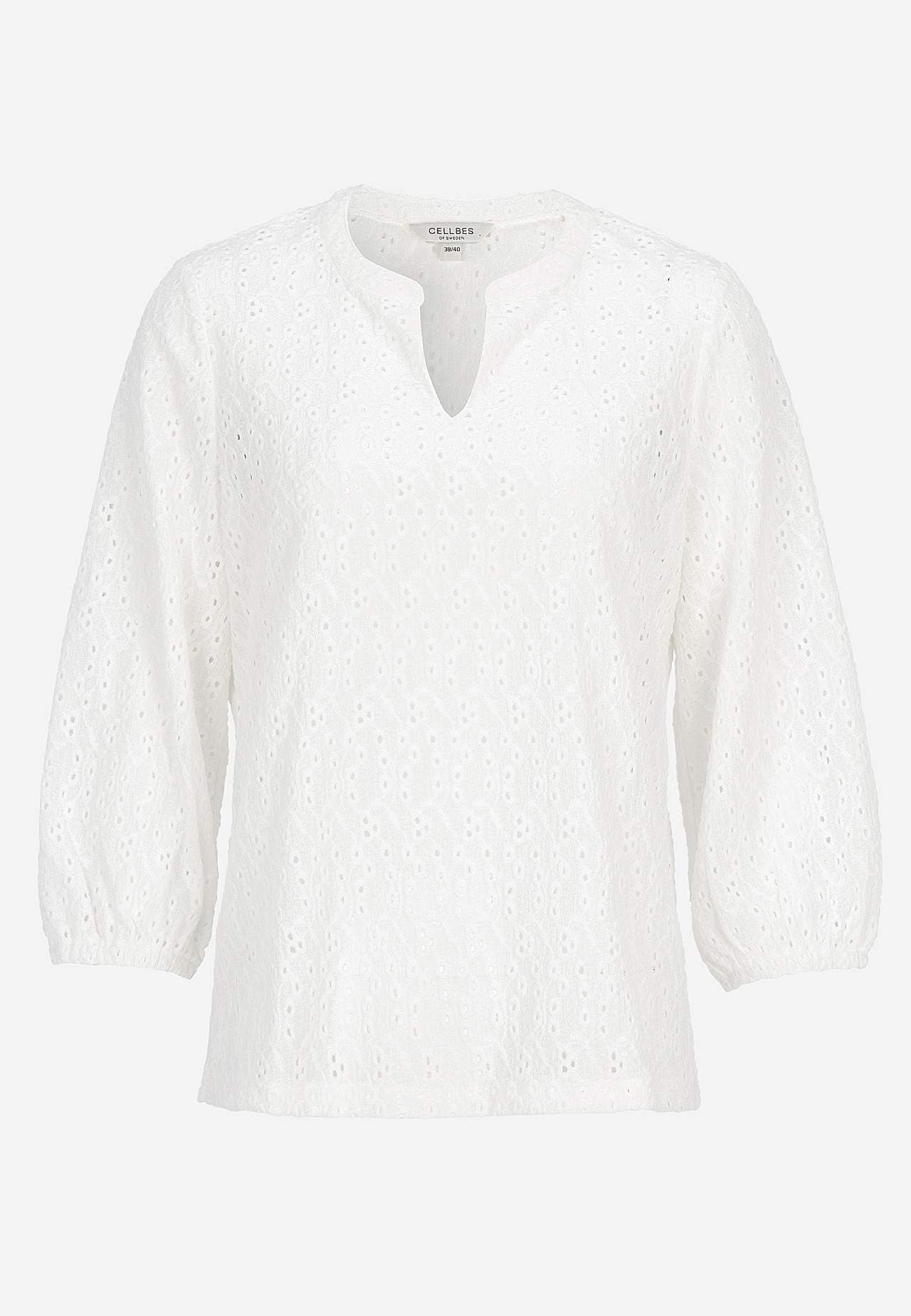 Struktuurse mustriga, broderiitikandiga trikotaažist topp. A-lõikeline tegumood. V-lõikega ümar kaelus. 3/4 pikkusega varrukad, mille otstes kummiga mansett. Kergelt kaarjas alläär. Seljapikkus vastavalt suurusele umbes 61-75 cm.