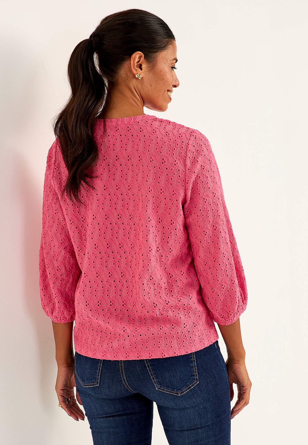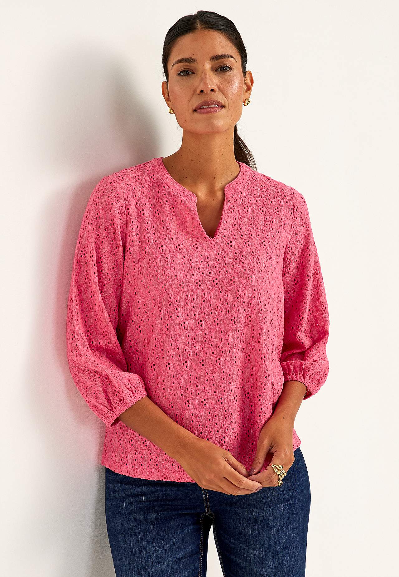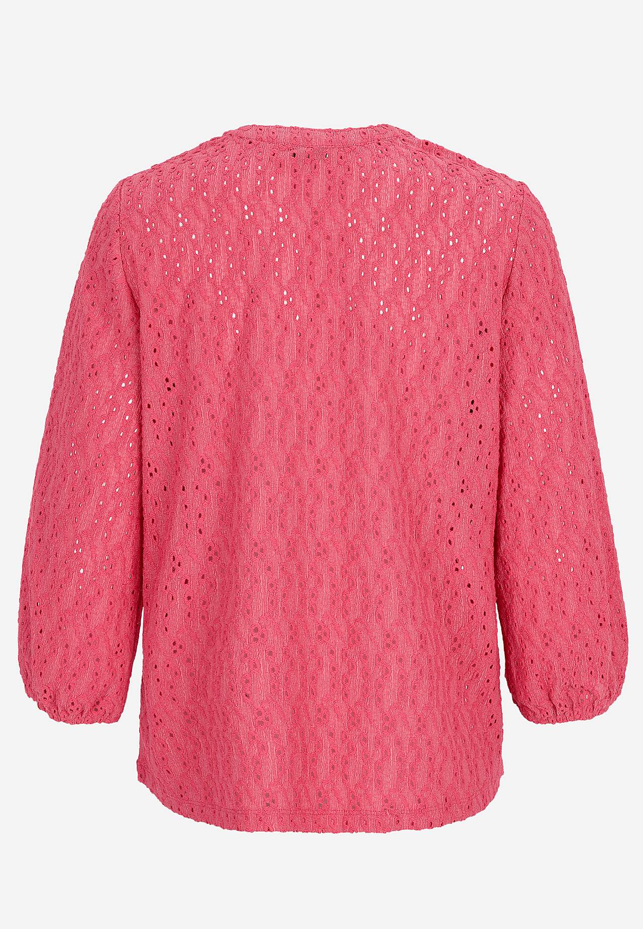 Struktuurse mustriga, broderiitikandiga trikotaažist topp. A-lõikeline tegumood. V-lõikega ümar kaelus. 3/4 pikkusega varrukad, mille otstes kummiga mansett. Kergelt kaarjas alläär. Seljapikkus vastavalt suurusele umbes 61-75 cm.