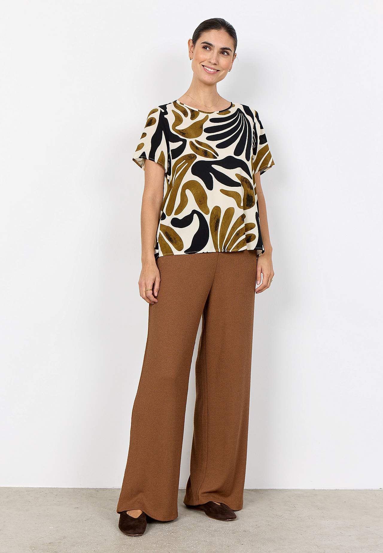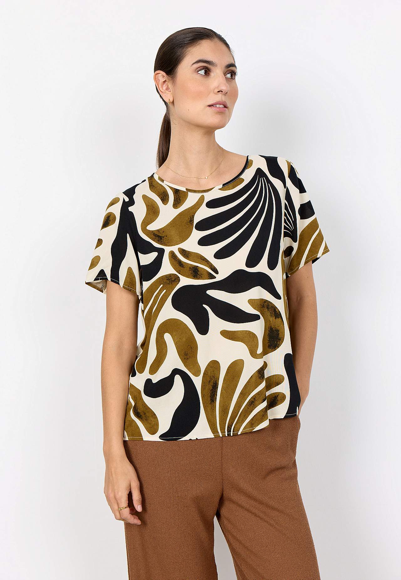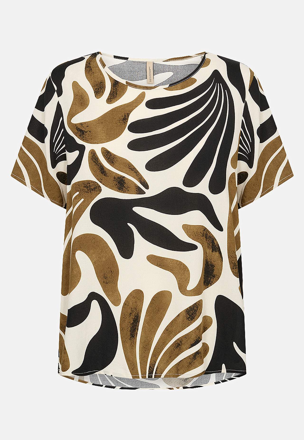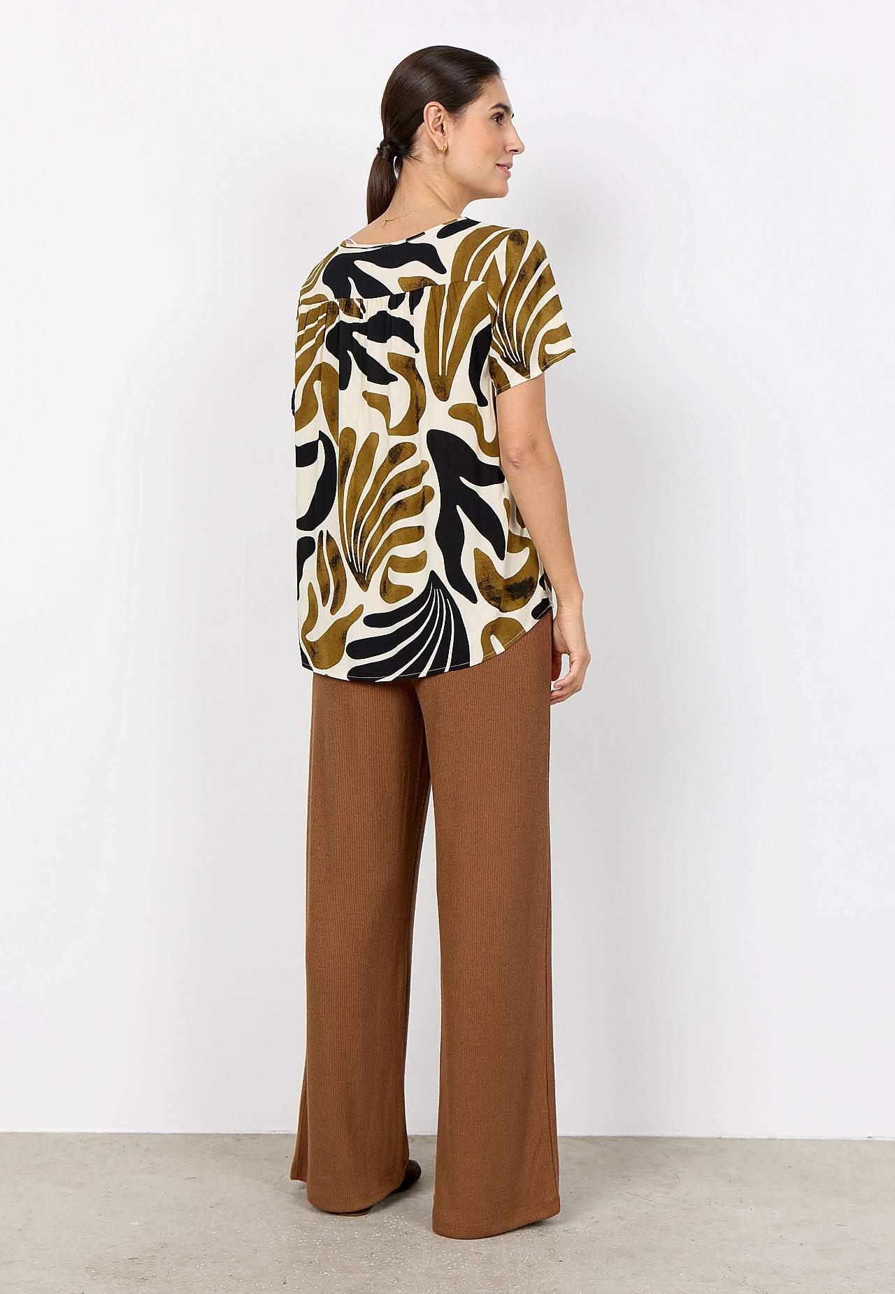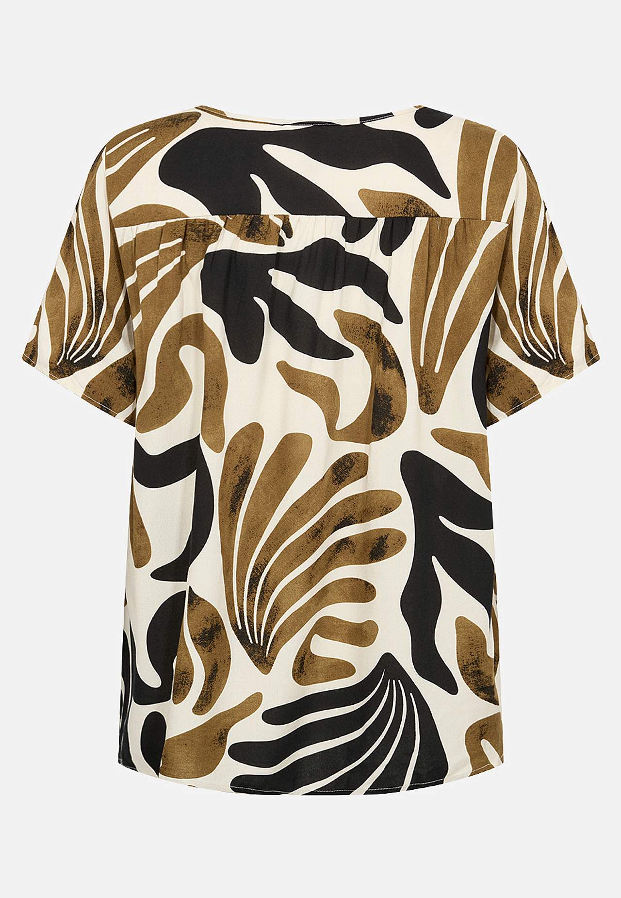 Jahedast ja pehmest viskoosist pluus. Stiilne muster. Tavasuurus. Ümar kaelus. Lühikesed varrukad. Taga passe ja krooked. Kergelt kaarjas, tagant veidi pikem alläär. Pikkus õlast u 60 cm suurusel M (40).