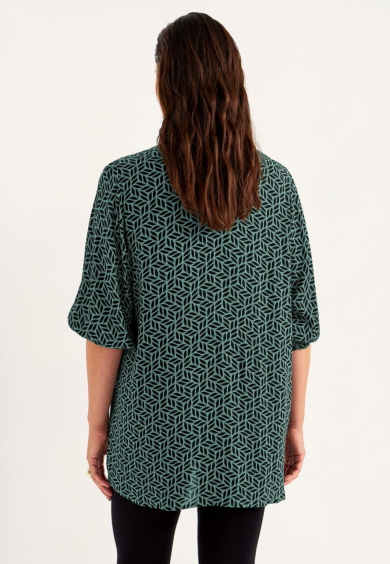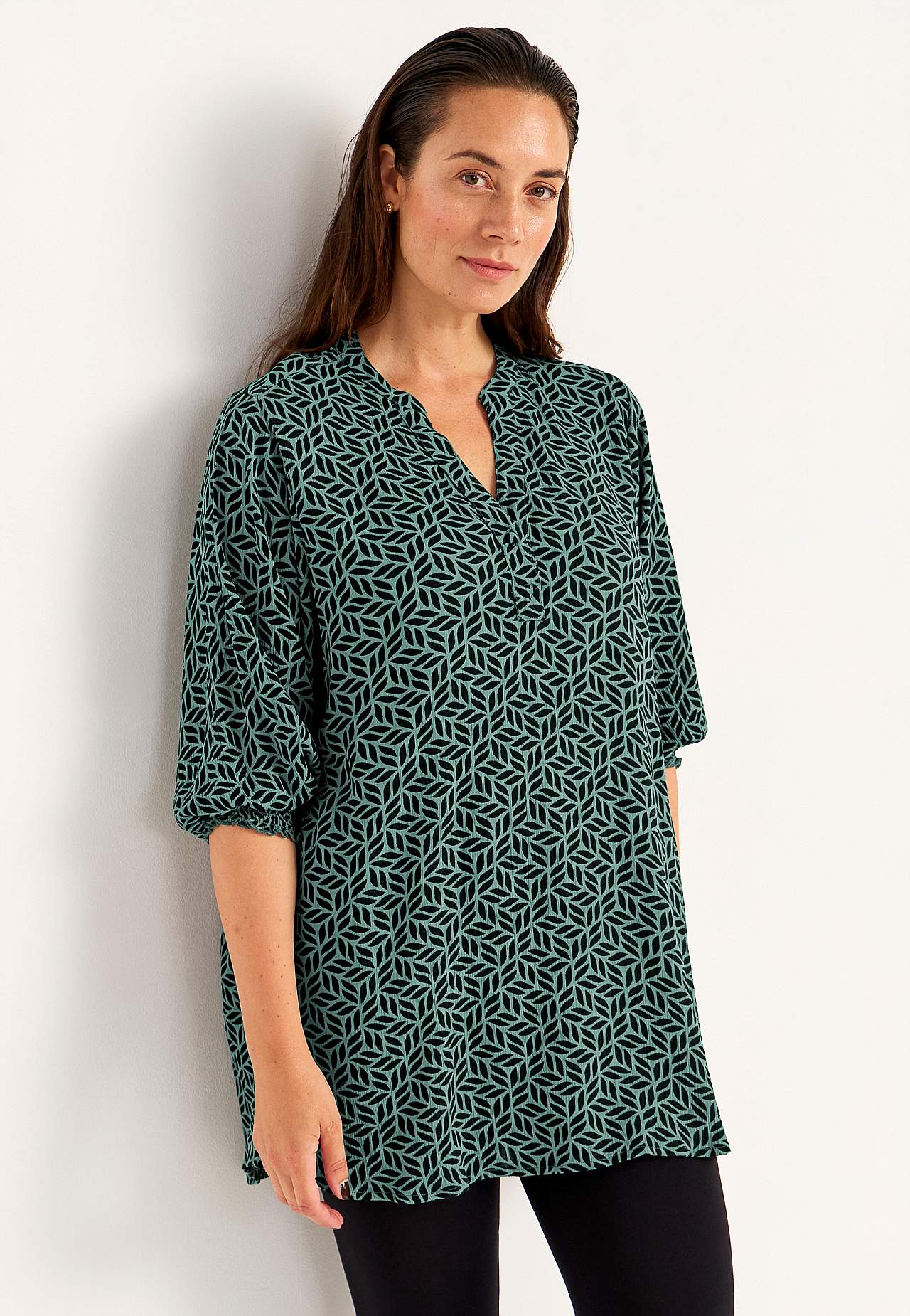 Kreppkangast tuunika. Avar lõige. 3/4 pikkuses varrukatel on elastsed mansetid. Pikkus õlast vastavalt suurusele u 78-88 cm.