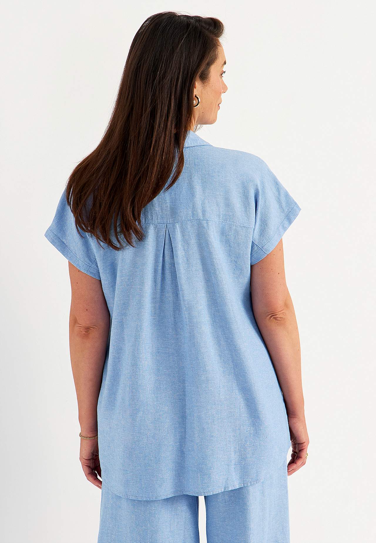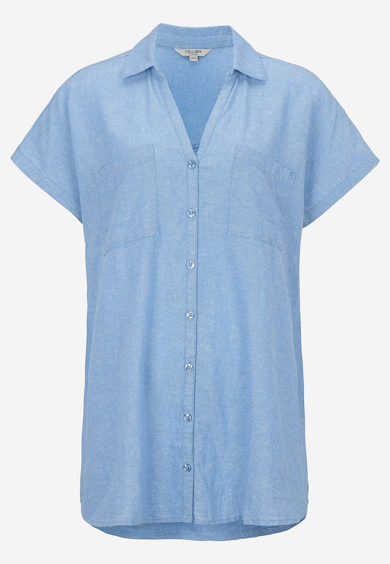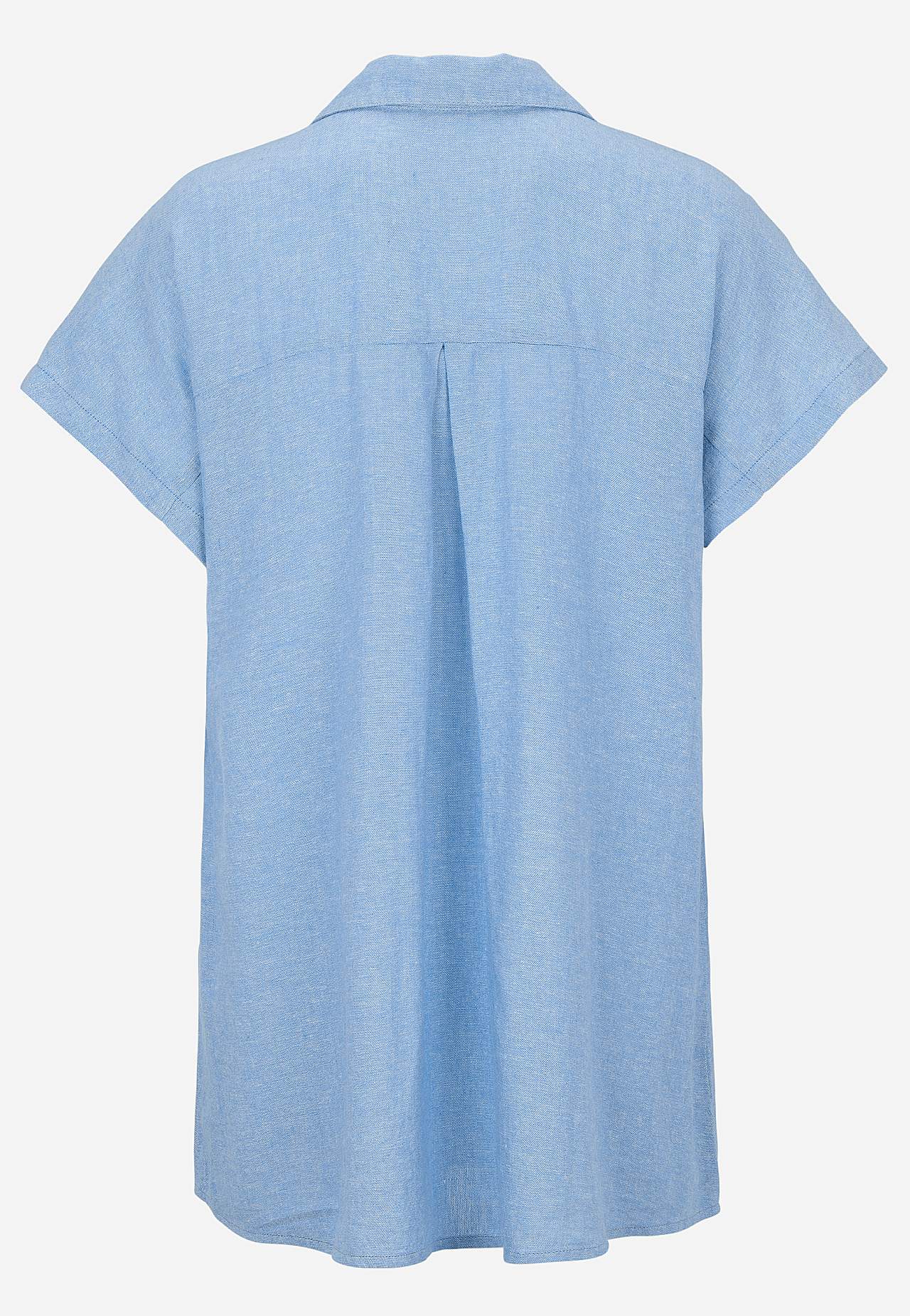 Mõnusast lina- ja viskoosisegusest materjalist tuunika. Avaram mudel. Rinnataskud. Taga dekoratiivne volt ja passe. Kaarjas alläär. Pikkus õlast u 77-84 cm.