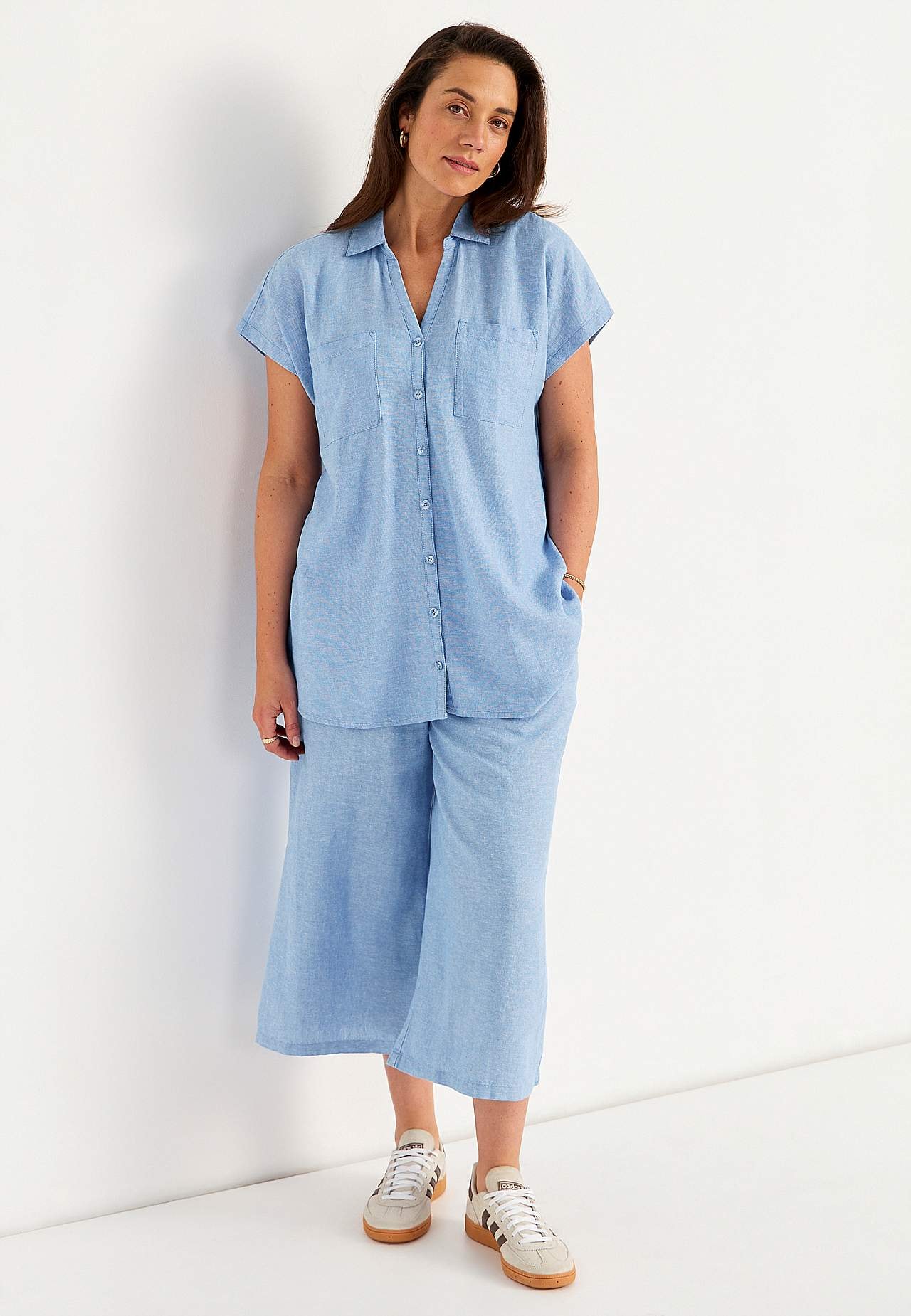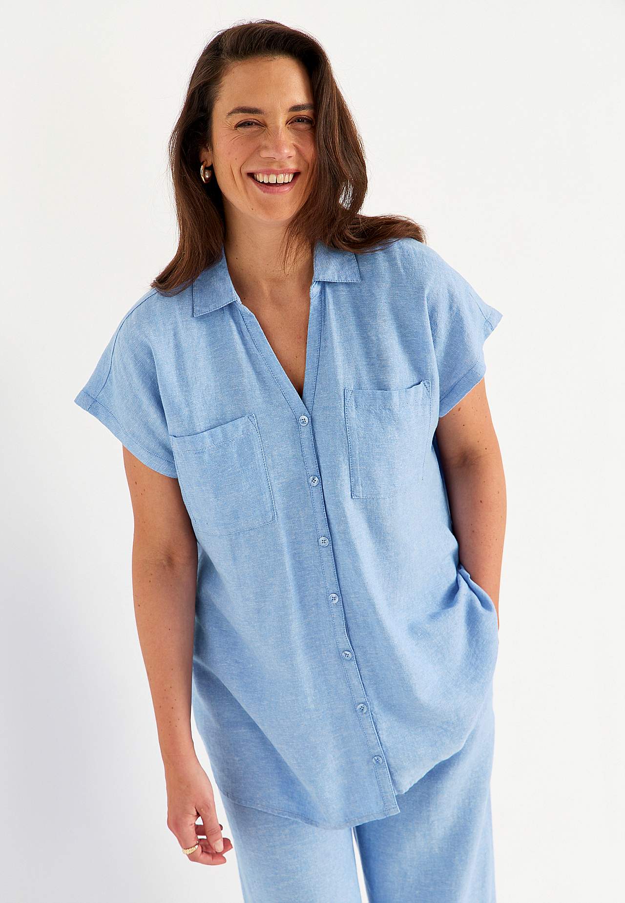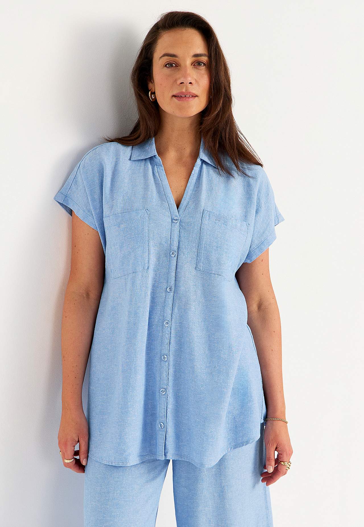 Mõnusast lina- ja viskoosisegusest materjalist tuunika. Avaram mudel. Rinnataskud. Taga dekoratiivne volt ja passe. Kaarjas alläär. Pikkus õlast u 77-84 cm.