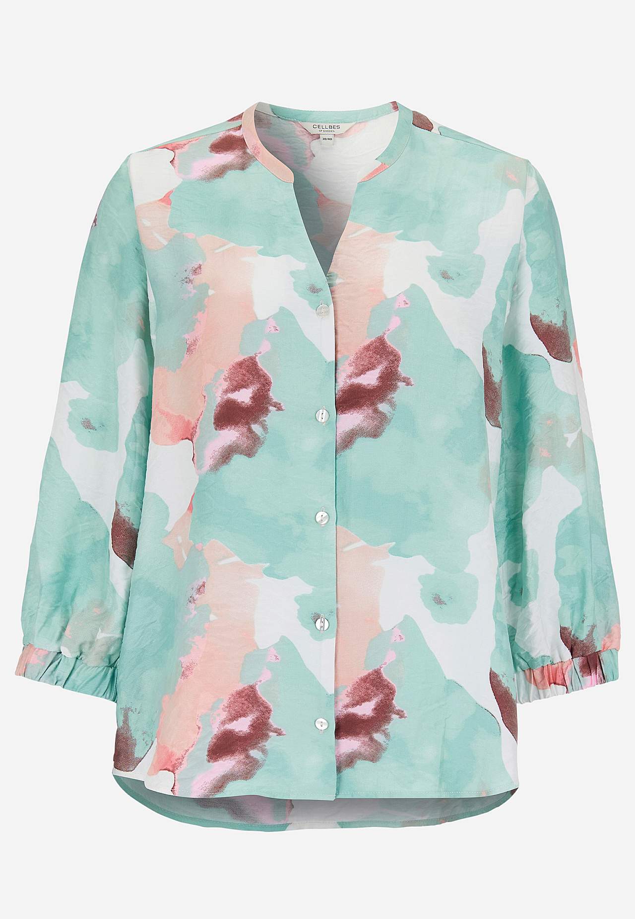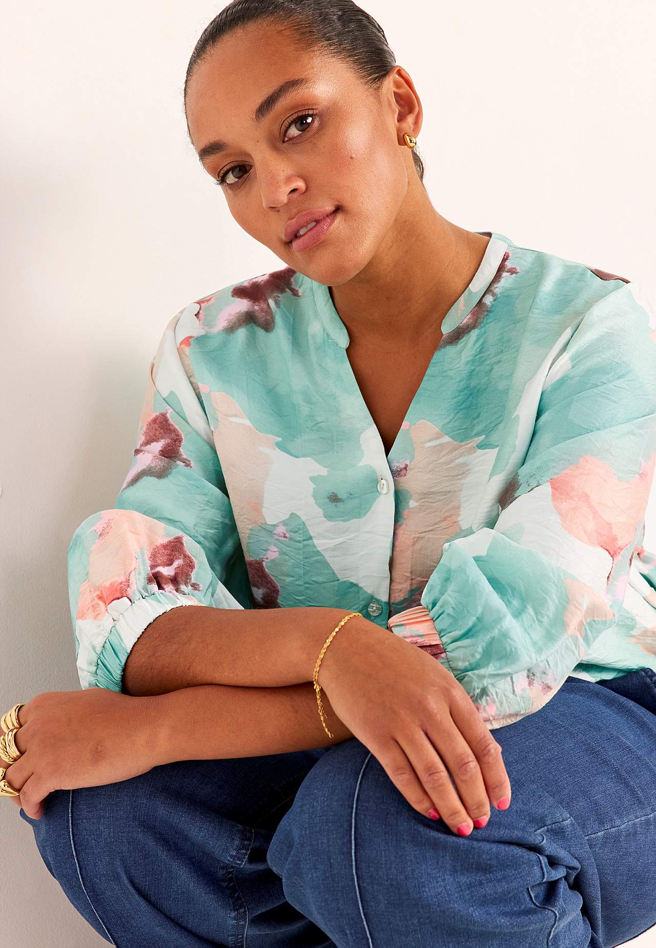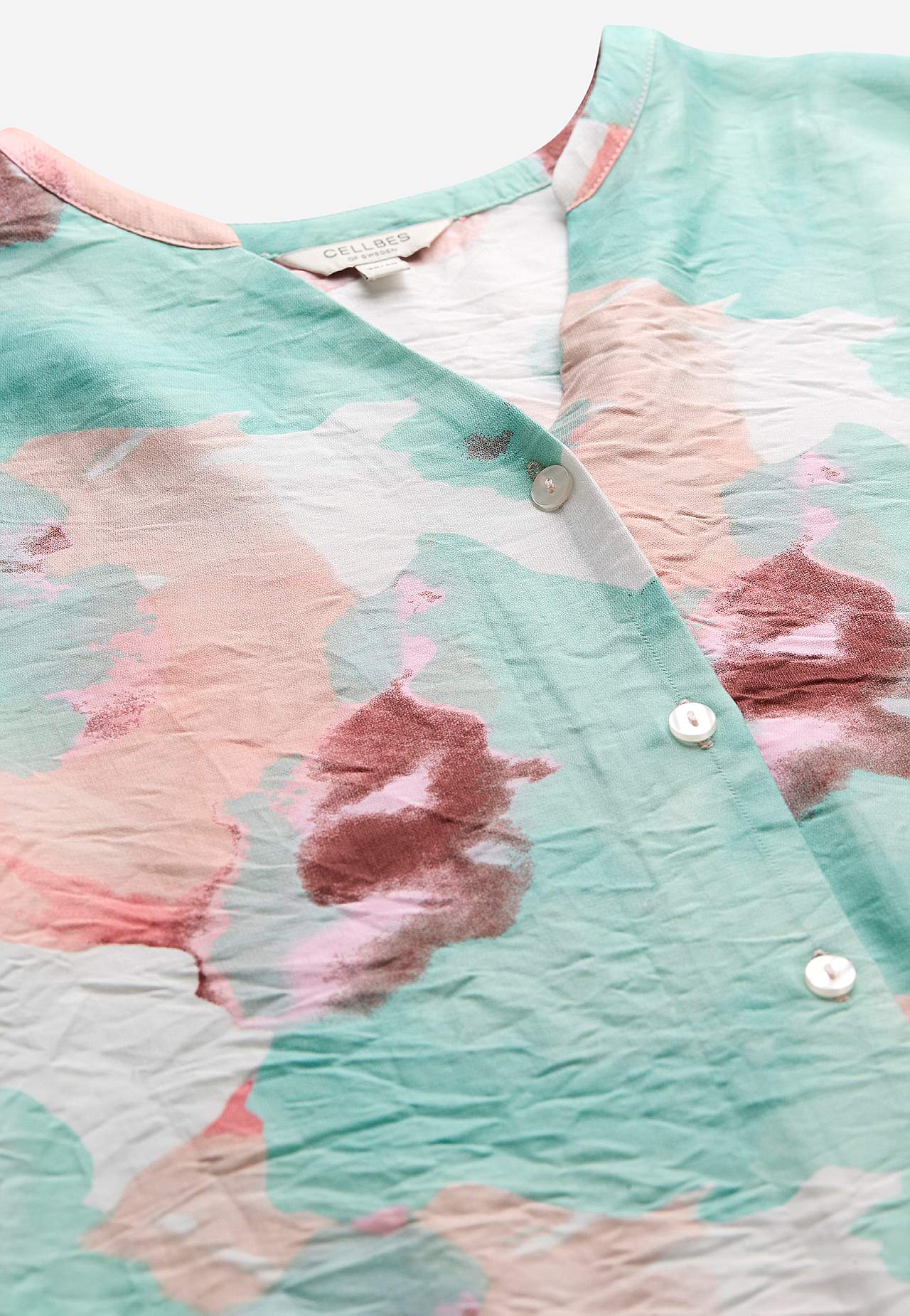Viskoosist pluus veidi läikivamast struktureeritud kangast. Mugava lõikega ja jahe tunne. Tavasuurus. Ümar V-kaelus. Nööpkinnis viie väikese nööbiga. Kergelt kaarjas alläär. Pikkus õlast vastavalt suurusele u 62-76 cm.