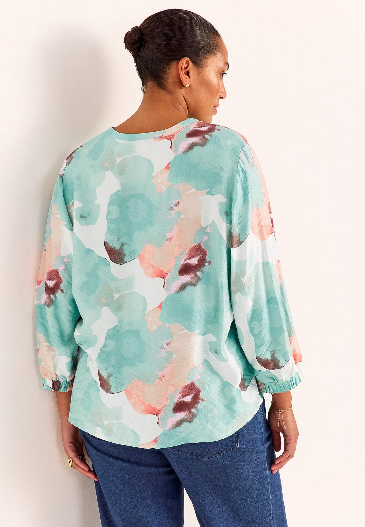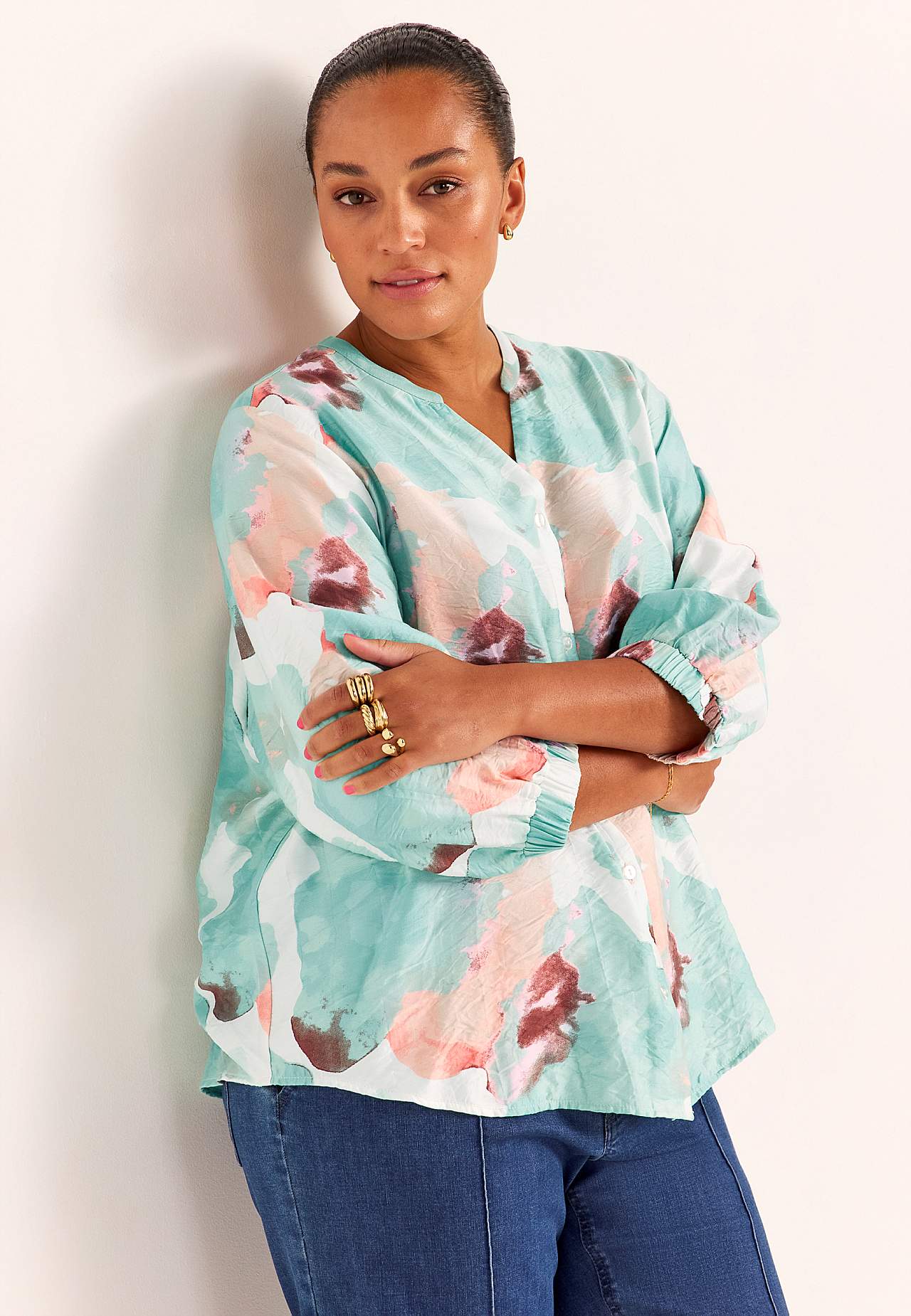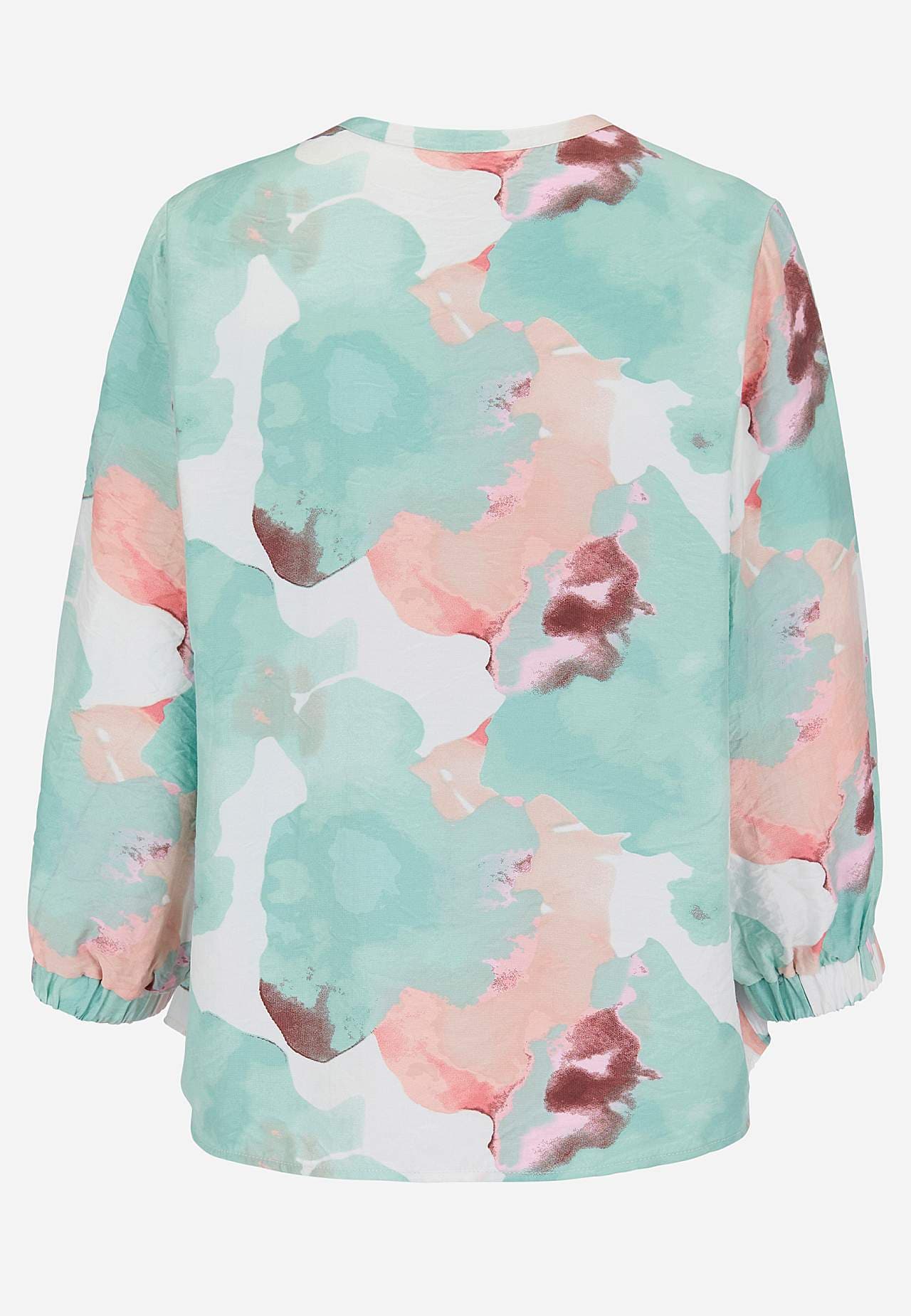 Viskoosist pluus veidi läikivamast struktureeritud kangast. Mugava lõikega ja jahe tunne. Tavasuurus. Ümar V-kaelus. Nööpkinnis viie väikese nööbiga. Kergelt kaarjas alläär. Pikkus õlast vastavalt suurusele u 62-76 cm.
