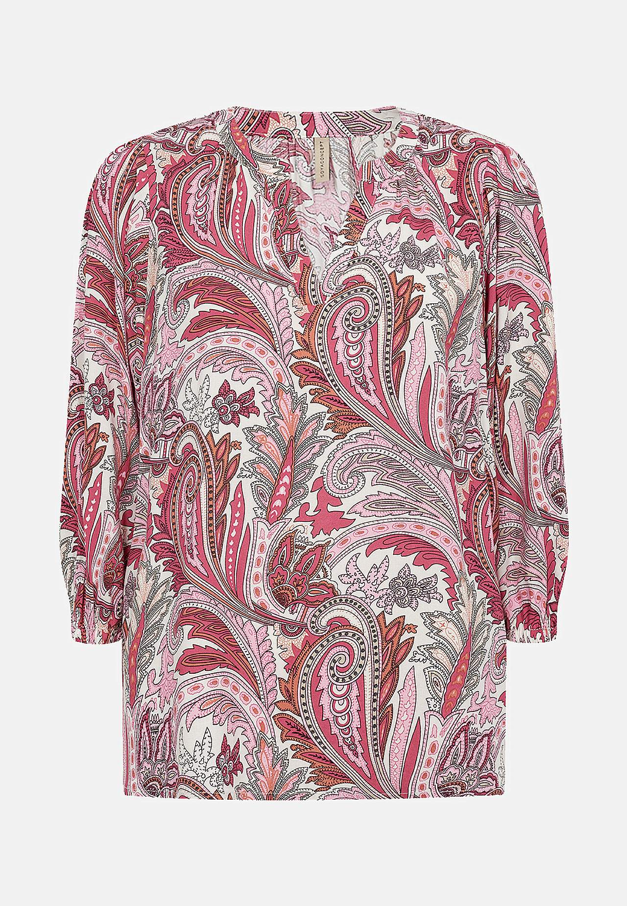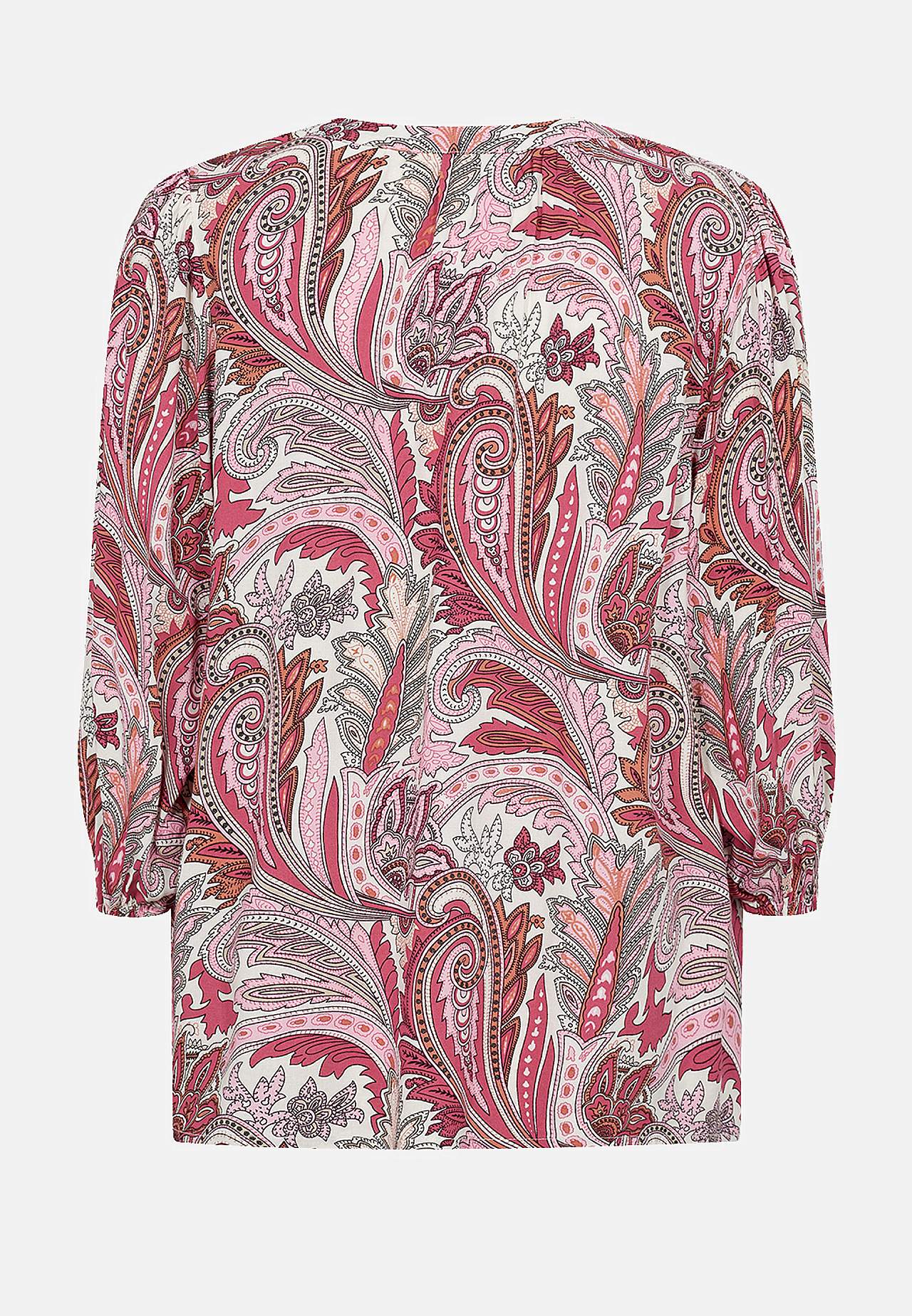 Pehmest õhemast viskooskangast pluus. Kena mustriga pehme kangas. Ümar kaelus, ees V-lõhikuga. Kolmveerandpikkuses varrukad, varrukaotstes kitsas kummiga mansett. Avaram tegumood. Pikkus õlast umbes 65 cm suurusel S (38).