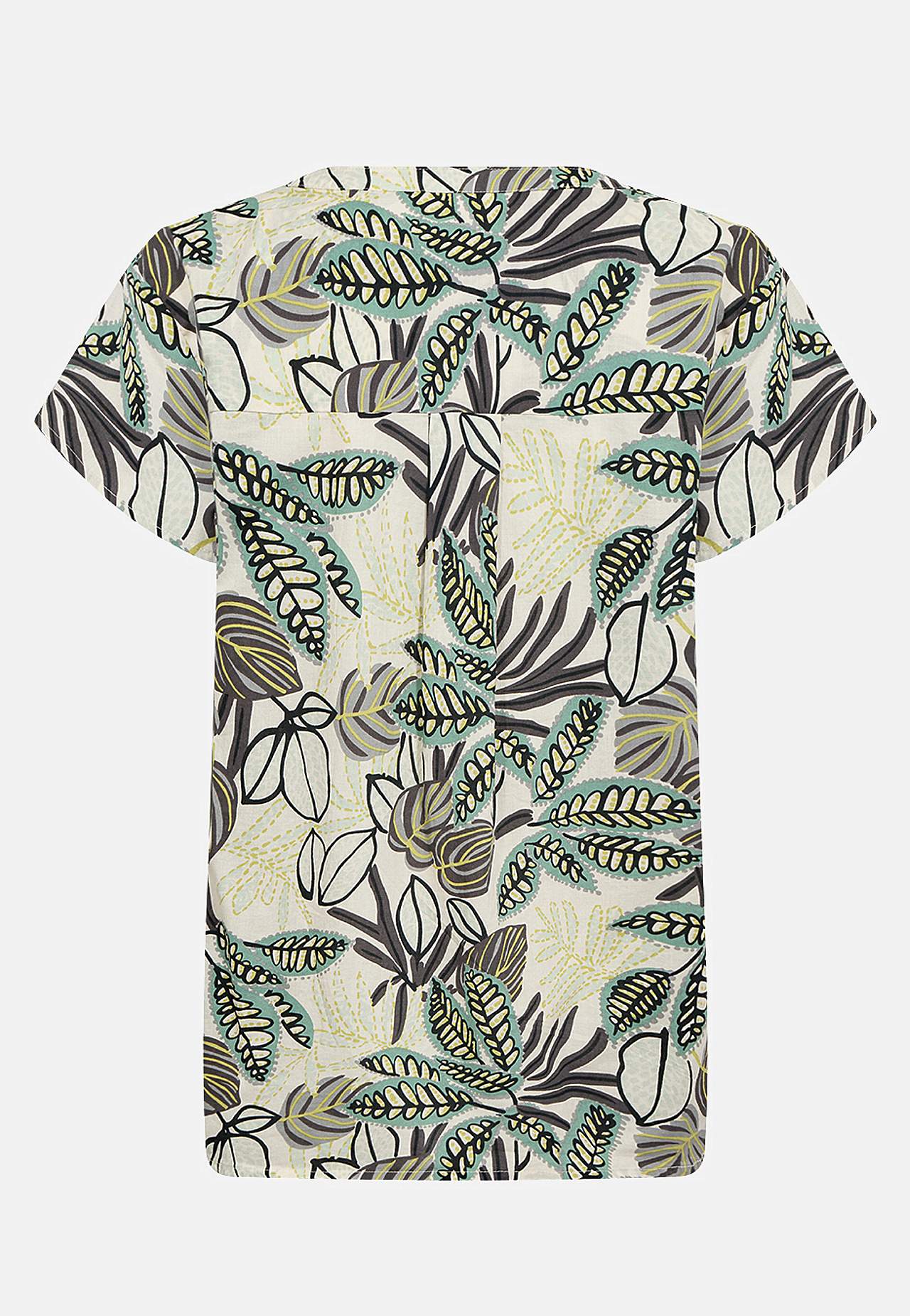 Orgaanilisest puuvillasest materjalist pluus. Pehme, õhuline, veidi õhem kangas. Tavasuurus. V-kaelus kolme nööbiga. Lühikesed varrukad. Rinna kohal sissevõtted. Taga passe kena voldiga. Eest sirge alläär. Tagant veidi pikem, kergelt kaarjas alläär. Pikkus õlast u 62 cm suurusel S (38).