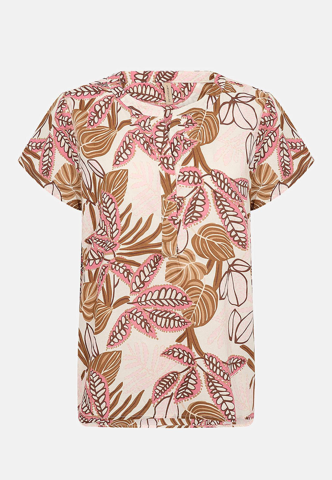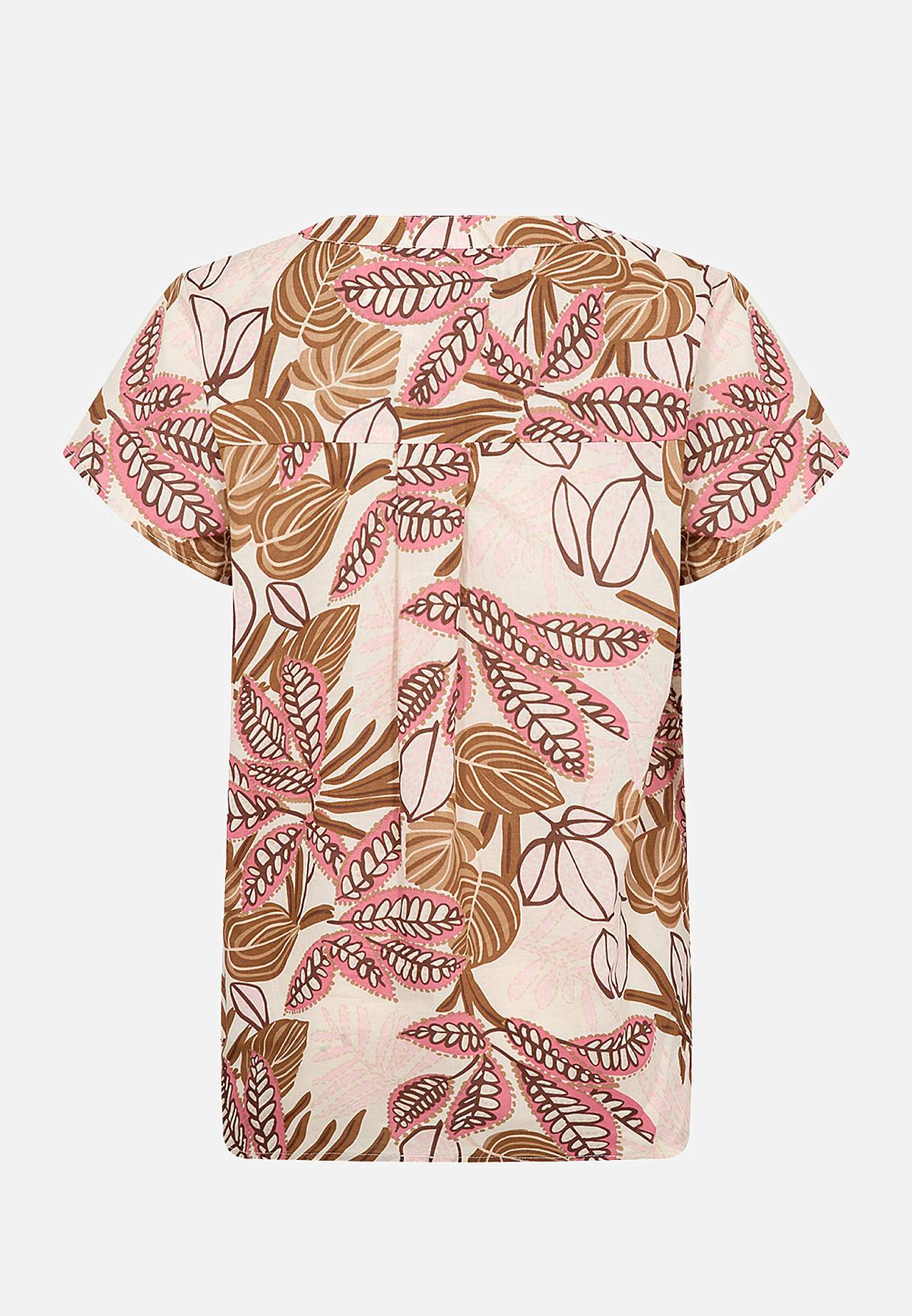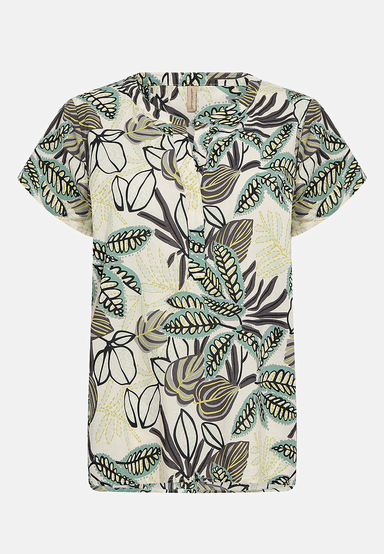 Orgaanilisest puuvillasest materjalist pluus. Pehme, õhuline, veidi õhem kangas. Tavasuurus. V-kaelus kolme nööbiga. Lühikesed varrukad. Rinna kohal sissevõtted. Taga passe kena voldiga. Eest sirge alläär. Tagant veidi pikem, kergelt kaarjas alläär. Pikkus õlast u 62 cm suurusel S (38).