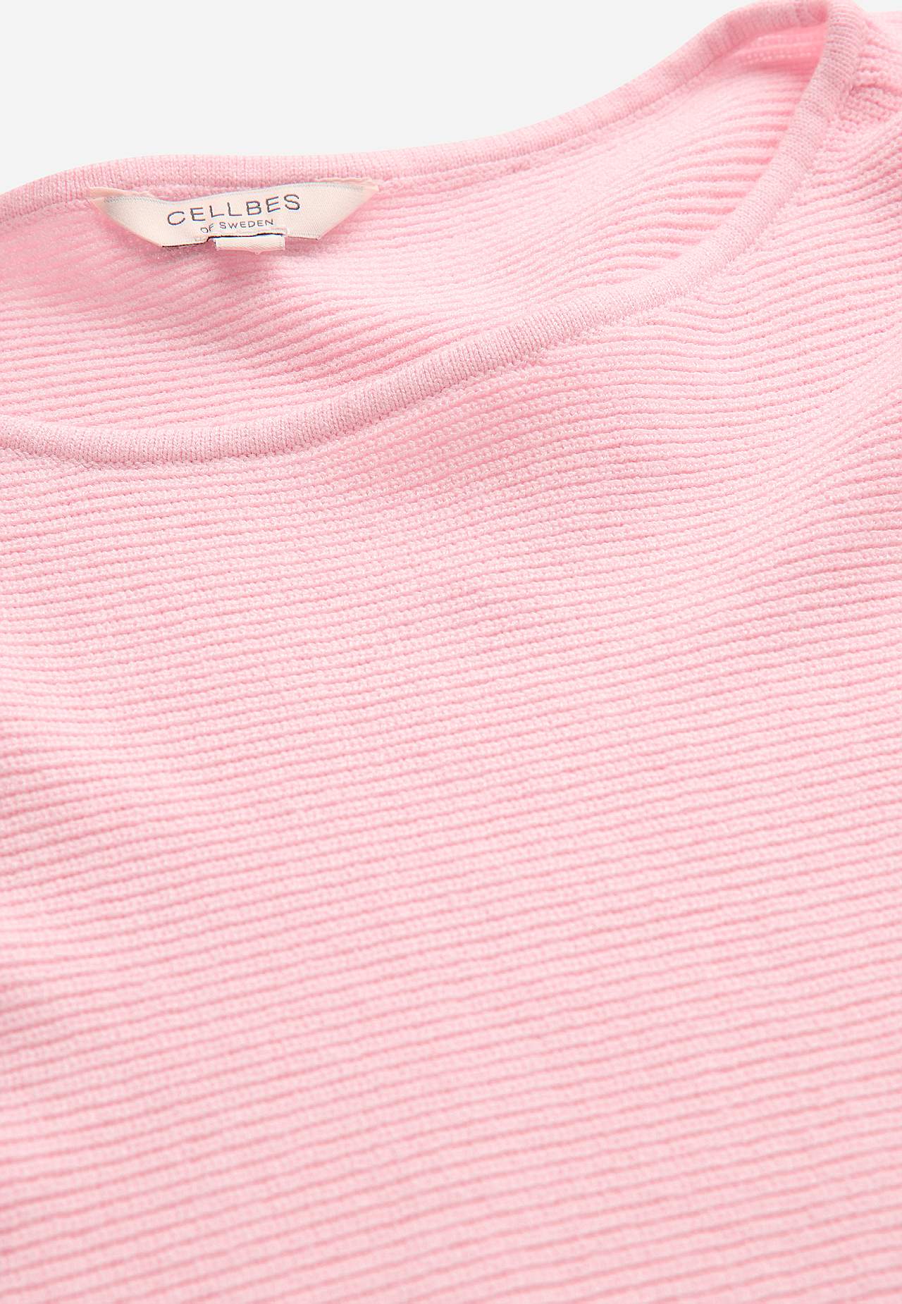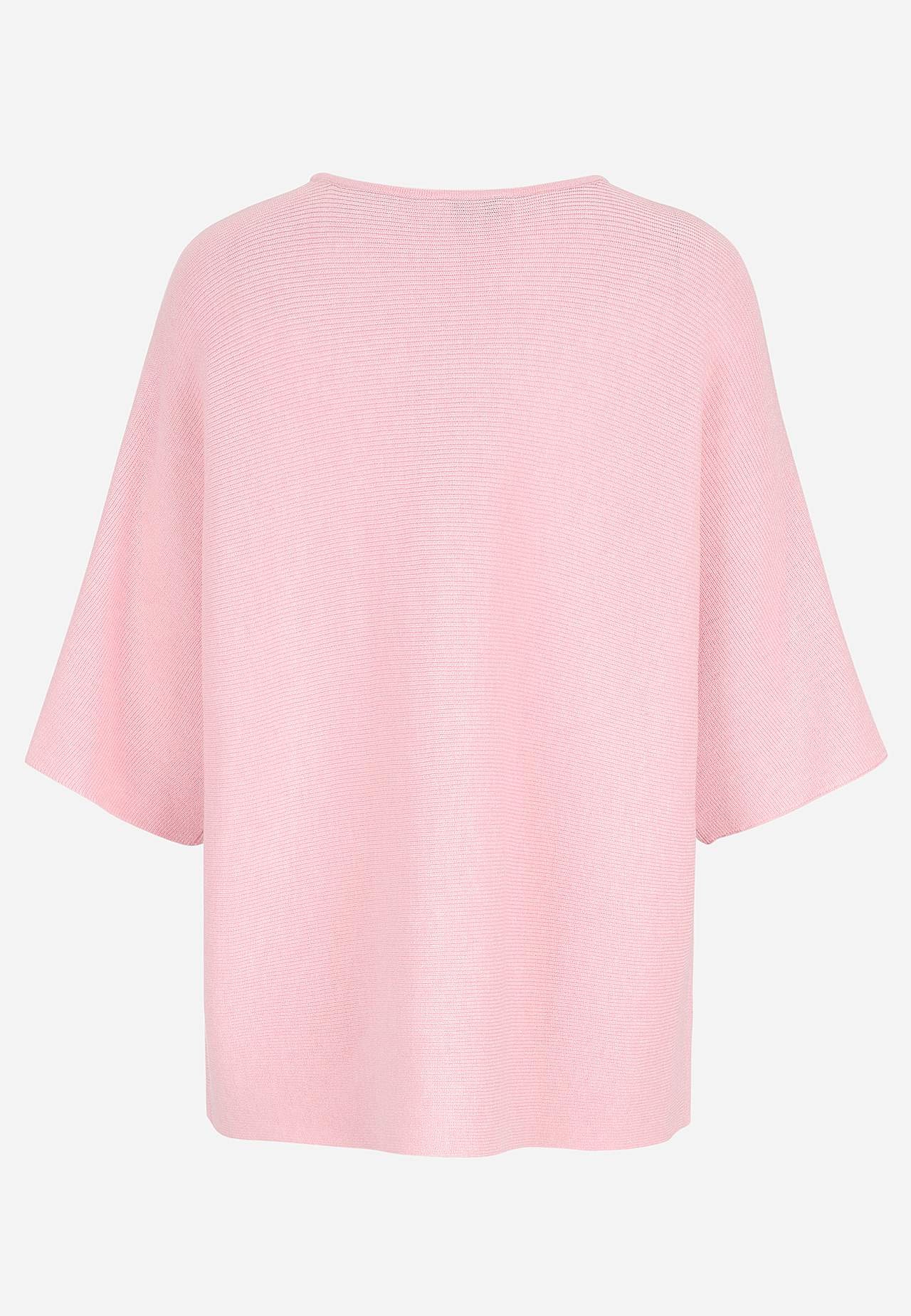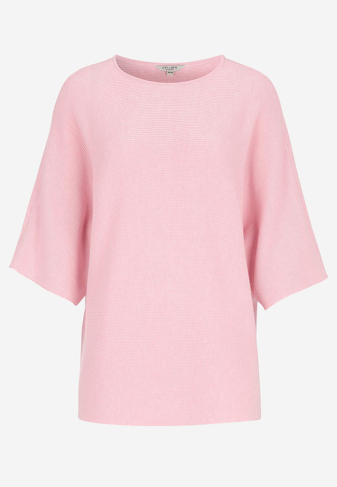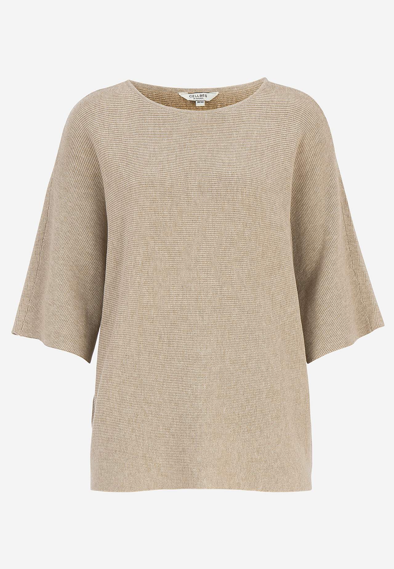 Pehme ja elastne džemper. Horisontaalse koemustriga. Avarama vabaaja lõikega. Lootsikkaelus. Kolmveerandpikkuses laiad varrukad. Pikkus õlast vastavalt suurusele u 59-66 cm.